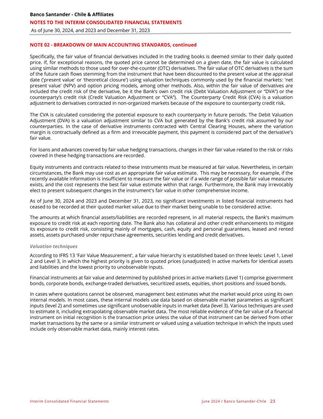 Banco Santander - Chile & Affiliates NOTES TO THE INTERIM CONSOLIDATED FINANCIAL STATEMENTS As of June 30, 2024, and 2023 and December 31, 2023 Interim Consolidated Financial Statements June 2024 / Banco Santander -Chile 23 NOTE 02 - BREAKDOWN OF MAIN ACCOUNTING STANDARDS, continued Specifically, the fair value of financial derivatives included in the trading books is deemed similar to their daily quoted price. If, for exceptional reasons, the quoted price cannot be determined on a given date, the fair value is calculated using similar methods to those used for over-the-counter (OTC) derivatives. The fair value of OTC derivatives is the sum of the future cash flows stemming from the instrument that have been discounted to the present value at the appraisal date ('present value' or 'theoretical closure') using valuation techniques commonly used by the financial markets: 'net present value' (NPV) and option pricing models, among other methods. Also, within the fair value of derivatives are included the credit risk of the derivative, be it the Bank’s own credit risk (Debt Valuation Adjustment or “DVA”) or the counterparty’s credit risk (Credit Valuation Adjustment or “CVA”). The Counterparty Credit Risk (CVA) is a valuation adjustment to derivatives contracted in non-organized markets because of the exposure to counterparty credit risk. The CVA is calculated considering the potential exposure to each counterparty in future periods. The Debit Valuation Adjustment (DVA) is a valuation adjustment similar to CVA but generated by the Bank's credit risk assumed by our counterparties. In the case of derivative instruments contracted with Central Clearing Houses, where the variation margin is contractually defined as a firm and irrevocable payment, this payment is considered part of the derivative's fair value. For loans and advances covered by fair value hedging transactions, changes in their fair value related to the risk or risks covered in these hedging transactions are recorded. Equity instruments and contracts related to these instruments must be measured at fair value. Nevertheless, in certain circumstances, the Bank may use cost as an appropriate fair value estimate. This may be necessary, for example, if the recently available information is insufficient to measure the fair value or if a wide range of possible fair value measures exists, and the cost represents the best fair value estimate within that range. Furthermore, the Bank may irrevocably elect to present subsequent changes in the instrument's fair value in other comprehensive income. As of June 30, 2024 and 2023 and December 31, 2023, no significant investments in listed financial instruments had ceased to be recorded at their quoted market value due to their market being unable to be considered active. The amounts at which financial assets/liabilities are recorded represent, in all material respects, the Bank's maximum exposure to credit risk at each reporting date. The Bank also has collateral and other credit enhancements to mitigate its exposure to credit risk, consisting mainly of mortgages, cash, equity and personal guarantees, leased and rented assets, assets purchased under repurchase agreements, securities lending and credit derivatives. Valuation techniques According to IFRS 13 'Fair Value Measurement', a fair value hierarchy is established based on three levels: Level 1, Level 2 and Level 3, in which the highest priority is given to quoted prices (unadjusted) in active markets for identical assets and liabilities and the lowest priority to unobservable inputs. Financial instruments at fair value and determined by published prices in active markets (Level 1) comprise government bonds, corporate bonds, exchange-traded derivatives, securitized assets, equities, short positions and issued bonds. In cases where quotations cannot be observed, management best estimates what the market would price using its own internal models. In most cases, these internal models use data based on observable market parameters as significant inputs (level 2) and sometimes use significant unobservable inputs in market data (level 3). Various techniques are used to estimate it, including extrapolating observable market data. The most reliable evidence of the fair value of a financial instrument on initial recognition is the transaction price unless the value of that instrument can be derived from other market transactions by the same or a similar instrument or valued using a valuation technique in which the inputs used include only observable market data, mainly interest rates.