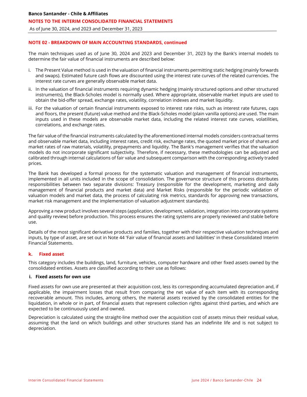Banco Santander - Chile & Affiliates NOTES TO THE INTERIM CONSOLIDATED FINANCIAL STATEMENTS As of June 30, 2024, and 2023 and December 31, 2023 Interim Consolidated Financial Statements June 2024 / Banco Santander -Chile 24 NOTE 02 - BREAKDOWN OF MAIN ACCOUNTING STANDARDS, continued The main techniques used as of June 30, 2024 and 2023 and December 31, 2023 by the Bank's internal models to determine the fair value of financial instruments are described below: i. The Present Value method is used in the valuation of financial instruments permitting static hedging (mainly forwards and swaps). Estimated future cash flows are discounted using the interest rate curves of the related currencies. The interest rate curves are generally observable market data. ii. In the valuation of financial instruments requiring dynamic hedging (mainly structured options and other structured instruments), the Black-Scholes model is normally used. Where appropriate, observable market inputs are used to obtain the bid-offer spread, exchange rates, volatility, correlation indexes and market liquidity. iii. For the valuation of certain financial instruments exposed to interest rate risks, such as interest rate futures, caps and floors, the present (future) value method and the Black-Scholes model (plain vanilla options) are used. The main inputs used in these models are observable market data, including the related interest rate curves, volatilities, correlations, and exchange rates. The fair value of the financial instruments calculated by the aforementioned internal models considers contractual terms and observable market data, including interest rates, credit risk, exchange rates, the quoted market price of shares and market rates of raw materials, volatility, prepayments and liquidity. The Bank's management verifies that the valuation models do not incorporate significant subjectivity. Therefore, if necessary, these methodologies can be adjusted and calibrated through internal calculations of fair value and subsequent comparison with the corresponding actively traded prices. The Bank has developed a formal process for the systematic valuation and management of financial instruments, implemented in all units included in the scope of consolidation. The governance structure of this process distributes responsibilities between two separate divisions: Treasury (responsible for the development, marketing and daily management of financial products and market data) and Market Risks (responsible for the periodic validation of valuation models and market data, the process of calculating risk metrics, standards for approving new transactions, market risk management and the implementation of valuation adjustment standards). Approving a new product involves several steps (application, development, validation, integration into corporate systems and quality review) before production. This process ensures the rating systems are properly reviewed and stable before use. Details of the most significant derivative products and families, together with their respective valuation techniques and inputs, by type of asset, are set out in Note 44 'Fair value of financial assets and liabilities' in these Consolidated Interim Financial Statements. k. Fixed asset This category includes the buildings, land, furniture, vehicles, computer hardware and other fixed assets owned by the consolidated entities. Assets are classified according to their use as follows: i. Fixed assets for own use Fixed assets for own use are presented at their acquisition cost, less its corresponding accumulated depreciation and, if applicable, the impairment losses that result from comparing the net value of each item with its corresponding recoverable amount. This includes, among others, the material assets received by the consolidated entities for the liquidation, in whole or in part, of financial assets that represent collection rights against third parties, and which are expected to be continuously used and owned. Depreciation is calculated using the straight-line method over the acquisition cost of assets minus their residual value, assuming that the land on which buildings and other structures stand has an indefinite life and is not subject to depreciation.