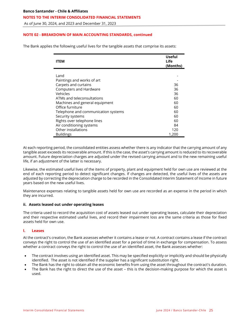 Banco Santander - Chile & Affiliates NOTES TO THE INTERIM CONSOLIDATED FINANCIAL STATEMENTS As of June 30, 2024, and 2023 and December 31, 2023 Interim Consolidated Financial Statements June 2024 / Banco Santander -Chile 25 NOTE 02 - BREAKDOWN OF MAIN ACCOUNTING STANDARDS, continued The Bank applies the following useful lives for the tangible assets that comprise its assets: At each reporting period, the consolidated entities assess whether there is any indicator that the carrying amount of any tangible asset exceeds its recoverable amount. If this is the case, the asset's carrying amount is reduced to its recoverable amount. Future depreciation charges are adjusted under the revised carrying amount and to the new remaining useful life, if an adjustment of the latter is necessary. Likewise, the estimated useful lives of the items of property, plant and equipment held for own use are reviewed at the end of each reporting period to detect significant changes. If changes are detected, the useful lives of the assets are adjusted by correcting the depreciation charge to be recorded in the Consolidated Interim Statement of Income in future years based on the new useful lives. Maintenance expenses relating to tangible assets held for own use are recorded as an expense in the period in which they are incurred. ii. Assets leased out under operating leases The criteria used to record the acquisition cost of assets leased out under operating leases, calculate their depreciation and their respective estimated useful lives, and record their impairment loss are the same criteria as those for fixed assets held for own use. l. Leases At the contract's creation, the Bank assesses whether it contains a lease or not. A contract contains a lease if the contract conveys the right to control the use of an identified asset for a period of time in exchange for compensation. To assess whether a contract conveys the right to control the use of an identified asset, the Bank assesses whether: • The contract involves using an identified asset. This may be specified explicitly or implicitly and should be physically identified. The asset is not identified if the supplier has a significant substitution right. • The Bank has the right to obtain all the economic benefits from using the asset throughout the contract's duration. • The Bank has the right to direct the use of the asset – this is the decision-making purpose for which the asset is used. ITEM Useful Life (Months) Land - Paintings and works of art - Carpets and curtains 36 Computers and Hardware 36 Vehicles 36 ATMs and teleconsultations 60 Machines and general equipment 60 Office furniture 60 Telephone and communication systems 60 Security systems 60 Rights over telephone lines 60 Air conditioning systems 84 Other installations 120 Buildings 1,200