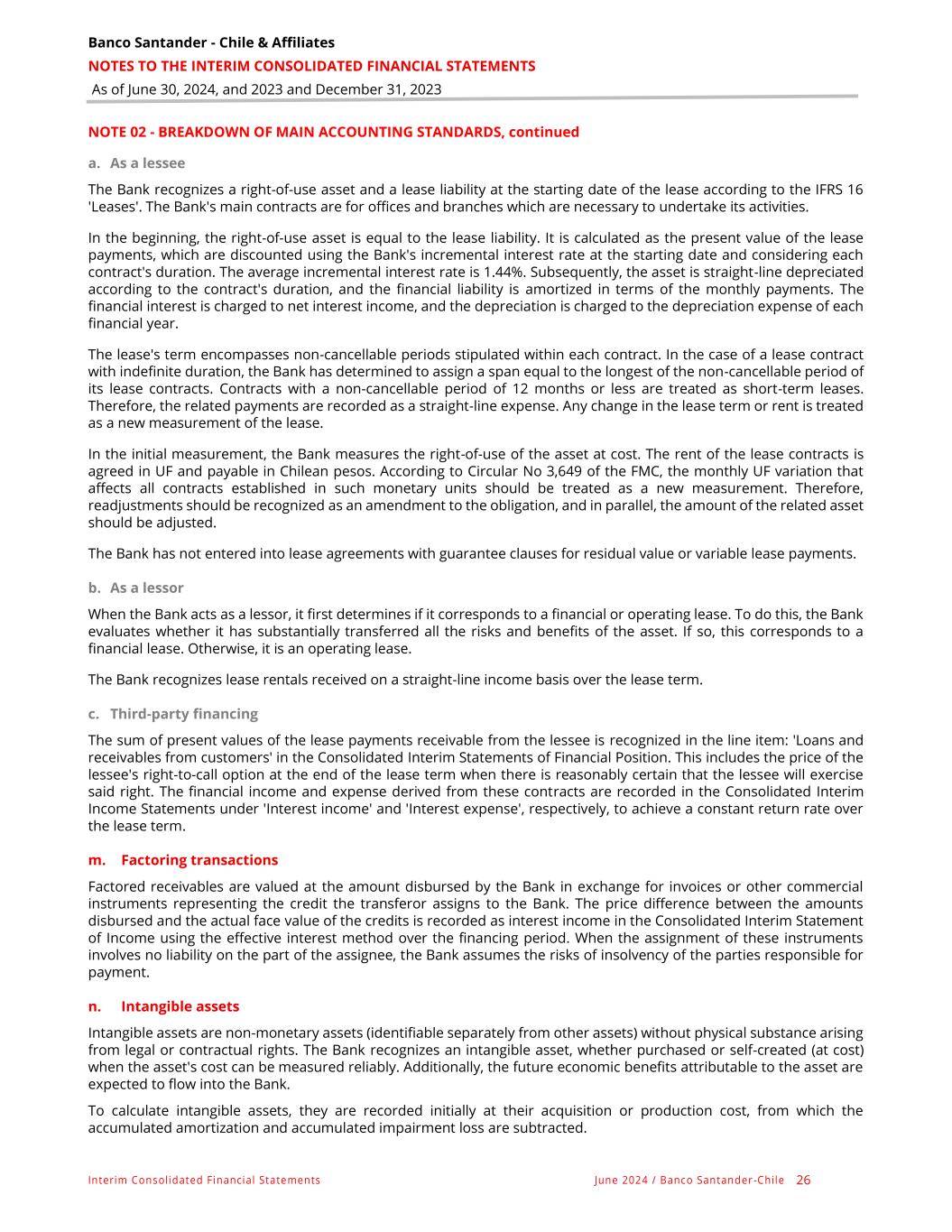 Banco Santander - Chile & Affiliates NOTES TO THE INTERIM CONSOLIDATED FINANCIAL STATEMENTS As of June 30, 2024, and 2023 and December 31, 2023 Interim Consolidated Financial Statements June 2024 / Banco Santander -Chile 26 NOTE 02 - BREAKDOWN OF MAIN ACCOUNTING STANDARDS, continued a. As a lessee The Bank recognizes a right-of-use asset and a lease liability at the starting date of the lease according to the IFRS 16 'Leases'. The Bank's main contracts are for offices and branches which are necessary to undertake its activities. In the beginning, the right-of-use asset is equal to the lease liability. It is calculated as the present value of the lease payments, which are discounted using the Bank's incremental interest rate at the starting date and considering each contract's duration. The average incremental interest rate is 1.44%. Subsequently, the asset is straight-line depreciated according to the contract's duration, and the financial liability is amortized in terms of the monthly payments. The financial interest is charged to net interest income, and the depreciation is charged to the depreciation expense of each financial year. The lease's term encompasses non-cancellable periods stipulated within each contract. In the case of a lease contract with indefinite duration, the Bank has determined to assign a span equal to the longest of the non-cancellable period of its lease contracts. Contracts with a non-cancellable period of 12 months or less are treated as short-term leases. Therefore, the related payments are recorded as a straight-line expense. Any change in the lease term or rent is treated as a new measurement of the lease. In the initial measurement, the Bank measures the right-of-use of the asset at cost. The rent of the lease contracts is agreed in UF and payable in Chilean pesos. According to Circular No 3,649 of the FMC, the monthly UF variation that affects all contracts established in such monetary units should be treated as a new measurement. Therefore, readjustments should be recognized as an amendment to the obligation, and in parallel, the amount of the related asset should be adjusted. The Bank has not entered into lease agreements with guarantee clauses for residual value or variable lease payments. b. As a lessor When the Bank acts as a lessor, it first determines if it corresponds to a financial or operating lease. To do this, the Bank evaluates whether it has substantially transferred all the risks and benefits of the asset. If so, this corresponds to a financial lease. Otherwise, it is an operating lease. The Bank recognizes lease rentals received on a straight-line income basis over the lease term. c. Third-party financing The sum of present values of the lease payments receivable from the lessee is recognized in the line item: 'Loans and receivables from customers' in the Consolidated Interim Statements of Financial Position. This includes the price of the lessee's right-to-call option at the end of the lease term when there is reasonably certain that the lessee will exercise said right. The financial income and expense derived from these contracts are recorded in the Consolidated Interim Income Statements under 'Interest income' and 'Interest expense', respectively, to achieve a constant return rate over the lease term. m. Factoring transactions Factored receivables are valued at the amount disbursed by the Bank in exchange for invoices or other commercial instruments representing the credit the transferor assigns to the Bank. The price difference between the amounts disbursed and the actual face value of the credits is recorded as interest income in the Consolidated Interim Statement of Income using the effective interest method over the financing period. When the assignment of these instruments involves no liability on the part of the assignee, the Bank assumes the risks of insolvency of the parties responsible for payment. n. Intangible assets Intangible assets are non-monetary assets (identifiable separately from other assets) without physical substance arising from legal or contractual rights. The Bank recognizes an intangible asset, whether purchased or self-created (at cost) when the asset's cost can be measured reliably. Additionally, the future economic benefits attributable to the asset are expected to flow into the Bank. To calculate intangible assets, they are recorded initially at their acquisition or production cost, from which the accumulated amortization and accumulated impairment loss are subtracted.