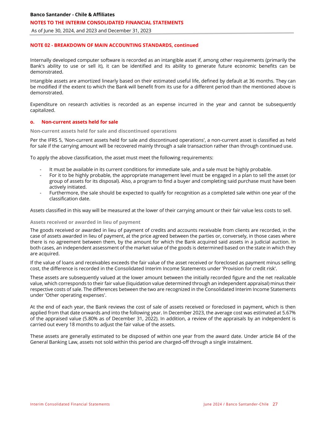 Banco Santander - Chile & Affiliates NOTES TO THE INTERIM CONSOLIDATED FINANCIAL STATEMENTS As of June 30, 2024, and 2023 and December 31, 2023 Interim Consolidated Financial Statements June 2024 / Banco Santander -Chile 27 NOTE 02 - BREAKDOWN OF MAIN ACCOUNTING STANDARDS, continued Internally developed computer software is recorded as an intangible asset if, among other requirements (primarily the Bank's ability to use or sell it), it can be identified and its ability to generate future economic benefits can be demonstrated. Intangible assets are amortized linearly based on their estimated useful life, defined by default at 36 months. They can be modified if the extent to which the Bank will benefit from its use for a different period than the mentioned above is demonstrated. Expenditure on research activities is recorded as an expense incurred in the year and cannot be subsequently capitalized. o. Non-current assets held for sale Non-current assets held for sale and discontinued operations Per the IFRS 5, 'Non-current assets held for sale and discontinued operations', a non-current asset is classified as held for sale if the carrying amount will be recovered mainly through a sale transaction rather than through continued use. To apply the above classification, the asset must meet the following requirements: - It must be available in its current conditions for immediate sale, and a sale must be highly probable. - For it to be highly probable, the appropriate management level must be engaged in a plan to sell the asset (or group of assets for its disposal). Also, a program to find a buyer and completing said purchase must have been actively initiated. - Furthermore, the sale should be expected to qualify for recognition as a completed sale within one year of the classification date. Assets classified in this way will be measured at the lower of their carrying amount or their fair value less costs to sell. Assets received or awarded in lieu of payment The goods received or awarded in lieu of payment of credits and accounts receivable from clients are recorded, in the case of assets awarded in lieu of payment, at the price agreed between the parties or, conversely, in those cases where there is no agreement between them, by the amount for which the Bank acquired said assets in a judicial auction. In both cases, an independent assessment of the market value of the goods is determined based on the state in which they are acquired. If the value of loans and receivables exceeds the fair value of the asset received or foreclosed as payment minus selling cost, the difference is recorded in the Consolidated Interim Income Statements under 'Provision for credit risk'. These assets are subsequently valued at the lower amount between the initially recorded figure and the net realizable value, which corresponds to their fair value (liquidation value determined through an independent appraisal) minus their respective costs of sale. The differences between the two are recognized in the Consolidated Interim Income Statements under 'Other operating expenses'. At the end of each year, the Bank reviews the cost of sale of assets received or foreclosed in payment, which is then applied from that date onwards and into the following year. In December 2023, the average cost was estimated at 5.67% of the appraised value (5.80% as of December 31, 2022). In addition, a review of the appraisals by an independent is carried out every 18 months to adjust the fair value of the assets. These assets are generally estimated to be disposed of within one year from the award date. Under article 84 of the General Banking Law, assets not sold within this period are charged-off through a single instalment.