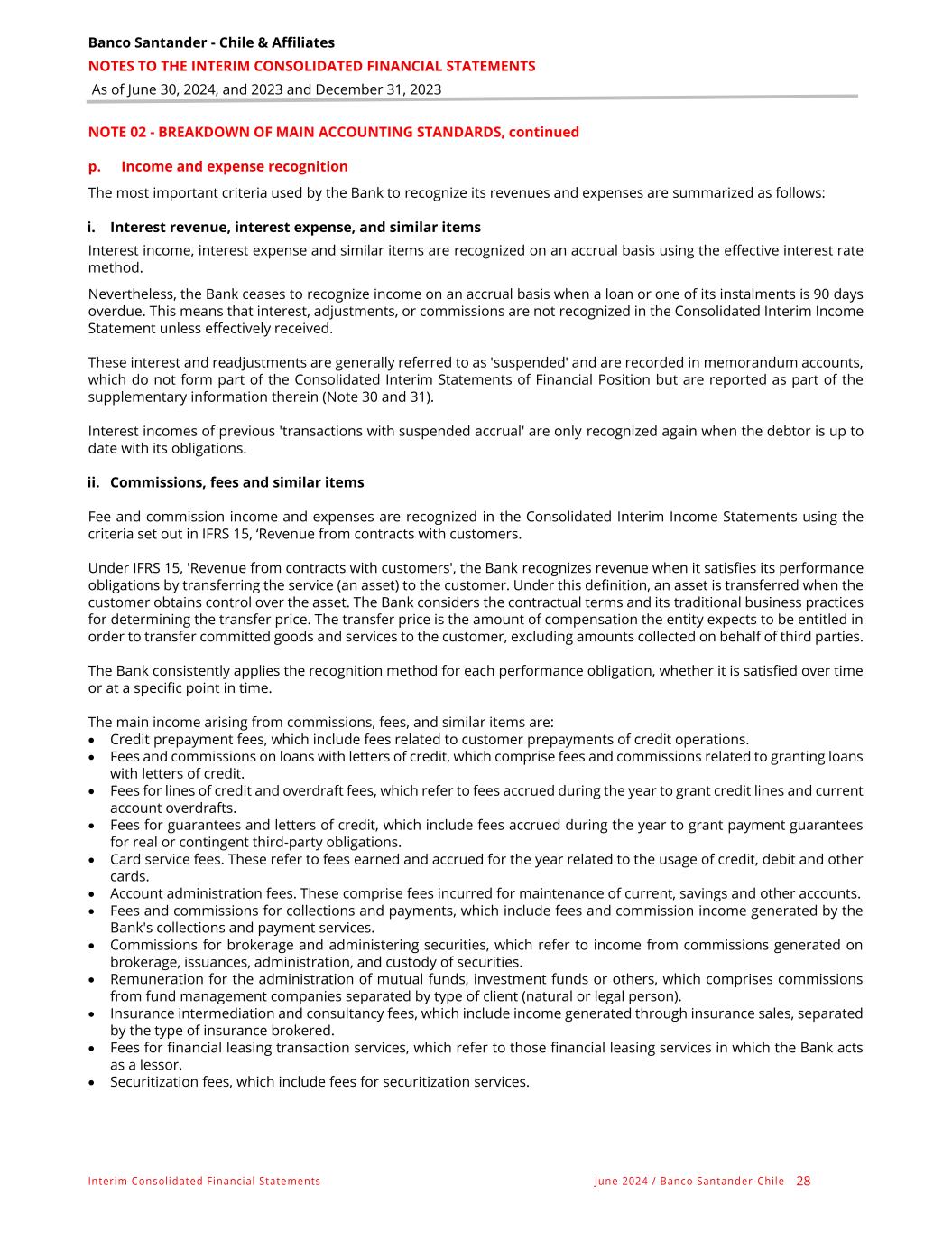 Banco Santander - Chile & Affiliates NOTES TO THE INTERIM CONSOLIDATED FINANCIAL STATEMENTS As of June 30, 2024, and 2023 and December 31, 2023 Interim Consolidated Financial Statements June 2024 / Banco Santander -Chile 28 NOTE 02 - BREAKDOWN OF MAIN ACCOUNTING STANDARDS, continued p. Income and expense recognition The most important criteria used by the Bank to recognize its revenues and expenses are summarized as follows: i. Interest revenue, interest expense, and similar items Interest income, interest expense and similar items are recognized on an accrual basis using the effective interest rate method. Nevertheless, the Bank ceases to recognize income on an accrual basis when a loan or one of its instalments is 90 days overdue. This means that interest, adjustments, or commissions are not recognized in the Consolidated Interim Income Statement unless effectively received. These interest and readjustments are generally referred to as 'suspended' and are recorded in memorandum accounts, which do not form part of the Consolidated Interim Statements of Financial Position but are reported as part of the supplementary information therein (Note 30 and 31). Interest incomes of previous 'transactions with suspended accrual' are only recognized again when the debtor is up to date with its obligations. ii. Commissions, fees and similar items Fee and commission income and expenses are recognized in the Consolidated Interim Income Statements using the criteria set out in IFRS 15, ‘Revenue from contracts with customers. Under IFRS 15, 'Revenue from contracts with customers', the Bank recognizes revenue when it satisfies its performance obligations by transferring the service (an asset) to the customer. Under this definition, an asset is transferred when the customer obtains control over the asset. The Bank considers the contractual terms and its traditional business practices for determining the transfer price. The transfer price is the amount of compensation the entity expects to be entitled in order to transfer committed goods and services to the customer, excluding amounts collected on behalf of third parties. The Bank consistently applies the recognition method for each performance obligation, whether it is satisfied over time or at a specific point in time. The main income arising from commissions, fees, and similar items are: • Credit prepayment fees, which include fees related to customer prepayments of credit operations. • Fees and commissions on loans with letters of credit, which comprise fees and commissions related to granting loans with letters of credit. • Fees for lines of credit and overdraft fees, which refer to fees accrued during the year to grant credit lines and current account overdrafts. • Fees for guarantees and letters of credit, which include fees accrued during the year to grant payment guarantees for real or contingent third-party obligations. • Card service fees. These refer to fees earned and accrued for the year related to the usage of credit, debit and other cards. • Account administration fees. These comprise fees incurred for maintenance of current, savings and other accounts. • Fees and commissions for collections and payments, which include fees and commission income generated by the Bank's collections and payment services. • Commissions for brokerage and administering securities, which refer to income from commissions generated on brokerage, issuances, administration, and custody of securities. • Remuneration for the administration of mutual funds, investment funds or others, which comprises commissions from fund management companies separated by type of client (natural or legal person). • Insurance intermediation and consultancy fees, which include income generated through insurance sales, separated by the type of insurance brokered. • Fees for financial leasing transaction services, which refer to those financial leasing services in which the Bank acts as a lessor. • Securitization fees, which include fees for securitization services.