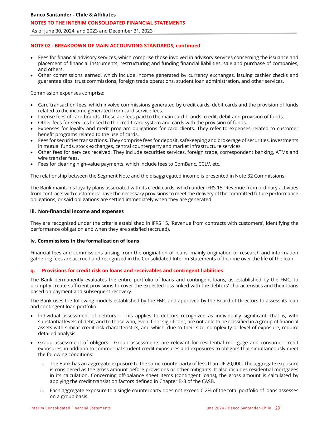 Banco Santander - Chile & Affiliates NOTES TO THE INTERIM CONSOLIDATED FINANCIAL STATEMENTS As of June 30, 2024, and 2023 and December 31, 2023 Interim Consolidated Financial Statements June 2024 / Banco Santander -Chile 29 NOTE 02 - BREAKDOWN OF MAIN ACCOUNTING STANDARDS, continued • Fees for financial advisory services, which comprise those involved in advisory services concerning the issuance and placement of financial instruments, restructuring and funding financial liabilities, sale and purchase of companies, and others. • Other commissions earned, which include income generated by currency exchanges, issuing cashier checks and guarantee slips, trust commissions, foreign trade operations, student loan administration, and other services. Commission expenses comprise: • Card transaction fees, which involve commissions generated by credit cards, debit cards and the provision of funds related to the income generated from card service fees. • License fees of card brands. These are fees paid to the main card brands: credit, debit and provision of funds. • Other fees for services linked to the credit card system and cards with the provision of funds. • Expenses for loyalty and merit program obligations for card clients. They refer to expenses related to customer benefit programs related to the use of cards. • Fees for securities transactions. They comprise fees for deposit, safekeeping and brokerage of securities, investments in mutual funds, stock exchanges, central counterparty and market infrastructure services. • Other fees for services received. They include securities services, foreign trade, correspondent banking, ATMs and wire transfer fees. • Fees for clearing high-value payments, which include fees to ComBanc, CCLV, etc. The relationship between the Segment Note and the disaggregated income is presented in Note 32 Commissions. The Bank maintains loyalty plans associated with its credit cards, which under IFRS 15 “Revenue from ordinary activities from contracts with customers” have the necessary provisions to meet the delivery of the committed future performance obligations, or said obligations are settled immediately when they are generated. iii. Non-financial income and expenses They are recognized under the criteria established in IFRS 15, 'Revenue from contracts with customers', identifying the performance obligation and when they are satisfied (accrued). iv. Commissions in the formalization of loans Financial fees and commissions arising from the origination of loans, mainly origination or research and information gathering fees are accrued and recognized in the Consolidated Interim Statements of Income over the life of the loan. q. Provisions for credit risk on loans and receivables and contingent liabilities The Bank permanently evaluates the entire portfolio of loans and contingent loans, as established by the FMC, to promptly create sufficient provisions to cover the expected loss linked with the debtors' characteristics and their loans based on payment and subsequent recovery. The Bank uses the following models established by the FMC and approved by the Board of Directors to assess its loan and contingent loan portfolio: • Individual assessment of debtors – This applies to debtors recognized as individually significant, that is, with substantial levels of debt, and to those who, even if not significant, are not able to be classified in a group of financial assets with similar credit risk characteristics, and which, due to their size, complexity or level of exposure, require detailed analysis. • Group assessment of obligors - Group assessments are relevant for residential mortgage and consumer credit exposures, in addition to commercial student credit exposures and exposures to obligors that simultaneously meet the following conditions: i. The Bank has an aggregate exposure to the same counterparty of less than UF 20,000. The aggregate exposure is considered as the gross amount before provisions or other mitigants. It also includes residential mortgages in its calculation. Concerning off-balance sheet items (contingent loans), the gross amount is calculated by applying the credit translation factors defined in Chapter B-3 of the CASB. ii. Each aggregate exposure to a single counterparty does not exceed 0.2% of the total portfolio of loans assesses on a group basis.