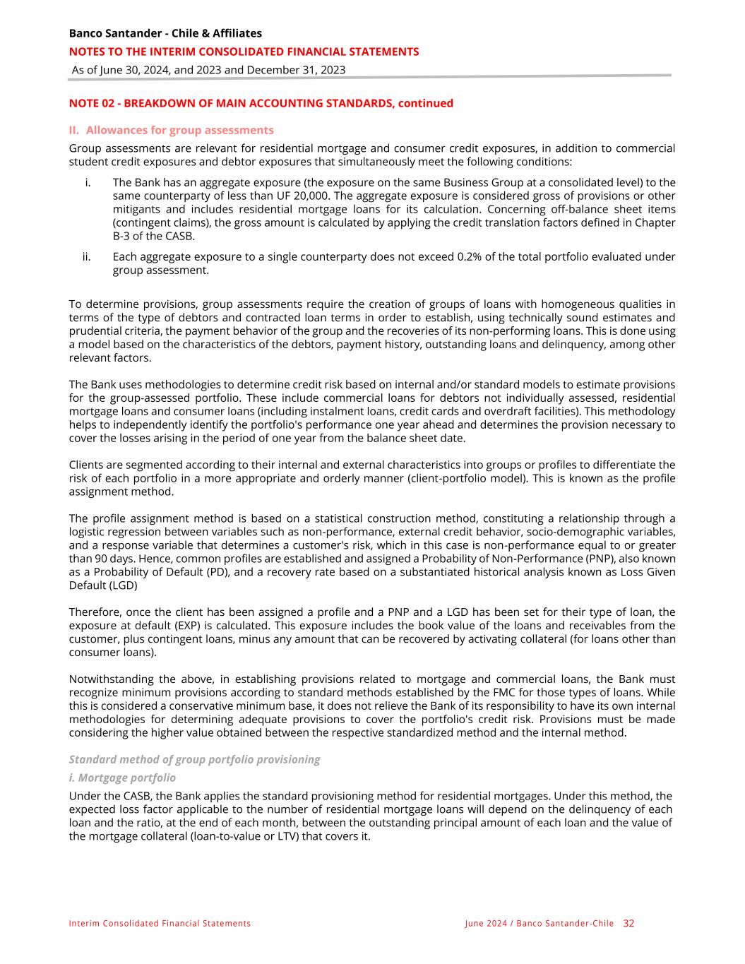 Banco Santander - Chile & Affiliates NOTES TO THE INTERIM CONSOLIDATED FINANCIAL STATEMENTS As of June 30, 2024, and 2023 and December 31, 2023 Interim Consolidated Financial Statements June 2024 / Banco Santander -Chile 32 NOTE 02 - BREAKDOWN OF MAIN ACCOUNTING STANDARDS, continued II. Allowances for group assessments Group assessments are relevant for residential mortgage and consumer credit exposures, in addition to commercial student credit exposures and debtor exposures that simultaneously meet the following conditions: i. The Bank has an aggregate exposure (the exposure on the same Business Group at a consolidated level) to the same counterparty of less than UF 20,000. The aggregate exposure is considered gross of provisions or other mitigants and includes residential mortgage loans for its calculation. Concerning off-balance sheet items (contingent claims), the gross amount is calculated by applying the credit translation factors defined in Chapter B-3 of the CASB. ii. Each aggregate exposure to a single counterparty does not exceed 0.2% of the total portfolio evaluated under group assessment. To determine provisions, group assessments require the creation of groups of loans with homogeneous qualities in terms of the type of debtors and contracted loan terms in order to establish, using technically sound estimates and prudential criteria, the payment behavior of the group and the recoveries of its non-performing loans. This is done using a model based on the characteristics of the debtors, payment history, outstanding loans and delinquency, among other relevant factors. The Bank uses methodologies to determine credit risk based on internal and/or standard models to estimate provisions for the group-assessed portfolio. These include commercial loans for debtors not individually assessed, residential mortgage loans and consumer loans (including instalment loans, credit cards and overdraft facilities). This methodology helps to independently identify the portfolio's performance one year ahead and determines the provision necessary to cover the losses arising in the period of one year from the balance sheet date. Clients are segmented according to their internal and external characteristics into groups or profiles to differentiate the risk of each portfolio in a more appropriate and orderly manner (client-portfolio model). This is known as the profile assignment method. The profile assignment method is based on a statistical construction method, constituting a relationship through a logistic regression between variables such as non-performance, external credit behavior, socio-demographic variables, and a response variable that determines a customer's risk, which in this case is non-performance equal to or greater than 90 days. Hence, common profiles are established and assigned a Probability of Non-Performance (PNP), also known as a Probability of Default (PD), and a recovery rate based on a substantiated historical analysis known as Loss Given Default (LGD) Therefore, once the client has been assigned a profile and a PNP and a LGD has been set for their type of loan, the exposure at default (EXP) is calculated. This exposure includes the book value of the loans and receivables from the customer, plus contingent loans, minus any amount that can be recovered by activating collateral (for loans other than consumer loans). Notwithstanding the above, in establishing provisions related to mortgage and commercial loans, the Bank must recognize minimum provisions according to standard methods established by the FMC for those types of loans. While this is considered a conservative minimum base, it does not relieve the Bank of its responsibility to have its own internal methodologies for determining adequate provisions to cover the portfolio's credit risk. Provisions must be made considering the higher value obtained between the respective standardized method and the internal method. Standard method of group portfolio provisioning i. Mortgage portfolio Under the CASB, the Bank applies the standard provisioning method for residential mortgages. Under this method, the expected loss factor applicable to the number of residential mortgage loans will depend on the delinquency of each loan and the ratio, at the end of each month, between the outstanding principal amount of each loan and the value of the mortgage collateral (loan-to-value or LTV) that covers it.