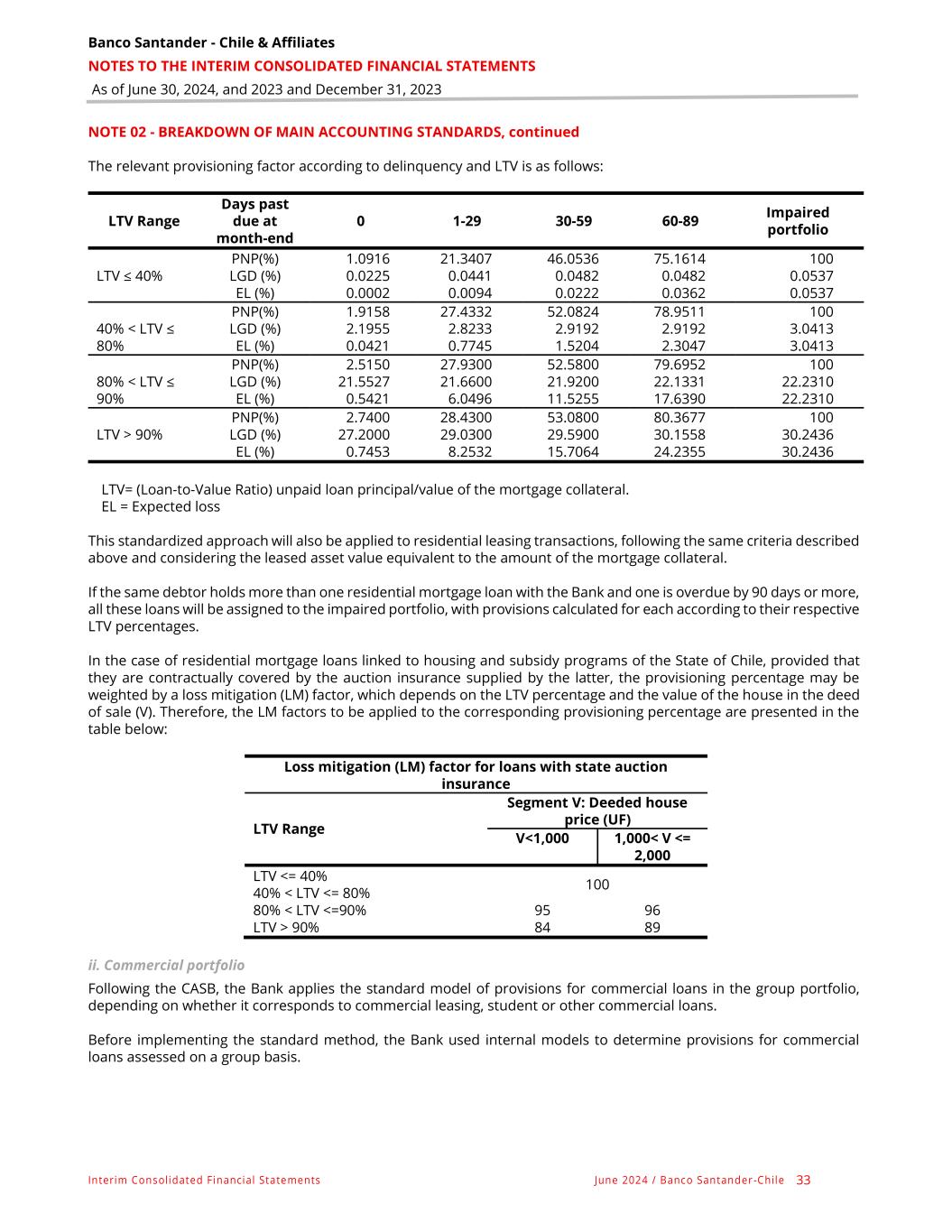 Banco Santander - Chile & Affiliates NOTES TO THE INTERIM CONSOLIDATED FINANCIAL STATEMENTS As of June 30, 2024, and 2023 and December 31, 2023 Interim Consolidated Financial Statements June 2024 / Banco Santander -Chile 33 NOTE 02 - BREAKDOWN OF MAIN ACCOUNTING STANDARDS, continued The relevant provisioning factor according to delinquency and LTV is as follows: LTV Range Days past due at month-end 0 1-29 30-59 60-89 Impaired portfolio LTV ≤ 40% PNP(%) 1.0916 21.3407 46.0536 75.1614 100 LGD (%) 0.0225 0.0441 0.0482 0.0482 0.0537 EL (%) 0.0002 0.0094 0.0222 0.0362 0.0537 40% < LTV ≤ 80% PNP(%) 1.9158 27.4332 52.0824 78.9511 100 LGD (%) 2.1955 2.8233 2.9192 2.9192 3.0413 EL (%) 0.0421 0.7745 1.5204 2.3047 3.0413 80% < LTV ≤ 90% PNP(%) 2.5150 27.9300 52.5800 79.6952 100 LGD (%) 21.5527 21.6600 21.9200 22.1331 22.2310 EL (%) 0.5421 6.0496 11.5255 17.6390 22.2310 LTV > 90% PNP(%) 2.7400 28.4300 53.0800 80.3677 100 LGD (%) 27.2000 29.0300 29.5900 30.1558 30.2436 EL (%) 0.7453 8.2532 15.7064 24.2355 30.2436 LTV= (Loan-to-Value Ratio) unpaid loan principal/value of the mortgage collateral. EL = Expected loss This standardized approach will also be applied to residential leasing transactions, following the same criteria described above and considering the leased asset value equivalent to the amount of the mortgage collateral. If the same debtor holds more than one residential mortgage loan with the Bank and one is overdue by 90 days or more, all these loans will be assigned to the impaired portfolio, with provisions calculated for each according to their respective LTV percentages. In the case of residential mortgage loans linked to housing and subsidy programs of the State of Chile, provided that they are contractually covered by the auction insurance supplied by the latter, the provisioning percentage may be weighted by a loss mitigation (LM) factor, which depends on the LTV percentage and the value of the house in the deed of sale (V). Therefore, the LM factors to be applied to the corresponding provisioning percentage are presented in the table below: Loss mitigation (LM) factor for loans with state auction insurance LTV Range Segment V: Deeded house price (UF) V<1,000 1,000< V <= 2,000 LTV <= 40% 100 40% < LTV <= 80% 80% < LTV <=90% 95 96 LTV > 90% 84 89 ii. Commercial portfolio Following the CASB, the Bank applies the standard model of provisions for commercial loans in the group portfolio, depending on whether it corresponds to commercial leasing, student or other commercial loans. Before implementing the standard method, the Bank used internal models to determine provisions for commercial loans assessed on a group basis.