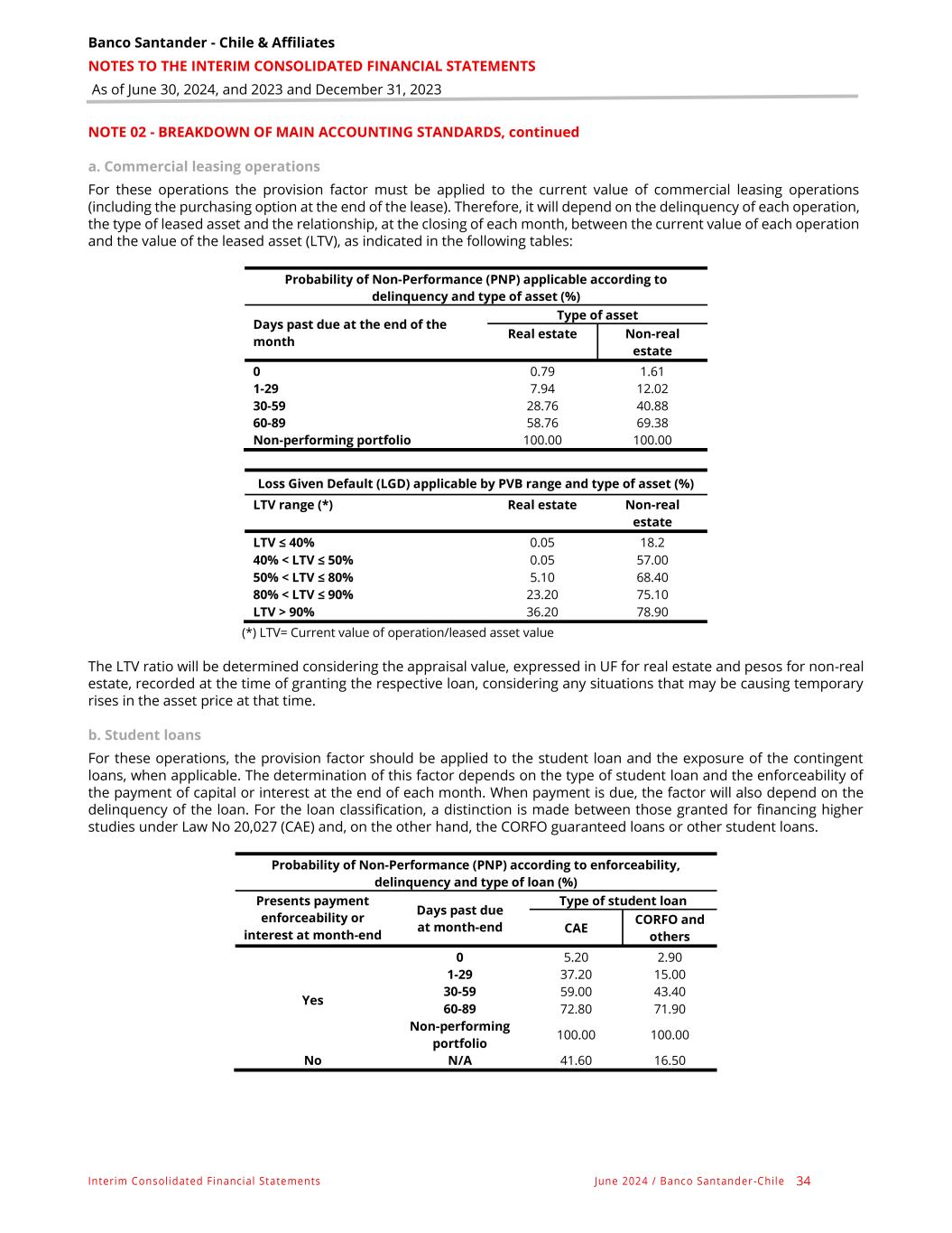 Banco Santander - Chile & Affiliates NOTES TO THE INTERIM CONSOLIDATED FINANCIAL STATEMENTS As of June 30, 2024, and 2023 and December 31, 2023 Interim Consolidated Financial Statements June 2024 / Banco Santander -Chile 34 NOTE 02 - BREAKDOWN OF MAIN ACCOUNTING STANDARDS, continued a. Commercial leasing operations For these operations the provision factor must be applied to the current value of commercial leasing operations (including the purchasing option at the end of the lease). Therefore, it will depend on the delinquency of each operation, the type of leased asset and the relationship, at the closing of each month, between the current value of each operation and the value of the leased asset (LTV), as indicated in the following tables: Probability of Non-Performance (PNP) applicable according to delinquency and type of asset (%) Days past due at the end of the month Type of asset Real estate Non-real estate 0 0.79 1.61 1-29 7.94 12.02 30-59 28.76 40.88 60-89 58.76 69.38 Non-performing portfolio 100.00 100.00 Loss Given Default (LGD) applicable by PVB range and type of asset (%) LTV range (*) Real estate Non-real estate LTV ≤ 40% 0.05 18.2 40% < LTV ≤ 50% 0.05 57.00 50% < LTV ≤ 80% 5.10 68.40 80% < LTV ≤ 90% 23.20 75.10 LTV > 90% 36.20 78.90 (*) LTV= Current value of operation/leased asset value The LTV ratio will be determined considering the appraisal value, expressed in UF for real estate and pesos for non-real estate, recorded at the time of granting the respective loan, considering any situations that may be causing temporary rises in the asset price at that time. b. Student loans For these operations, the provision factor should be applied to the student loan and the exposure of the contingent loans, when applicable. The determination of this factor depends on the type of student loan and the enforceability of the payment of capital or interest at the end of each month. When payment is due, the factor will also depend on the delinquency of the loan. For the loan classification, a distinction is made between those granted for financing higher studies under Law No 20,027 (CAE) and, on the other hand, the CORFO guaranteed loans or other student loans. Probability of Non-Performance (PNP) according to enforceability, delinquency and type of loan (%) Presents payment enforceability or interest at month-end Days past due at month-end Type of student loan CAE CORFO and others Yes 0 5.20 2.90 1-29 37.20 15.00 30-59 59.00 43.40 60-89 72.80 71.90 Non-performing portfolio 100.00 100.00 No N/A 41.60 16.50