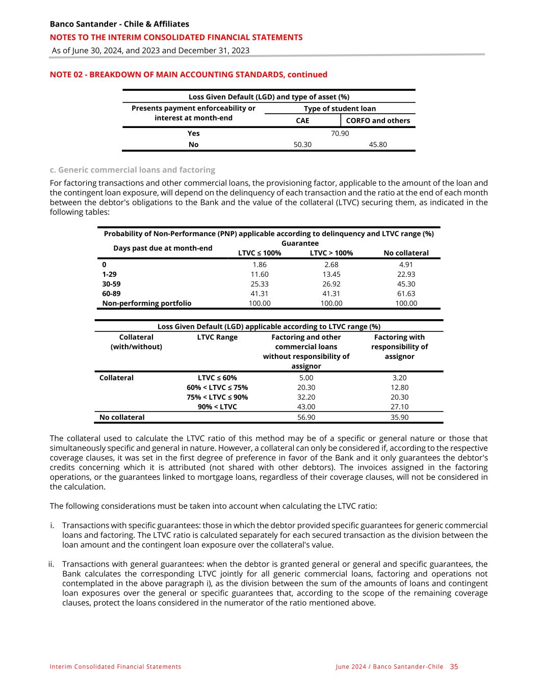 Banco Santander - Chile & Affiliates NOTES TO THE INTERIM CONSOLIDATED FINANCIAL STATEMENTS As of June 30, 2024, and 2023 and December 31, 2023 Interim Consolidated Financial Statements June 2024 / Banco Santander -Chile 35 NOTE 02 - BREAKDOWN OF MAIN ACCOUNTING STANDARDS, continued Loss Given Default (LGD) and type of asset (%) Presents payment enforceability or interest at month-end Type of student loan CAE CORFO and others Yes 70.90 No 50.30 45.80 c. Generic commercial loans and factoring For factoring transactions and other commercial loans, the provisioning factor, applicable to the amount of the loan and the contingent loan exposure, will depend on the delinquency of each transaction and the ratio at the end of each month between the debtor's obligations to the Bank and the value of the collateral (LTVC) securing them, as indicated in the following tables: Probability of Non-Performance (PNP) applicable according to delinquency and LTVC range (%) Days past due at month-end Guarantee No collateral LTVC ≤ 100% LTVC > 100% 0 1.86 2.68 4.91 1-29 11.60 13.45 22.93 30-59 25.33 26.92 45.30 60-89 41.31 41.31 61.63 Non-performing portfolio 100.00 100.00 100.00 Loss Given Default (LGD) applicable according to LTVC range (%) Collateral (with/without) LTVC Range Factoring and other commercial loans without responsibility of assignor Factoring with responsibility of assignor Collateral LTVC ≤ 60% 5.00 3.20 60% < LTVC ≤ 75% 20.30 12.80 75% < LTVC ≤ 90% 32.20 20.30 90% < LTVC 43.00 27.10 No collateral 56.90 35.90 The collateral used to calculate the LTVC ratio of this method may be of a specific or general nature or those that simultaneously specific and general in nature. However, a collateral can only be considered if, according to the respective coverage clauses, it was set in the first degree of preference in favor of the Bank and it only guarantees the debtor's credits concerning which it is attributed (not shared with other debtors). The invoices assigned in the factoring operations, or the guarantees linked to mortgage loans, regardless of their coverage clauses, will not be considered in the calculation. The following considerations must be taken into account when calculating the LTVC ratio: i. Transactions with specific guarantees: those in which the debtor provided specific guarantees for generic commercial loans and factoring. The LTVC ratio is calculated separately for each secured transaction as the division between the loan amount and the contingent loan exposure over the collateral's value. ii. Transactions with general guarantees: when the debtor is granted general or general and specific guarantees, the Bank calculates the corresponding LTVC jointly for all generic commercial loans, factoring and operations not contemplated in the above paragraph i), as the division between the sum of the amounts of loans and contingent loan exposures over the general or specific guarantees that, according to the scope of the remaining coverage clauses, protect the loans considered in the numerator of the ratio mentioned above.