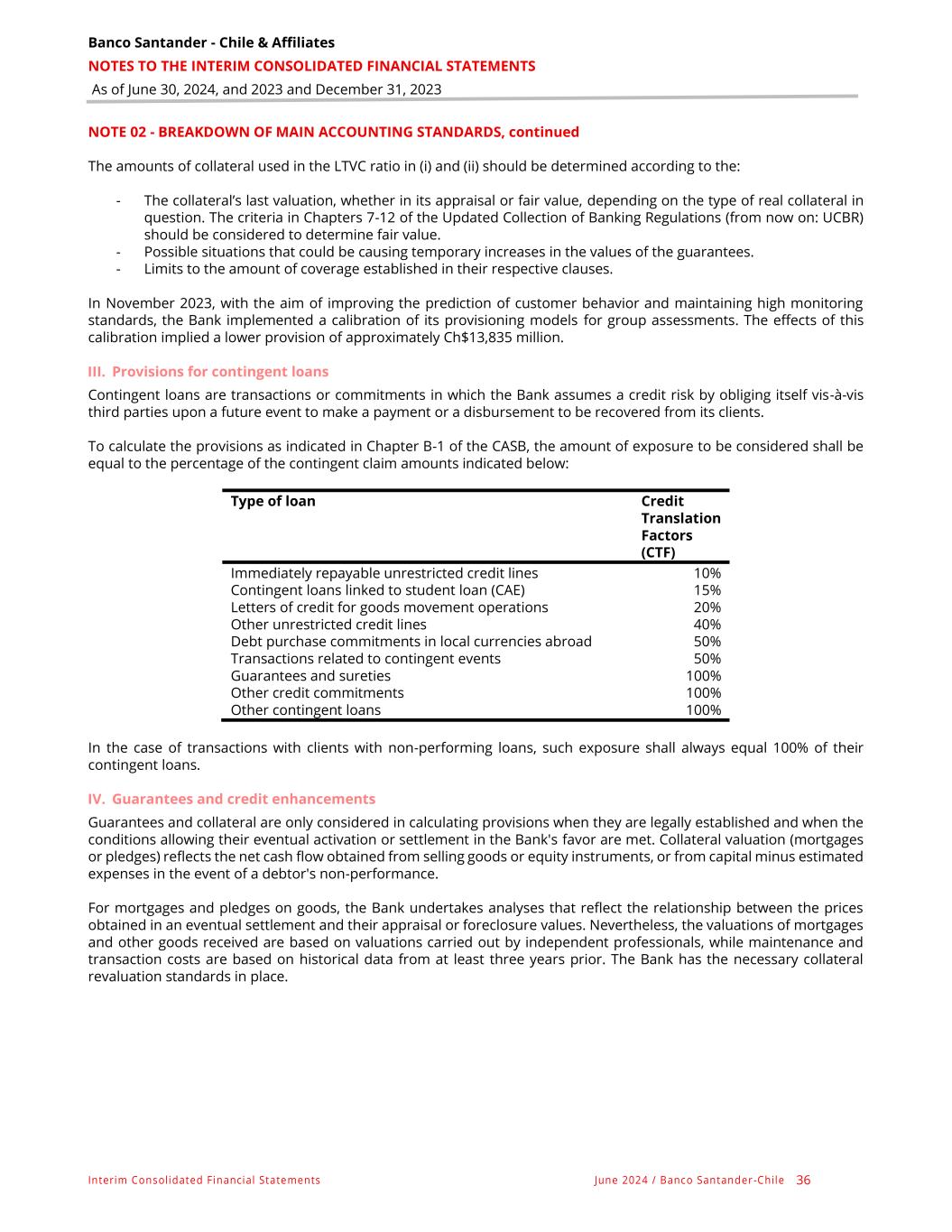 Banco Santander - Chile & Affiliates NOTES TO THE INTERIM CONSOLIDATED FINANCIAL STATEMENTS As of June 30, 2024, and 2023 and December 31, 2023 Interim Consolidated Financial Statements June 2024 / Banco Santander -Chile 36 NOTE 02 - BREAKDOWN OF MAIN ACCOUNTING STANDARDS, continued The amounts of collateral used in the LTVC ratio in (i) and (ii) should be determined according to the: - The collateral’s last valuation, whether in its appraisal or fair value, depending on the type of real collateral in question. The criteria in Chapters 7-12 of the Updated Collection of Banking Regulations (from now on: UCBR) should be considered to determine fair value. - Possible situations that could be causing temporary increases in the values of the guarantees. - Limits to the amount of coverage established in their respective clauses. In November 2023, with the aim of improving the prediction of customer behavior and maintaining high monitoring standards, the Bank implemented a calibration of its provisioning models for group assessments. The effects of this calibration implied a lower provision of approximately Ch$13,835 million. III. Provisions for contingent loans Contingent loans are transactions or commitments in which the Bank assumes a credit risk by obliging itself vis-à-vis third parties upon a future event to make a payment or a disbursement to be recovered from its clients. To calculate the provisions as indicated in Chapter B-1 of the CASB, the amount of exposure to be considered shall be equal to the percentage of the contingent claim amounts indicated below: Type of loan Credit Translation Factors (CTF) Immediately repayable unrestricted credit lines 10% Contingent loans linked to student loan (CAE) 15% Letters of credit for goods movement operations 20% Other unrestricted credit lines 40% Debt purchase commitments in local currencies abroad 50% Transactions related to contingent events 50% Guarantees and sureties 100% Other credit commitments 100% Other contingent loans 100% In the case of transactions with clients with non-performing loans, such exposure shall always equal 100% of their contingent loans. IV. Guarantees and credit enhancements Guarantees and collateral are only considered in calculating provisions when they are legally established and when the conditions allowing their eventual activation or settlement in the Bank's favor are met. Collateral valuation (mortgages or pledges) reflects the net cash flow obtained from selling goods or equity instruments, or from capital minus estimated expenses in the event of a debtor's non-performance. For mortgages and pledges on goods, the Bank undertakes analyses that reflect the relationship between the prices obtained in an eventual settlement and their appraisal or foreclosure values. Nevertheless, the valuations of mortgages and other goods received are based on valuations carried out by independent professionals, while maintenance and transaction costs are based on historical data from at least three years prior. The Bank has the necessary collateral revaluation standards in place.