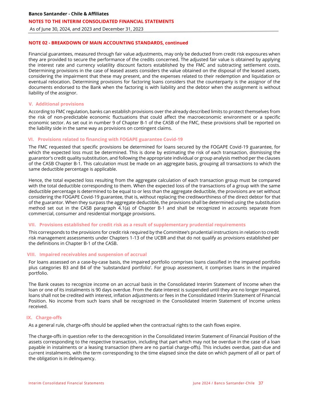 Banco Santander - Chile & Affiliates NOTES TO THE INTERIM CONSOLIDATED FINANCIAL STATEMENTS As of June 30, 2024, and 2023 and December 31, 2023 Interim Consolidated Financial Statements June 2024 / Banco Santander -Chile 37 NOTE 02 - BREAKDOWN OF MAIN ACCOUNTING STANDARDS, continued Financial guarantees, measured through fair value adjustments, may only be deducted from credit risk exposures when they are provided to secure the performance of the credits concerned. The adjusted fair value is obtained by applying the interest rate and currency volatility discount factors established by the FMC and subtracting settlement costs. Determining provisions in the case of leased assets considers the value obtained on the disposal of the leased assets, considering the impairment that these may present, and the expenses related to their redemption and liquidation or eventual relocation. Determining provisions for factoring loans considers that the counterparty is the assignor of the documents endorsed to the Bank when the factoring is with liability and the debtor when the assignment is without liability of the assignor. V. Additional provisions According to FMC regulation, banks can establish provisions over the already described limits to protect themselves from the risk of non-predictable economic fluctuations that could affect the macroeconomic environment or a specific economic sector. As set out in number 9 of Chapter B-1 of the CASB of the FMC, these provisions shall be reported on the liability side in the same way as provisions on contingent claims. VI. Provisions related to financing with FOGAPE guarantee Covid-19 The FMC requested that specific provisions be determined for loans secured by the FOGAPE Covid-19 guarantee, for which the expected loss must be determined. This is done by estimating the risk of each transaction, dismissing the guarantor's credit quality substitution, and following the appropriate individual or group analysis method per the clauses of the CASB Chapter B-1. This calculation must be made on an aggregate basis, grouping all transactions to which the same deductible percentage is applicable. Hence, the total expected loss resulting from the aggregate calculation of each transaction group must be compared with the total deductible corresponding to them. When the expected loss of the transactions of a group with the same deductible percentage is determined to be equal to or less than the aggregate deductible, the provisions are set without considering the FOGAPE Covid-19 guarantee, that is, without replacing the creditworthiness of the direct debtor for that of the guarantor. When they surpass the aggregate deductible, the provisions shall be determined using the substitution method set out in the CASB paragraph 4.1(a) of Chapter B-1 and shall be recognized in accounts separate from commercial, consumer and residential mortgage provisions. VII. Provisions established for credit risk as a result of supplementary prudential requirements This corresponds to the provisions for credit risk required by the Committee’s prudential instructions in relation to credit risk management assessments under Chapters 1-13 of the UCBR and that do not qualify as provisions established per the definitions in Chapter B-1 of the CASB. VIII. Impaired receivables and suspension of accrual For loans assessed on a case-by-case basis, the impaired portfolio comprises loans classified in the impaired portfolio plus categories B3 and B4 of the 'substandard portfolio'. For group assessment, it comprises loans in the impaired portfolio. The Bank ceases to recognize income on an accrual basis in the Consolidated Interim Statement of Income when the loan or one of its instalments is 90 days overdue. From the date interest is suspended until they are no longer impaired, loans shall not be credited with interest, inflation adjustments or fees in the Consolidated Interim Statement of Financial Position. No income from such loans shall be recognized in the Consolidated Interim Statement of Income unless received. IX. Charge-offs As a general rule, charge-offs should be applied when the contractual rights to the cash flows expire. The charge-offs in question refer to the derecognition in the Consolidated Interim Statement of Financial Position of the assets corresponding to the respective transaction, including that part which may not be overdue in the case of a loan payable in instalments or a leasing transaction (there are no partial charge-offs). This includes overdue, past-due and current instalments, with the term corresponding to the time elapsed since the date on which payment of all or part of the obligation is in delinquency.
