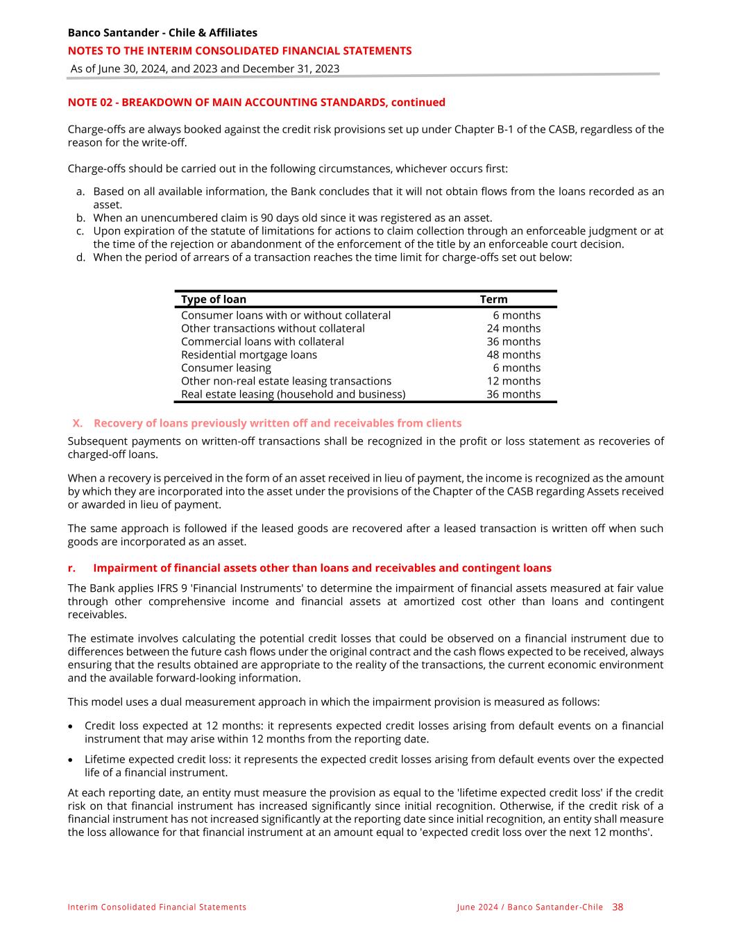 Banco Santander - Chile & Affiliates NOTES TO THE INTERIM CONSOLIDATED FINANCIAL STATEMENTS As of June 30, 2024, and 2023 and December 31, 2023 Interim Consolidated Financial Statements June 2024 / Banco Santander -Chile 38 NOTE 02 - BREAKDOWN OF MAIN ACCOUNTING STANDARDS, continued Charge-offs are always booked against the credit risk provisions set up under Chapter B-1 of the CASB, regardless of the reason for the write-off. Charge-offs should be carried out in the following circumstances, whichever occurs first: a. Based on all available information, the Bank concludes that it will not obtain flows from the loans recorded as an asset. b. When an unencumbered claim is 90 days old since it was registered as an asset. c. Upon expiration of the statute of limitations for actions to claim collection through an enforceable judgment or at the time of the rejection or abandonment of the enforcement of the title by an enforceable court decision. d. When the period of arrears of a transaction reaches the time limit for charge-offs set out below: Type of loan Term Consumer loans with or without collateral 6 months Other transactions without collateral 24 months Commercial loans with collateral 36 months Residential mortgage loans 48 months Consumer leasing 6 months Other non-real estate leasing transactions 12 months Real estate leasing (household and business) 36 months X. Recovery of loans previously written off and receivables from clients Subsequent payments on written-off transactions shall be recognized in the profit or loss statement as recoveries of charged-off loans. When a recovery is perceived in the form of an asset received in lieu of payment, the income is recognized as the amount by which they are incorporated into the asset under the provisions of the Chapter of the CASB regarding Assets received or awarded in lieu of payment. The same approach is followed if the leased goods are recovered after a leased transaction is written off when such goods are incorporated as an asset. r. Impairment of financial assets other than loans and receivables and contingent loans The Bank applies IFRS 9 'Financial Instruments' to determine the impairment of financial assets measured at fair value through other comprehensive income and financial assets at amortized cost other than loans and contingent receivables. The estimate involves calculating the potential credit losses that could be observed on a financial instrument due to differences between the future cash flows under the original contract and the cash flows expected to be received, always ensuring that the results obtained are appropriate to the reality of the transactions, the current economic environment and the available forward-looking information. This model uses a dual measurement approach in which the impairment provision is measured as follows: • Credit loss expected at 12 months: it represents expected credit losses arising from default events on a financial instrument that may arise within 12 months from the reporting date. • Lifetime expected credit loss: it represents the expected credit losses arising from default events over the expected life of a financial instrument. At each reporting date, an entity must measure the provision as equal to the 'lifetime expected credit loss' if the credit risk on that financial instrument has increased significantly since initial recognition. Otherwise, if the credit risk of a financial instrument has not increased significantly at the reporting date since initial recognition, an entity shall measure the loss allowance for that financial instrument at an amount equal to 'expected credit loss over the next 12 months'.