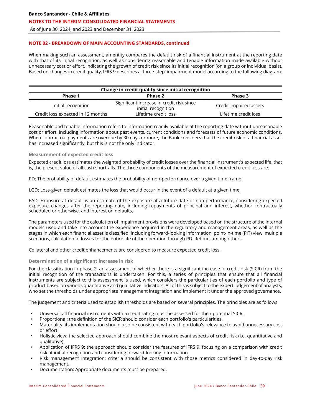 Banco Santander - Chile & Affiliates NOTES TO THE INTERIM CONSOLIDATED FINANCIAL STATEMENTS As of June 30, 2024, and 2023 and December 31, 2023 Interim Consolidated Financial Statements June 2024 / Banco Santander -Chile 39 NOTE 02 - BREAKDOWN OF MAIN ACCOUNTING STANDARDS, continued When making such an assessment, an entity compares the default risk of a financial instrument at the reporting date with that of its initial recognition, as well as considering reasonable and tenable information made available without unnecessary cost or effort, indicating the growth of credit risk since its initial recognition (on a group or individual basis). Based on changes in credit quality, IFRS 9 describes a 'three-step' impairment model according to the following diagram: Change in credit quality since initial recognition Phase 1 Phase 2 Phase 3 Initial recognition Significant increase in credit risk since initial recognition Credit-impaired assets Credit loss expected in 12 months Lifetime credit loss Lifetime credit loss Reasonable and tenable information refers to information readily available at the reporting date without unreasonable cost or effort, including information about past events, current conditions and forecasts of future economic conditions. When contractual payments are overdue by 30 days or more, the Bank considers that the credit risk of a financial asset has increased significantly, but this is not the only indicator. Measurement of expected credit loss Expected credit loss estimates the weighted probability of credit losses over the financial instrument's expected life, that is, the present value of all cash shortfalls. The three components of the measurement of expected credit loss are: PD: The probability of default estimates the probability of non-performance over a given time frame. LGD: Loss-given default estimates the loss that would occur in the event of a default at a given time. EAD: Exposure at default is an estimate of the exposure at a future date of non-performance, considering expected exposure changes after the reporting date, including repayments of principal and interest, whether contractually scheduled or otherwise, and interest on defaults. The parameters used for the calculation of impairment provisions were developed based on the structure of the internal models used and take into account the experience acquired in the regulatory and management areas, as well as the stages in which each financial asset is classified, including forward-looking information, point-in-time (PIT) view, multiple scenarios, calculation of losses for the entire life of the operation through PD lifetime, among others. Collateral and other credit enhancements are considered to measure expected credit loss. Determination of a significant increase in risk For the classification in phase 2, an assessment of whether there is a significant increase in credit risk (SICR) from the initial recognition of the transactions is undertaken. For this, a series of principles that ensure that all financial instruments are subject to this assessment is used, which considers the particularities of each portfolio and type of product based on various quantitative and qualitative indicators. All of this is subject to the expert judgement of analysts, who set the thresholds under appropriate management integration and implement it under the approved governance. The judgement and criteria used to establish thresholds are based on several principles. The principles are as follows: • Universal: all financial instruments with a credit rating must be assessed for their potential SICR. • Proportional: the definition of the SICR should consider each portfolio's particularities. • Materiality: its implementation should also be consistent with each portfolio's relevance to avoid unnecessary cost or effort. • Holistic view: the selected approach should combine the most relevant aspects of credit risk (i.e. quantitative and qualitative). • Application of IFRS 9: the approach should consider the features of IFRS 9, focusing on a comparison with credit risk at initial recognition and considering forward-looking information. • Risk management integration: criteria should be consistent with those metrics considered in day-to-day risk management. • Documentation: Appropriate documents must be prepared.