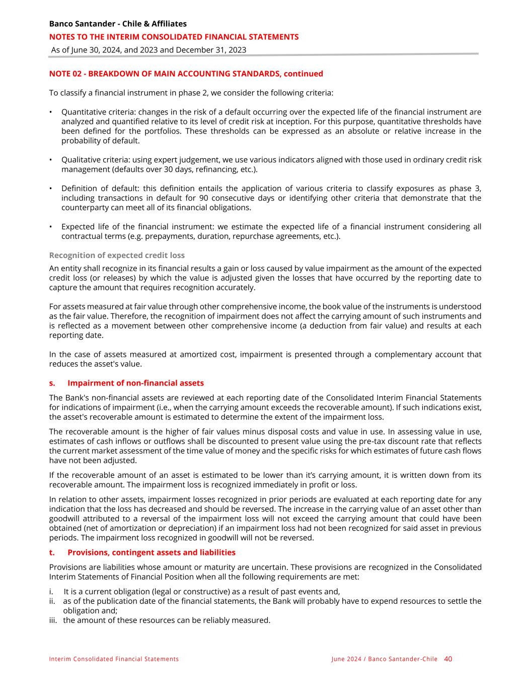 Banco Santander - Chile & Affiliates NOTES TO THE INTERIM CONSOLIDATED FINANCIAL STATEMENTS As of June 30, 2024, and 2023 and December 31, 2023 Interim Consolidated Financial Statements June 2024 / Banco Santander -Chile 40 NOTE 02 - BREAKDOWN OF MAIN ACCOUNTING STANDARDS, continued To classify a financial instrument in phase 2, we consider the following criteria: • Quantitative criteria: changes in the risk of a default occurring over the expected life of the financial instrument are analyzed and quantified relative to its level of credit risk at inception. For this purpose, quantitative thresholds have been defined for the portfolios. These thresholds can be expressed as an absolute or relative increase in the probability of default. • Qualitative criteria: using expert judgement, we use various indicators aligned with those used in ordinary credit risk management (defaults over 30 days, refinancing, etc.). • Definition of default: this definition entails the application of various criteria to classify exposures as phase 3, including transactions in default for 90 consecutive days or identifying other criteria that demonstrate that the counterparty can meet all of its financial obligations. • Expected life of the financial instrument: we estimate the expected life of a financial instrument considering all contractual terms (e.g. prepayments, duration, repurchase agreements, etc.). Recognition of expected credit loss An entity shall recognize in its financial results a gain or loss caused by value impairment as the amount of the expected credit loss (or releases) by which the value is adjusted given the losses that have occurred by the reporting date to capture the amount that requires recognition accurately. For assets measured at fair value through other comprehensive income, the book value of the instruments is understood as the fair value. Therefore, the recognition of impairment does not affect the carrying amount of such instruments and is reflected as a movement between other comprehensive income (a deduction from fair value) and results at each reporting date. In the case of assets measured at amortized cost, impairment is presented through a complementary account that reduces the asset's value. s. Impairment of non-financial assets The Bank's non-financial assets are reviewed at each reporting date of the Consolidated Interim Financial Statements for indications of impairment (i.e., when the carrying amount exceeds the recoverable amount). If such indications exist, the asset's recoverable amount is estimated to determine the extent of the impairment loss. The recoverable amount is the higher of fair values minus disposal costs and value in use. In assessing value in use, estimates of cash inflows or outflows shall be discounted to present value using the pre-tax discount rate that reflects the current market assessment of the time value of money and the specific risks for which estimates of future cash flows have not been adjusted. If the recoverable amount of an asset is estimated to be lower than it’s carrying amount, it is written down from its recoverable amount. The impairment loss is recognized immediately in profit or loss. In relation to other assets, impairment losses recognized in prior periods are evaluated at each reporting date for any indication that the loss has decreased and should be reversed. The increase in the carrying value of an asset other than goodwill attributed to a reversal of the impairment loss will not exceed the carrying amount that could have been obtained (net of amortization or depreciation) if an impairment loss had not been recognized for said asset in previous periods. The impairment loss recognized in goodwill will not be reversed. t. Provisions, contingent assets and liabilities Provisions are liabilities whose amount or maturity are uncertain. These provisions are recognized in the Consolidated Interim Statements of Financial Position when all the following requirements are met: i. It is a current obligation (legal or constructive) as a result of past events and, ii. as of the publication date of the financial statements, the Bank will probably have to expend resources to settle the obligation and; iii. the amount of these resources can be reliably measured.