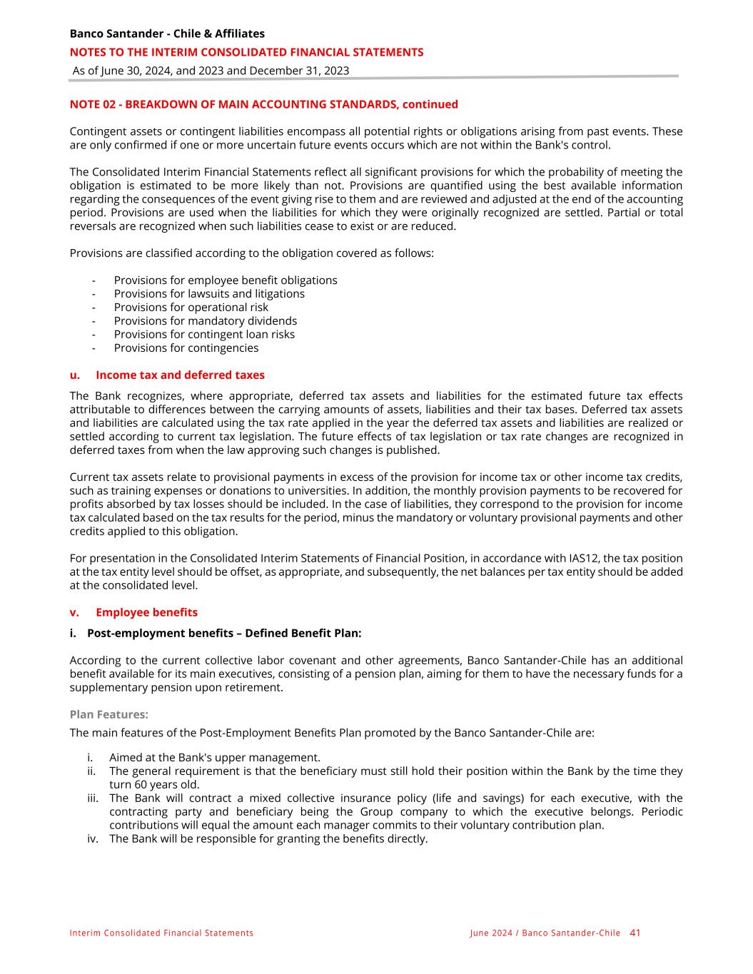 Banco Santander - Chile & Affiliates NOTES TO THE INTERIM CONSOLIDATED FINANCIAL STATEMENTS As of June 30, 2024, and 2023 and December 31, 2023 Interim Consolidated Financial Statements June 2024 / Banco Santander -Chile 41 NOTE 02 - BREAKDOWN OF MAIN ACCOUNTING STANDARDS, continued Contingent assets or contingent liabilities encompass all potential rights or obligations arising from past events. These are only confirmed if one or more uncertain future events occurs which are not within the Bank's control. The Consolidated Interim Financial Statements reflect all significant provisions for which the probability of meeting the obligation is estimated to be more likely than not. Provisions are quantified using the best available information regarding the consequences of the event giving rise to them and are reviewed and adjusted at the end of the accounting period. Provisions are used when the liabilities for which they were originally recognized are settled. Partial or total reversals are recognized when such liabilities cease to exist or are reduced. Provisions are classified according to the obligation covered as follows: - Provisions for employee benefit obligations - Provisions for lawsuits and litigations - Provisions for operational risk - Provisions for mandatory dividends - Provisions for contingent loan risks - Provisions for contingencies u. Income tax and deferred taxes The Bank recognizes, where appropriate, deferred tax assets and liabilities for the estimated future tax effects attributable to differences between the carrying amounts of assets, liabilities and their tax bases. Deferred tax assets and liabilities are calculated using the tax rate applied in the year the deferred tax assets and liabilities are realized or settled according to current tax legislation. The future effects of tax legislation or tax rate changes are recognized in deferred taxes from when the law approving such changes is published. Current tax assets relate to provisional payments in excess of the provision for income tax or other income tax credits, such as training expenses or donations to universities. In addition, the monthly provision payments to be recovered for profits absorbed by tax losses should be included. In the case of liabilities, they correspond to the provision for income tax calculated based on the tax results for the period, minus the mandatory or voluntary provisional payments and other credits applied to this obligation. For presentation in the Consolidated Interim Statements of Financial Position, in accordance with IAS12, the tax position at the tax entity level should be offset, as appropriate, and subsequently, the net balances per tax entity should be added at the consolidated level. v. Employee benefits i. Post-employment benefits – Defined Benefit Plan: According to the current collective labor covenant and other agreements, Banco Santander-Chile has an additional benefit available for its main executives, consisting of a pension plan, aiming for them to have the necessary funds for a supplementary pension upon retirement. Plan Features: The main features of the Post-Employment Benefits Plan promoted by the Banco Santander-Chile are: i. Aimed at the Bank's upper management. ii. The general requirement is that the beneficiary must still hold their position within the Bank by the time they turn 60 years old. iii. The Bank will contract a mixed collective insurance policy (life and savings) for each executive, with the contracting party and beneficiary being the Group company to which the executive belongs. Periodic contributions will equal the amount each manager commits to their voluntary contribution plan. iv. The Bank will be responsible for granting the benefits directly.
