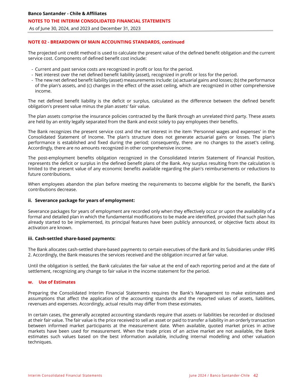 Banco Santander - Chile & Affiliates NOTES TO THE INTERIM CONSOLIDATED FINANCIAL STATEMENTS As of June 30, 2024, and 2023 and December 31, 2023 Interim Consolidated Financial Statements June 2024 / Banco Santander -Chile 42 NOTE 02 - BREAKDOWN OF MAIN ACCOUNTING STANDARDS, continued The projected unit credit method is used to calculate the present value of the defined benefit obligation and the current service cost. Components of defined benefit cost include: - Current and past service costs are recognized in profit or loss for the period. - Net interest over the net defined benefit liability (asset), recognized in profit or loss for the period. - The new net defined benefit liability (asset) measurements include: (a) actuarial gains and losses; (b) the performance of the plan's assets, and (c) changes in the effect of the asset ceiling, which are recognized in other comprehensive income. The net defined benefit liability is the deficit or surplus, calculated as the difference between the defined benefit obligation's present value minus the plan assets' fair value. The plan assets comprise the insurance policies contracted by the Bank through an unrelated third party. These assets are held by an entity legally separated from the Bank and exist solely to pay employees their benefits. The Bank recognizes the present service cost and the net interest in the item 'Personnel wages and expenses' in the Consolidated Statement of Income. The plan's structure does not generate actuarial gains or losses. The plan's performance is established and fixed during the period; consequently, there are no changes to the asset's ceiling. Accordingly, there are no amounts recognized in other comprehensive income. The post-employment benefits obligation recognized in the Consolidated Interim Statement of Financial Position, represents the deficit or surplus in the defined benefit plans of the Bank. Any surplus resulting from the calculation is limited to the present value of any economic benefits available regarding the plan's reimbursements or reductions to future contributions. When employees abandon the plan before meeting the requirements to become eligible for the benefit, the Bank's contributions decrease. ii. Severance package for years of employment: Severance packages for years of employment are recorded only when they effectively occur or upon the availability of a formal and detailed plan in which the fundamental modifications to be made are identified, provided that such plan has already started to be implemented, its principal features have been publicly announced, or objective facts about its activation are known. iii. Cash-settled share-based payments: The Bank allocates cash-settled share-based payments to certain executives of the Bank and its Subsidiaries under IFRS 2. Accordingly, the Bank measures the services received and the obligation incurred at fair value. Until the obligation is settled, the Bank calculates the fair value at the end of each reporting period and at the date of settlement, recognizing any change to fair value in the income statement for the period. w. Use of Estimates Preparing the Consolidated Interim Financial Statements requires the Bank's Management to make estimates and assumptions that affect the application of the accounting standards and the reported values of assets, liabilities, revenues and expenses. Accordingly, actual results may differ from these estimates. In certain cases, the generally accepted accounting standards require that assets or liabilities be recorded or disclosed at their fair value. The fair value is the price received to sell an asset or paid to transfer a liability in an orderly transaction between informed market participants at the measurement date. When available, quoted market prices in active markets have been used for measurement. When the trade prices of an active market are not available, the Bank estimates such values based on the best information available, including internal modelling and other valuation techniques.