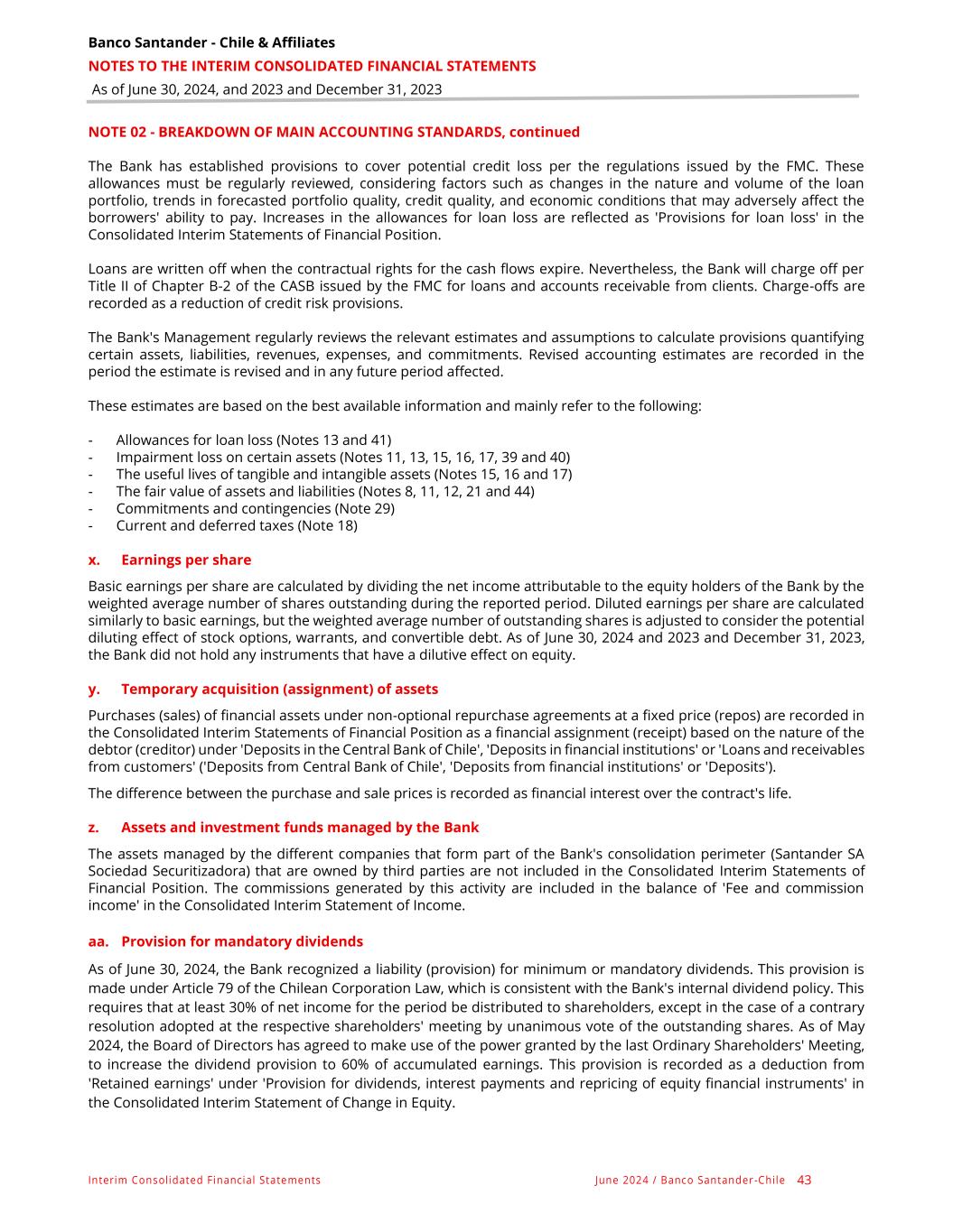 Banco Santander - Chile & Affiliates NOTES TO THE INTERIM CONSOLIDATED FINANCIAL STATEMENTS As of June 30, 2024, and 2023 and December 31, 2023 Interim Consolidated Financial Statements June 2024 / Banco Santander -Chile 43 NOTE 02 - BREAKDOWN OF MAIN ACCOUNTING STANDARDS, continued The Bank has established provisions to cover potential credit loss per the regulations issued by the FMC. These allowances must be regularly reviewed, considering factors such as changes in the nature and volume of the loan portfolio, trends in forecasted portfolio quality, credit quality, and economic conditions that may adversely affect the borrowers' ability to pay. Increases in the allowances for loan loss are reflected as 'Provisions for loan loss' in the Consolidated Interim Statements of Financial Position. Loans are written off when the contractual rights for the cash flows expire. Nevertheless, the Bank will charge off per Title II of Chapter B-2 of the CASB issued by the FMC for loans and accounts receivable from clients. Charge-offs are recorded as a reduction of credit risk provisions. The Bank's Management regularly reviews the relevant estimates and assumptions to calculate provisions quantifying certain assets, liabilities, revenues, expenses, and commitments. Revised accounting estimates are recorded in the period the estimate is revised and in any future period affected. These estimates are based on the best available information and mainly refer to the following: - Allowances for loan loss (Notes 13 and 41) - Impairment loss on certain assets (Notes 11, 13, 15, 16, 17, 39 and 40) - The useful lives of tangible and intangible assets (Notes 15, 16 and 17) - The fair value of assets and liabilities (Notes 8, 11, 12, 21 and 44) - Commitments and contingencies (Note 29) - Current and deferred taxes (Note 18) x. Earnings per share Basic earnings per share are calculated by dividing the net income attributable to the equity holders of the Bank by the weighted average number of shares outstanding during the reported period. Diluted earnings per share are calculated similarly to basic earnings, but the weighted average number of outstanding shares is adjusted to consider the potential diluting effect of stock options, warrants, and convertible debt. As of June 30, 2024 and 2023 and December 31, 2023, the Bank did not hold any instruments that have a dilutive effect on equity. y. Temporary acquisition (assignment) of assets Purchases (sales) of financial assets under non-optional repurchase agreements at a fixed price (repos) are recorded in the Consolidated Interim Statements of Financial Position as a financial assignment (receipt) based on the nature of the debtor (creditor) under 'Deposits in the Central Bank of Chile', 'Deposits in financial institutions' or 'Loans and receivables from customers' ('Deposits from Central Bank of Chile', 'Deposits from financial institutions' or 'Deposits'). The difference between the purchase and sale prices is recorded as financial interest over the contract's life. z. Assets and investment funds managed by the Bank The assets managed by the different companies that form part of the Bank's consolidation perimeter (Santander SA Sociedad Securitizadora) that are owned by third parties are not included in the Consolidated Interim Statements of Financial Position. The commissions generated by this activity are included in the balance of 'Fee and commission income' in the Consolidated Interim Statement of Income. aa. Provision for mandatory dividends As of June 30, 2024, the Bank recognized a liability (provision) for minimum or mandatory dividends. This provision is made under Article 79 of the Chilean Corporation Law, which is consistent with the Bank's internal dividend policy. This requires that at least 30% of net income for the period be distributed to shareholders, except in the case of a contrary resolution adopted at the respective shareholders' meeting by unanimous vote of the outstanding shares. As of May 2024, the Board of Directors has agreed to make use of the power granted by the last Ordinary Shareholders' Meeting, to increase the dividend provision to 60% of accumulated earnings. This provision is recorded as a deduction from 'Retained earnings' under 'Provision for dividends, interest payments and repricing of equity financial instruments' in the Consolidated Interim Statement of Change in Equity.