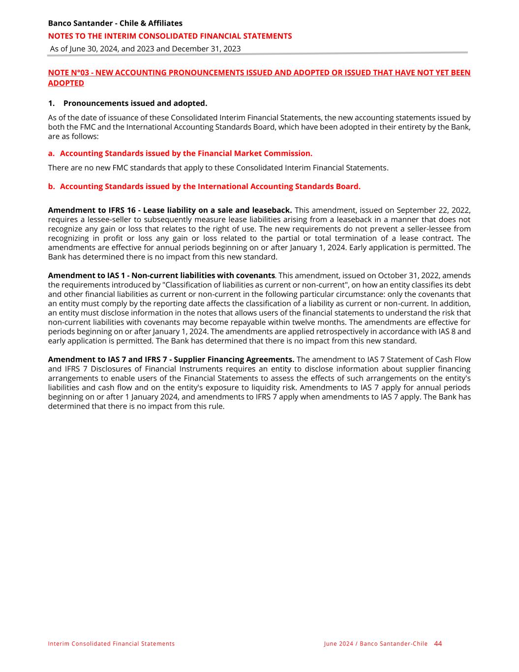 Banco Santander - Chile & Affiliates NOTES TO THE INTERIM CONSOLIDATED FINANCIAL STATEMENTS As of June 30, 2024, and 2023 and December 31, 2023 Interim Consolidated Financial Statements June 2024 / Banco Santander -Chile 44 NOTE N°03 - NEW ACCOUNTING PRONOUNCEMENTS ISSUED AND ADOPTED OR ISSUED THAT HAVE NOT YET BEEN ADOPTED 1. Pronouncements issued and adopted. As of the date of issuance of these Consolidated Interim Financial Statements, the new accounting statements issued by both the FMC and the International Accounting Standards Board, which have been adopted in their entirety by the Bank, are as follows: a. Accounting Standards issued by the Financial Market Commission. There are no new FMC standards that apply to these Consolidated Interim Financial Statements. b. Accounting Standards issued by the International Accounting Standards Board. Amendment to IFRS 16 - Lease liability on a sale and leaseback. This amendment, issued on September 22, 2022, requires a lessee-seller to subsequently measure lease liabilities arising from a leaseback in a manner that does not recognize any gain or loss that relates to the right of use. The new requirements do not prevent a seller-lessee from recognizing in profit or loss any gain or loss related to the partial or total termination of a lease contract. The amendments are effective for annual periods beginning on or after January 1, 2024. Early application is permitted. The Bank has determined there is no impact from this new standard. Amendment to IAS 1 - Non-current liabilities with covenants. This amendment, issued on October 31, 2022, amends the requirements introduced by "Classification of liabilities as current or non-current", on how an entity classifies its debt and other financial liabilities as current or non-current in the following particular circumstance: only the covenants that an entity must comply by the reporting date affects the classification of a liability as current or non-current. In addition, an entity must disclose information in the notes that allows users of the financial statements to understand the risk that non-current liabilities with covenants may become repayable within twelve months. The amendments are effective for periods beginning on or after January 1, 2024. The amendments are applied retrospectively in accordance with IAS 8 and early application is permitted. The Bank has determined that there is no impact from this new standard. Amendment to IAS 7 and IFRS 7 - Supplier Financing Agreements. The amendment to IAS 7 Statement of Cash Flow and IFRS 7 Disclosures of Financial Instruments requires an entity to disclose information about supplier financing arrangements to enable users of the Financial Statements to assess the effects of such arrangements on the entity's liabilities and cash flow and on the entity's exposure to liquidity risk. Amendments to IAS 7 apply for annual periods beginning on or after 1 January 2024, and amendments to IFRS 7 apply when amendments to IAS 7 apply. The Bank has determined that there is no impact from this rule.