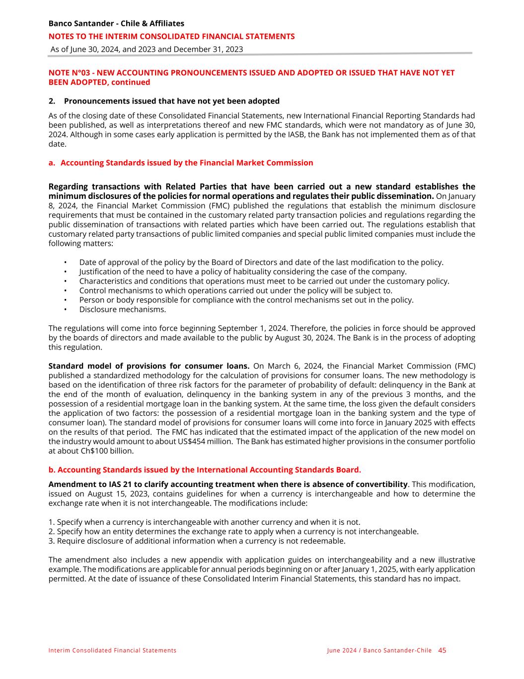 Banco Santander - Chile & Affiliates NOTES TO THE INTERIM CONSOLIDATED FINANCIAL STATEMENTS As of June 30, 2024, and 2023 and December 31, 2023 Interim Consolidated Financial Statements June 2024 / Banco Santander -Chile 45 NOTE N°03 - NEW ACCOUNTING PRONOUNCEMENTS ISSUED AND ADOPTED OR ISSUED THAT HAVE NOT YET BEEN ADOPTED, continued 2. Pronouncements issued that have not yet been adopted As of the closing date of these Consolidated Financial Statements, new International Financial Reporting Standards had been published, as well as interpretations thereof and new FMC standards, which were not mandatory as of June 30, 2024. Although in some cases early application is permitted by the IASB, the Bank has not implemented them as of that date. a. Accounting Standards issued by the Financial Market Commission Regarding transactions with Related Parties that have been carried out a new standard establishes the minimum disclosures of the policies for normal operations and regulates their public dissemination. On January 8, 2024, the Financial Market Commission (FMC) published the regulations that establish the minimum disclosure requirements that must be contained in the customary related party transaction policies and regulations regarding the public dissemination of transactions with related parties which have been carried out. The regulations establish that customary related party transactions of public limited companies and special public limited companies must include the following matters: • Date of approval of the policy by the Board of Directors and date of the last modification to the policy. • Justification of the need to have a policy of habituality considering the case of the company. • Characteristics and conditions that operations must meet to be carried out under the customary policy. • Control mechanisms to which operations carried out under the policy will be subject to. • Person or body responsible for compliance with the control mechanisms set out in the policy. • Disclosure mechanisms. The regulations will come into force beginning September 1, 2024. Therefore, the policies in force should be approved by the boards of directors and made available to the public by August 30, 2024. The Bank is in the process of adopting this regulation. Standard model of provisions for consumer loans. On March 6, 2024, the Financial Market Commission (FMC) published a standardized methodology for the calculation of provisions for consumer loans. The new methodology is based on the identification of three risk factors for the parameter of probability of default: delinquency in the Bank at the end of the month of evaluation, delinquency in the banking system in any of the previous 3 months, and the possession of a residential mortgage loan in the banking system. At the same time, the loss given the default considers the application of two factors: the possession of a residential mortgage loan in the banking system and the type of consumer loan). The standard model of provisions for consumer loans will come into force in January 2025 with effects on the results of that period. The FMC has indicated that the estimated impact of the application of the new model on the industry would amount to about US$454 million. The Bank has estimated higher provisions in the consumer portfolio at about Ch$100 billion. b. Accounting Standards issued by the International Accounting Standards Board. Amendment to IAS 21 to clarify accounting treatment when there is absence of convertibility. This modification, issued on August 15, 2023, contains guidelines for when a currency is interchangeable and how to determine the exchange rate when it is not interchangeable. The modifications include: 1. Specify when a currency is interchangeable with another currency and when it is not. 2. Specify how an entity determines the exchange rate to apply when a currency is not interchangeable. 3. Require disclosure of additional information when a currency is not redeemable. The amendment also includes a new appendix with application guides on interchangeability and a new illustrative example. The modifications are applicable for annual periods beginning on or after January 1, 2025, with early application permitted. At the date of issuance of these Consolidated Interim Financial Statements, this standard has no impact.