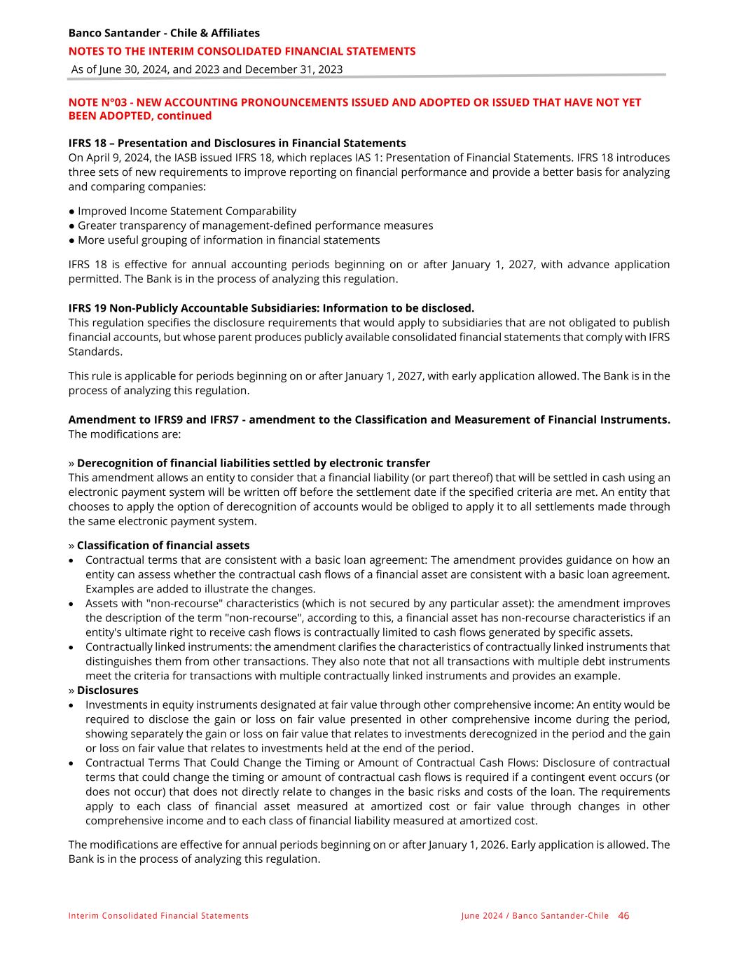 Banco Santander - Chile & Affiliates NOTES TO THE INTERIM CONSOLIDATED FINANCIAL STATEMENTS As of June 30, 2024, and 2023 and December 31, 2023 Interim Consolidated Financial Statements June 2024 / Banco Santander -Chile 46 NOTE N°03 - NEW ACCOUNTING PRONOUNCEMENTS ISSUED AND ADOPTED OR ISSUED THAT HAVE NOT YET BEEN ADOPTED, continued IFRS 18 – Presentation and Disclosures in Financial Statements On April 9, 2024, the IASB issued IFRS 18, which replaces IAS 1: Presentation of Financial Statements. IFRS 18 introduces three sets of new requirements to improve reporting on financial performance and provide a better basis for analyzing and comparing companies: ● Improved Income Statement Comparability ● Greater transparency of management-defined performance measures ● More useful grouping of information in financial statements IFRS 18 is effective for annual accounting periods beginning on or after January 1, 2027, with advance application permitted. The Bank is in the process of analyzing this regulation. IFRS 19 Non-Publicly Accountable Subsidiaries: Information to be disclosed. This regulation specifies the disclosure requirements that would apply to subsidiaries that are not obligated to publish financial accounts, but whose parent produces publicly available consolidated financial statements that comply with IFRS Standards. This rule is applicable for periods beginning on or after January 1, 2027, with early application allowed. The Bank is in the process of analyzing this regulation. Amendment to IFRS9 and IFRS7 - amendment to the Classification and Measurement of Financial Instruments. The modifications are: » Derecognition of financial liabilities settled by electronic transfer This amendment allows an entity to consider that a financial liability (or part thereof) that will be settled in cash using an electronic payment system will be written off before the settlement date if the specified criteria are met. An entity that chooses to apply the option of derecognition of accounts would be obliged to apply it to all settlements made through the same electronic payment system. » Classification of financial assets • Contractual terms that are consistent with a basic loan agreement: The amendment provides guidance on how an entity can assess whether the contractual cash flows of a financial asset are consistent with a basic loan agreement. Examples are added to illustrate the changes. • Assets with "non-recourse" characteristics (which is not secured by any particular asset): the amendment improves the description of the term "non-recourse", according to this, a financial asset has non-recourse characteristics if an entity's ultimate right to receive cash flows is contractually limited to cash flows generated by specific assets. • Contractually linked instruments: the amendment clarifies the characteristics of contractually linked instruments that distinguishes them from other transactions. They also note that not all transactions with multiple debt instruments meet the criteria for transactions with multiple contractually linked instruments and provides an example. » Disclosures • Investments in equity instruments designated at fair value through other comprehensive income: An entity would be required to disclose the gain or loss on fair value presented in other comprehensive income during the period, showing separately the gain or loss on fair value that relates to investments derecognized in the period and the gain or loss on fair value that relates to investments held at the end of the period. • Contractual Terms That Could Change the Timing or Amount of Contractual Cash Flows: Disclosure of contractual terms that could change the timing or amount of contractual cash flows is required if a contingent event occurs (or does not occur) that does not directly relate to changes in the basic risks and costs of the loan. The requirements apply to each class of financial asset measured at amortized cost or fair value through changes in other comprehensive income and to each class of financial liability measured at amortized cost. The modifications are effective for annual periods beginning on or after January 1, 2026. Early application is allowed. The Bank is in the process of analyzing this regulation.