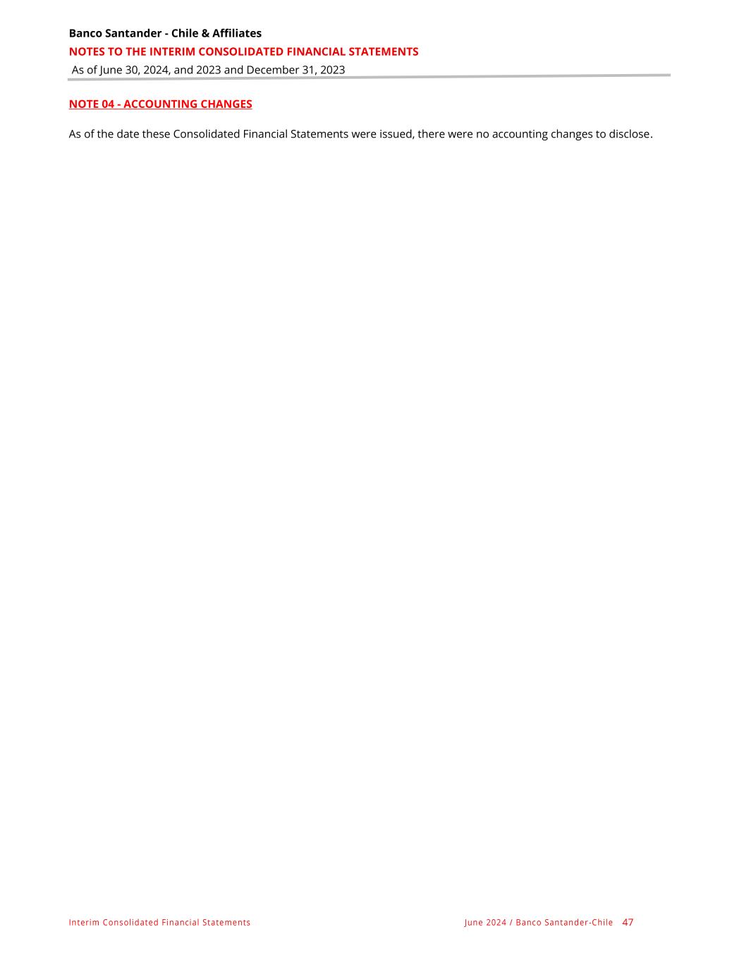 Banco Santander - Chile & Affiliates NOTES TO THE INTERIM CONSOLIDATED FINANCIAL STATEMENTS As of June 30, 2024, and 2023 and December 31, 2023 Interim Consolidated Financial Statements June 2024 / Banco Santander -Chile 47 NOTE 04 - ACCOUNTING CHANGES As of the date these Consolidated Financial Statements were issued, there were no accounting changes to disclose.