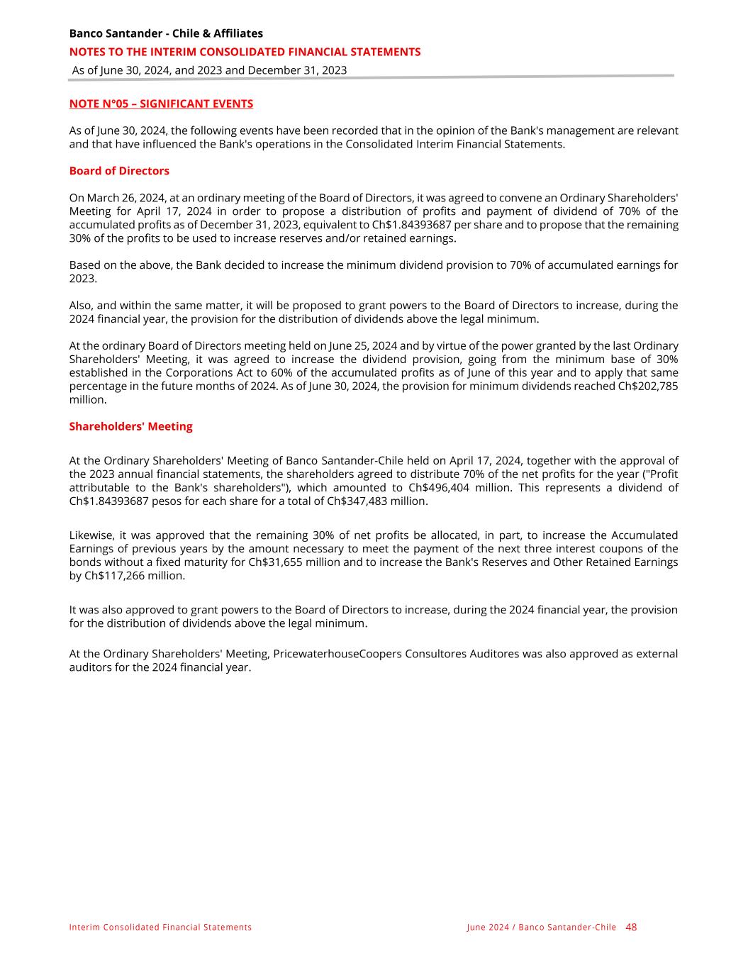 Banco Santander - Chile & Affiliates NOTES TO THE INTERIM CONSOLIDATED FINANCIAL STATEMENTS As of June 30, 2024, and 2023 and December 31, 2023 Interim Consolidated Financial Statements June 2024 / Banco Santander -Chile 48 NOTE N°05 – SIGNIFICANT EVENTS As of June 30, 2024, the following events have been recorded that in the opinion of the Bank's management are relevant and that have influenced the Bank's operations in the Consolidated Interim Financial Statements. Board of Directors On March 26, 2024, at an ordinary meeting of the Board of Directors, it was agreed to convene an Ordinary Shareholders' Meeting for April 17, 2024 in order to propose a distribution of profits and payment of dividend of 70% of the accumulated profits as of December 31, 2023, equivalent to Ch$1.84393687 per share and to propose that the remaining 30% of the profits to be used to increase reserves and/or retained earnings. Based on the above, the Bank decided to increase the minimum dividend provision to 70% of accumulated earnings for 2023. Also, and within the same matter, it will be proposed to grant powers to the Board of Directors to increase, during the 2024 financial year, the provision for the distribution of dividends above the legal minimum. At the ordinary Board of Directors meeting held on June 25, 2024 and by virtue of the power granted by the last Ordinary Shareholders' Meeting, it was agreed to increase the dividend provision, going from the minimum base of 30% established in the Corporations Act to 60% of the accumulated profits as of June of this year and to apply that same percentage in the future months of 2024. As of June 30, 2024, the provision for minimum dividends reached Ch$202,785 million. Shareholders' Meeting At the Ordinary Shareholders' Meeting of Banco Santander-Chile held on April 17, 2024, together with the approval of the 2023 annual financial statements, the shareholders agreed to distribute 70% of the net profits for the year ("Profit attributable to the Bank's shareholders"), which amounted to Ch$496,404 million. This represents a dividend of Ch$1.84393687 pesos for each share for a total of Ch$347,483 million. Likewise, it was approved that the remaining 30% of net profits be allocated, in part, to increase the Accumulated Earnings of previous years by the amount necessary to meet the payment of the next three interest coupons of the bonds without a fixed maturity for Ch$31,655 million and to increase the Bank's Reserves and Other Retained Earnings by Ch$117,266 million. It was also approved to grant powers to the Board of Directors to increase, during the 2024 financial year, the provision for the distribution of dividends above the legal minimum. At the Ordinary Shareholders' Meeting, PricewaterhouseCoopers Consultores Auditores was also approved as external auditors for the 2024 financial year.