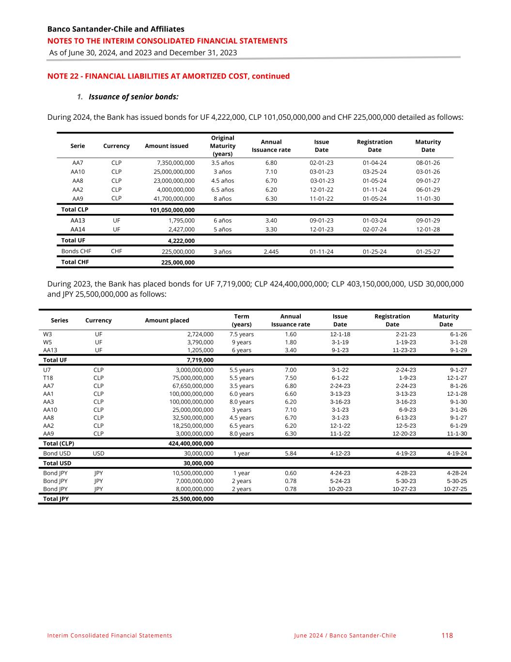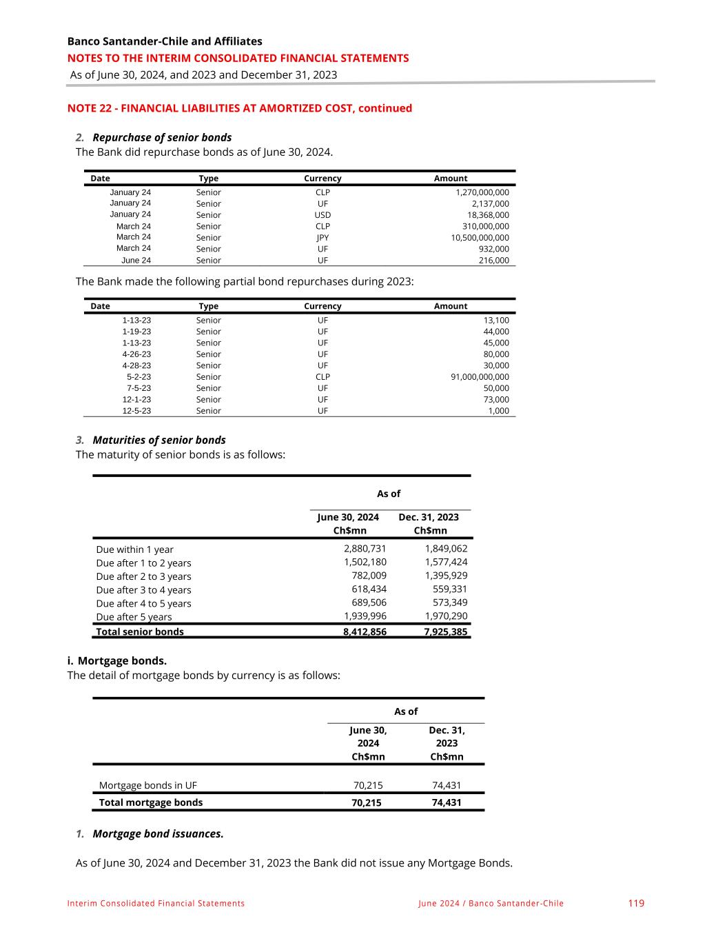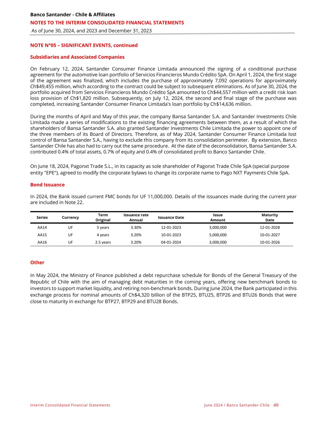 Banco Santander - Chile & Affiliates NOTES TO THE INTERIM CONSOLIDATED FINANCIAL STATEMENTS As of June 30, 2024, and 2023 and December 31, 2023 Interim Consolidated Financial Statements June 2024 / Banco Santander -Chile 49 NOTE N°05 – SIGNIFICANT EVENTS, continued Subsidiaries and Associated Companies On February 12, 2024, Santander Consumer Finance Limitada announced the signing of a conditional purchase agreement for the automotive loan portfolio of Servicios Financieros Mundo Crédito SpA. On April 1, 2024, the first stage of the agreement was finalized, which includes the purchase of approximately 7,092 operations for approximately Ch$49,455 million, which according to the contract could be subject to subsequent eliminations. As of June 30, 2024, the portfolio acquired from Servicios Financieros Mundo Crédito SpA amounted to Ch$44,557 million with a credit risk loan loss provision of Ch$1,820 million. Subsequently, on July 12, 2024, the second and final stage of the purchase was completed, increasing Santander Consumer Finance Limitada's loan portfolio by Ch$14,636 million. During the months of April and May of this year, the company Bansa Santander S.A. and Santander Investments Chile Limitada made a series of modifications to the existing financing agreements between them, as a result of which the shareholders of Bansa Santander S.A. also granted Santander Investments Chile Limitada the power to appoint one of the three members of its Board of Directors. Therefore, as of May 2024, Santander Consumer Finance Limitada lost control of Bansa Santander S.A., having to exclude this company from its consolidation perimeter. By extension, Banco Santander Chile has also had to carry out the same procedure. At the date of the deconsolidation, Bansa Santander S.A. contributed 0.4% of total assets, 0.7% of equity and 0.4% of consolidated profit to Banco Santander Chile. On June 18, 2024, Pagonxt Trade S.L., in its capacity as sole shareholder of Pagonxt Trade Chile SpA (special purpose entity "EPE"), agreed to modify the corporate bylaws to change its corporate name to Pago NXT Payments Chile SpA. Bond Issuance In 2024, the Bank issued current FMC bonds for UF 11,000,000. Details of the issuances made during the current year are included in Note 22. Other In May 2024, the Ministry of Finance published a debt repurchase schedule for Bonds of the General Treasury of the Republic of Chile with the aim of managing debt maturities in the coming years, offering new benchmark bonds to investors to support market liquidity, and retiring non-benchmark bonds. During June 2024, the Bank participated in this exchange process for nominal amounts of Ch$4,320 billion of the BTP25, BTU25, BTP26 and BTU26 Bonds that were close to maturity in exchange for BTP27, BTP29 and BTU28 Bonds. Series Currency Term Original Issuance rate Annual Issuance Date Issue Amount Maturity Date AA14 UF 5 years 3.30% 12-01-2023 3,000,000 12-01-2028 AA15 UF 4 years 3.20% 10-01-2023 5,000,000 10-01-2027 AA16 UF 2.5 years 3.20% 04-01-2024 3,000,000 10-01-2026