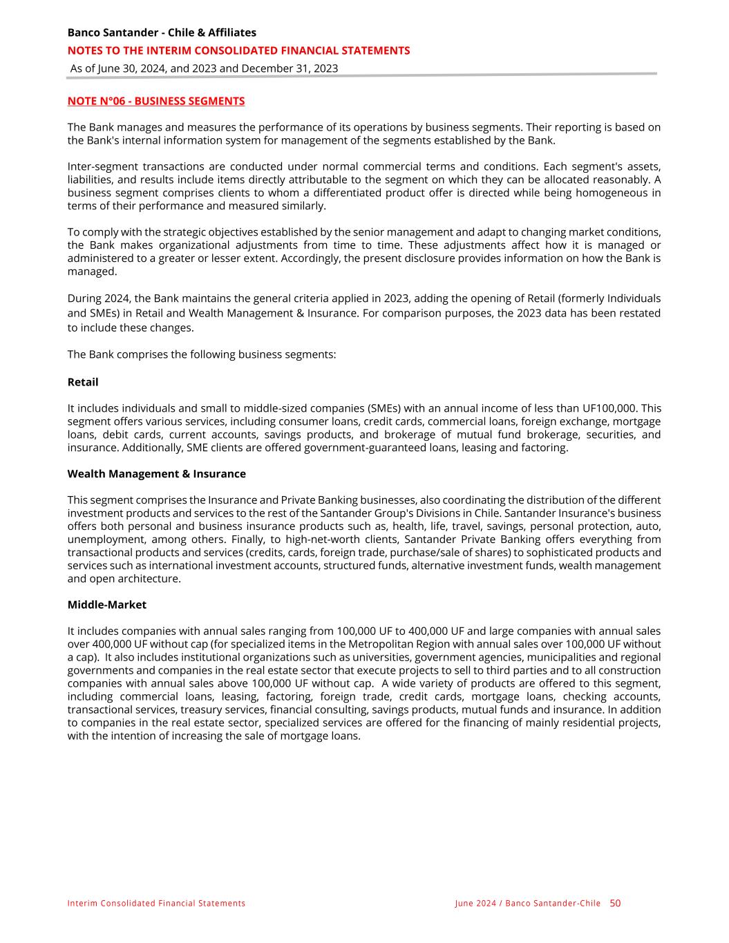 Banco Santander - Chile & Affiliates NOTES TO THE INTERIM CONSOLIDATED FINANCIAL STATEMENTS As of June 30, 2024, and 2023 and December 31, 2023 Interim Consolidated Financial Statements June 2024 / Banco Santander -Chile 50 NOTE N°06 - BUSINESS SEGMENTS The Bank manages and measures the performance of its operations by business segments. Their reporting is based on the Bank's internal information system for management of the segments established by the Bank. Inter-segment transactions are conducted under normal commercial terms and conditions. Each segment's assets, liabilities, and results include items directly attributable to the segment on which they can be allocated reasonably. A business segment comprises clients to whom a differentiated product offer is directed while being homogeneous in terms of their performance and measured similarly. To comply with the strategic objectives established by the senior management and adapt to changing market conditions, the Bank makes organizational adjustments from time to time. These adjustments affect how it is managed or administered to a greater or lesser extent. Accordingly, the present disclosure provides information on how the Bank is managed. During 2024, the Bank maintains the general criteria applied in 2023, adding the opening of Retail (formerly Individuals and SMEs) in Retail and Wealth Management & Insurance. For comparison purposes, the 2023 data has been restated to include these changes. The Bank comprises the following business segments: Retail It includes individuals and small to middle-sized companies (SMEs) with an annual income of less than UF100,000. This segment offers various services, including consumer loans, credit cards, commercial loans, foreign exchange, mortgage loans, debit cards, current accounts, savings products, and brokerage of mutual fund brokerage, securities, and insurance. Additionally, SME clients are offered government-guaranteed loans, leasing and factoring. Wealth Management & Insurance This segment comprises the Insurance and Private Banking businesses, also coordinating the distribution of the different investment products and services to the rest of the Santander Group's Divisions in Chile. Santander Insurance's business offers both personal and business insurance products such as, health, life, travel, savings, personal protection, auto, unemployment, among others. Finally, to high-net-worth clients, Santander Private Banking offers everything from transactional products and services (credits, cards, foreign trade, purchase/sale of shares) to sophisticated products and services such as international investment accounts, structured funds, alternative investment funds, wealth management and open architecture. Middle-Market It includes companies with annual sales ranging from 100,000 UF to 400,000 UF and large companies with annual sales over 400,000 UF without cap (for specialized items in the Metropolitan Region with annual sales over 100,000 UF without a cap). It also includes institutional organizations such as universities, government agencies, municipalities and regional governments and companies in the real estate sector that execute projects to sell to third parties and to all construction companies with annual sales above 100,000 UF without cap. A wide variety of products are offered to this segment, including commercial loans, leasing, factoring, foreign trade, credit cards, mortgage loans, checking accounts, transactional services, treasury services, financial consulting, savings products, mutual funds and insurance. In addition to companies in the real estate sector, specialized services are offered for the financing of mainly residential projects, with the intention of increasing the sale of mortgage loans.