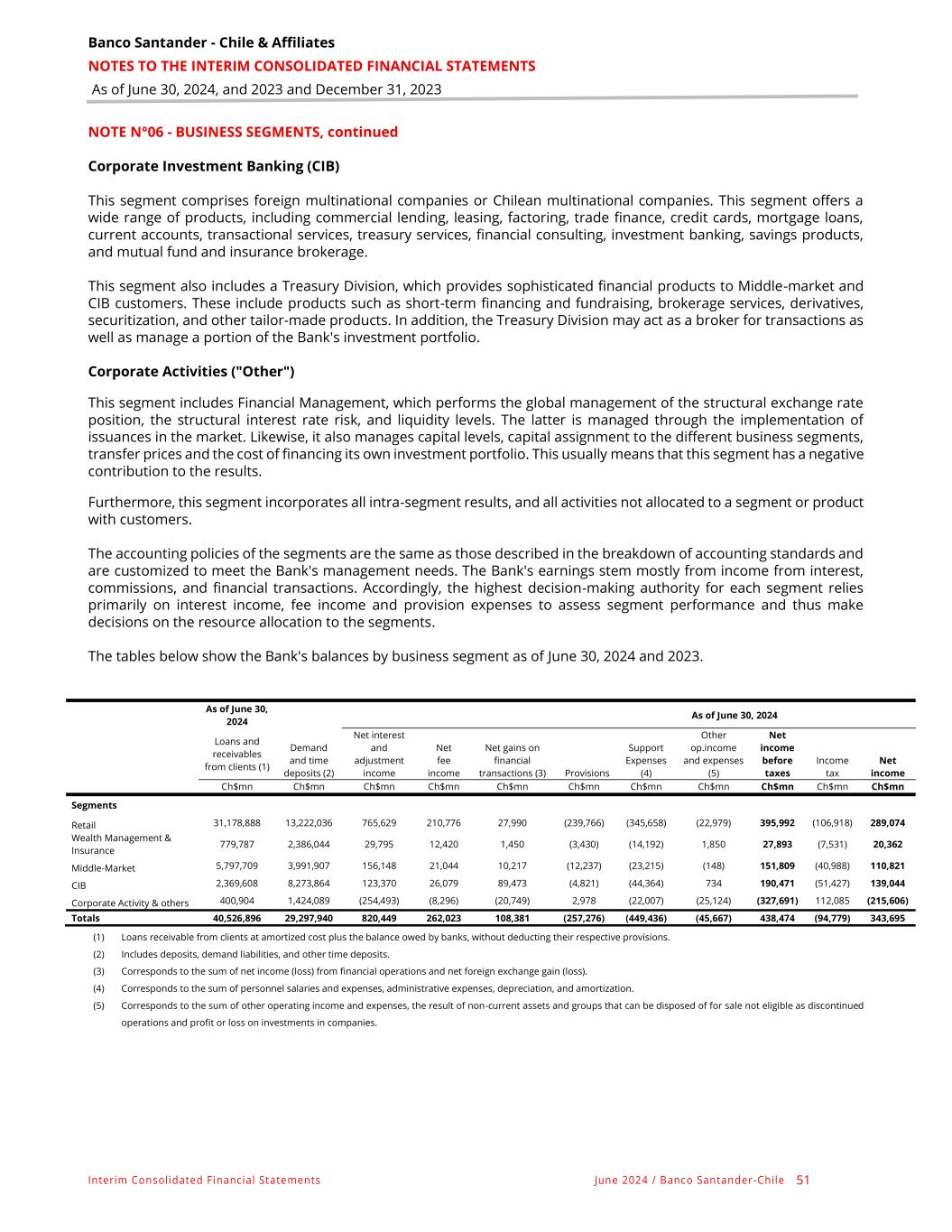 Banco Santander - Chile & Affiliates NOTES TO THE INTERIM CONSOLIDATED FINANCIAL STATEMENTS As of June 30, 2024, and 2023 and December 31, 2023 Interim Consolidated Financial Statements June 2024 / Banco Santander -Chile 51 NOTE N°06 - BUSINESS SEGMENTS, continued Corporate Investment Banking (CIB) This segment comprises foreign multinational companies or Chilean multinational companies. This segment offers a wide range of products, including commercial lending, leasing, factoring, trade finance, credit cards, mortgage loans, current accounts, transactional services, treasury services, financial consulting, investment banking, savings products, and mutual fund and insurance brokerage. This segment also includes a Treasury Division, which provides sophisticated financial products to Middle-market and CIB customers. These include products such as short-term financing and fundraising, brokerage services, derivatives, securitization, and other tailor-made products. In addition, the Treasury Division may act as a broker for transactions as well as manage a portion of the Bank's investment portfolio. Corporate Activities ("Other") This segment includes Financial Management, which performs the global management of the structural exchange rate position, the structural interest rate risk, and liquidity levels. The latter is managed through the implementation of issuances in the market. Likewise, it also manages capital levels, capital assignment to the different business segments, transfer prices and the cost of financing its own investment portfolio. This usually means that this segment has a negative contribution to the results. Furthermore, this segment incorporates all intra-segment results, and all activities not allocated to a segment or product with customers. The accounting policies of the segments are the same as those described in the breakdown of accounting standards and are customized to meet the Bank's management needs. The Bank's earnings stem mostly from income from interest, commissions, and financial transactions. Accordingly, the highest decision-making authority for each segment relies primarily on interest income, fee income and provision expenses to assess segment performance and thus make decisions on the resource allocation to the segments. The tables below show the Bank's balances by business segment as of June 30, 2024 and 2023. As of June 30, 2024 As of June 30, 2024 Loans and receivables from clients (1) Demand and time deposits (2) Net interest and adjustment income Net fee income Net gains on financial transactions (3) Provisions Support Expenses (4) Other op.income and expenses (5) Net income before taxes Income tax Net income Ch$mn Ch$mn Ch$mn Ch$mn Ch$mn Ch$mn Ch$mn Ch$mn Ch$mn Ch$mn Ch$mn Segments Retail 31,178,888 13,222,036 765,629 210,776 27,990 (239,766) (345,658) (22,979) 395,992 (106,918) 289,074 Wealth Management & Insurance 779,787 2,386,044 29,795 12,420 1,450 (3,430) (14,192) 1,850 27,893 (7,531) 20,362 Middle-Market 5,797,709 3,991,907 156,148 21,044 10,217 (12,237) (23,215) (148) 151,809 (40,988) 110,821 CIB 2,369,608 8,273,864 123,370 26,079 89,473 (4,821) (44,364) 734 190,471 (51,427) 139,044 Corporate Activity & others 400,904 1,424,089 (254,493) (8,296) (20,749) 2,978 (22,007) (25,124) (327,691) 112,085 (215,606) Totals 40,526,896 29,297,940 820,449 262,023 108,381 (257,276) (449,436) (45,667) 438,474 (94,779) 343,695 (1) Loans receivable from clients at amortized cost plus the balance owed by banks, without deducting their respective provisions. (2) Includes deposits, demand liabilities, and other time deposits. (3) Corresponds to the sum of net income (loss) from financial operations and net foreign exchange gain (loss). (4) Corresponds to the sum of personnel salaries and expenses, administrative expenses, depreciation, and amortization. (5) Corresponds to the sum of other operating income and expenses, the result of non-current assets and groups that can be disposed of for sale not eligible as discontinued operations and profit or loss on investments in companies.