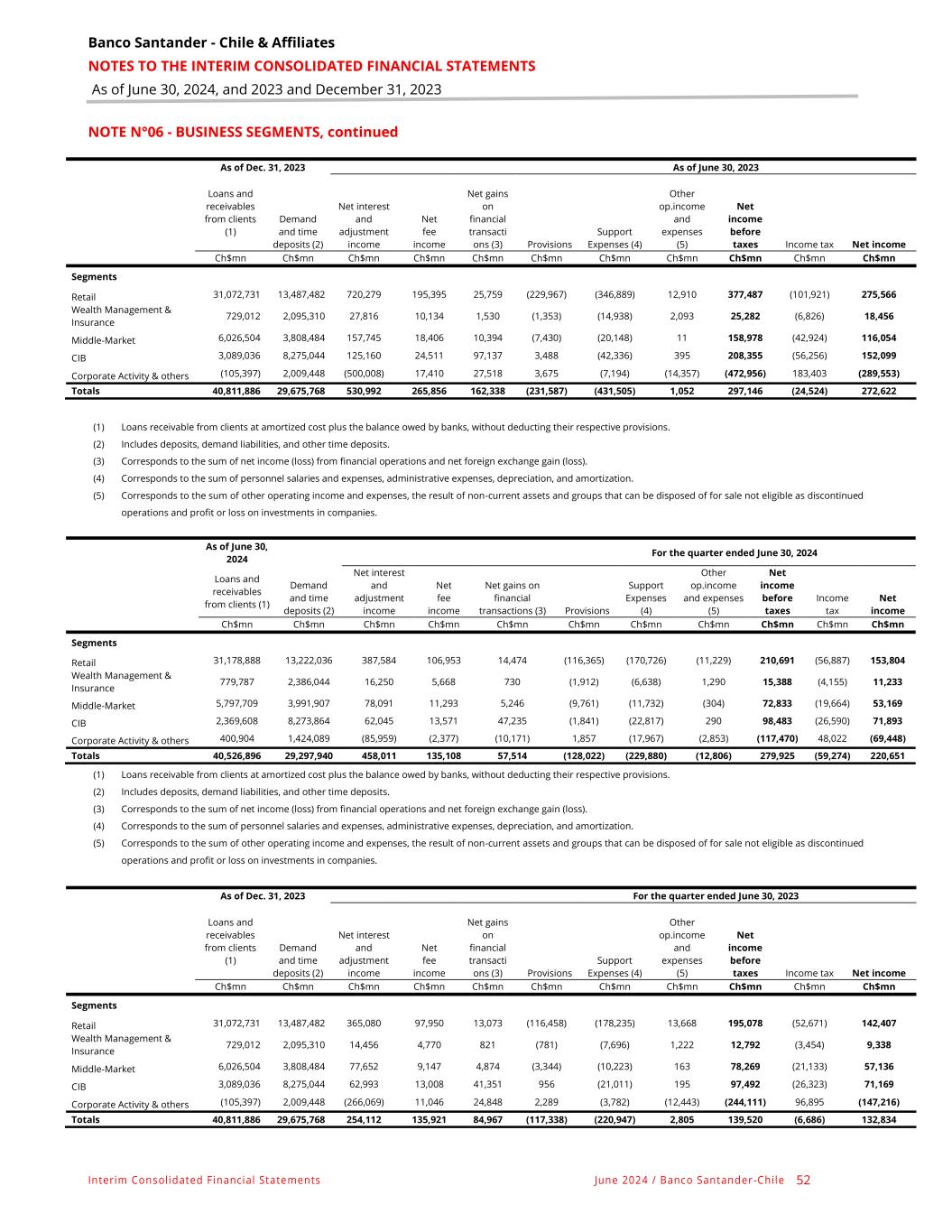 Banco Santander - Chile & Affiliates NOTES TO THE INTERIM CONSOLIDATED FINANCIAL STATEMENTS As of June 30, 2024, and 2023 and December 31, 2023 Interim Consolidated Financial Statements June 2024 / Banco Santander -Chile 52 NOTE N°06 - BUSINESS SEGMENTS, continued As of Dec. 31, 2023 As of June 30, 2023 Loans and receivables from clients (1) Demand and time deposits (2) Net interest and adjustment income Net fee income Net gains on financial transacti ons (3) Provisions Support Expenses (4) Other op.income and expenses (5) Net income before taxes Income tax Net income Ch$mn Ch$mn Ch$mn Ch$mn Ch$mn Ch$mn Ch$mn Ch$mn Ch$mn Ch$mn Ch$mn Segments Retail 31,072,731 13,487,482 720,279 195,395 25,759 (229,967) (346,889) 12,910 377,487 (101,921) 275,566 Wealth Management & Insurance 729,012 2,095,310 27,816 10,134 1,530 (1,353) (14,938) 2,093 25,282 (6,826) 18,456 Middle-Market 6,026,504 3,808,484 157,745 18,406 10,394 (7,430) (20,148) 11 158,978 (42,924) 116,054 CIB 3,089,036 8,275,044 125,160 24,511 97,137 3,488 (42,336) 395 208,355 (56,256) 152,099 Corporate Activity & others (105,397) 2,009,448 (500,008) 17,410 27,518 3,675 (7,194) (14,357) (472,956) 183,403 (289,553) Totals 40,811,886 29,675,768 530,992 265,856 162,338 (231,587) (431,505) 1,052 297,146 (24,524) 272,622 (1) Loans receivable from clients at amortized cost plus the balance owed by banks, without deducting their respective provisions. (2) Includes deposits, demand liabilities, and other time deposits. (3) Corresponds to the sum of net income (loss) from financial operations and net foreign exchange gain (loss). (4) Corresponds to the sum of personnel salaries and expenses, administrative expenses, depreciation, and amortization. (5) Corresponds to the sum of other operating income and expenses, the result of non-current assets and groups that can be disposed of for sale not eligible as discontinued operations and profit or loss on investments in companies. As of June 30, 2024 For the quarter ended June 30, 2024 Loans and receivables from clients (1) Demand and time deposits (2) Net interest and adjustment income Net fee income Net gains on financial transactions (3) Provisions Support Expenses (4) Other op.income and expenses (5) Net income before taxes Income tax Net income Ch$mn Ch$mn Ch$mn Ch$mn Ch$mn Ch$mn Ch$mn Ch$mn Ch$mn Ch$mn Ch$mn Segments Retail 31,178,888 13,222,036 387,584 106,953 14,474 (116,365) (170,726) (11,229) 210,691 (56,887) 153,804 Wealth Management & Insurance 779,787 2,386,044 16,250 5,668 730 (1,912) (6,638) 1,290 15,388 (4,155) 11,233 Middle-Market 5,797,709 3,991,907 78,091 11,293 5,246 (9,761) (11,732) (304) 72,833 (19,664) 53,169 CIB 2,369,608 8,273,864 62,045 13,571 47,235 (1,841) (22,817) 290 98,483 (26,590) 71,893 Corporate Activity & others 400,904 1,424,089 (85,959) (2,377) (10,171) 1,857 (17,967) (2,853) (117,470) 48,022 (69,448) Totals 40,526,896 29,297,940 458,011 135,108 57,514 (128,022) (229,880) (12,806) 279,925 (59,274) 220,651 (1) Loans receivable from clients at amortized cost plus the balance owed by banks, without deducting their respective provisions. (2) Includes deposits, demand liabilities, and other time deposits. (3) Corresponds to the sum of net income (loss) from financial operations and net foreign exchange gain (loss). (4) Corresponds to the sum of personnel salaries and expenses, administrative expenses, depreciation, and amortization. (5) Corresponds to the sum of other operating income and expenses, the result of non-current assets and groups that can be disposed of for sale not eligible as discontinued operations and profit or loss on investments in companies. As of Dec. 31, 2023 For the quarter ended June 30, 2023 Loans and receivables from clients (1) Demand and time deposits (2) Net interest and adjustment income Net fee income Net gains on financial transacti ons (3) Provisions Support Expenses (4) Other op.income and expenses (5) Net income before taxes Income tax Net income Ch$mn Ch$mn Ch$mn Ch$mn Ch$mn Ch$mn Ch$mn Ch$mn Ch$mn Ch$mn Ch$mn Segments Retail 31,072,731 13,487,482 365,080 97,950 13,073 (116,458) (178,235) 13,668 195,078 (52,671) 142,407 Wealth Management & Insurance 729,012 2,095,310 14,456 4,770 821 (781) (7,696) 1,222 12,792 (3,454) 9,338 Middle-Market 6,026,504 3,808,484 77,652 9,147 4,874 (3,344) (10,223) 163 78,269 (21,133) 57,136 CIB 3,089,036 8,275,044 62,993 13,008 41,351 956 (21,011) 195 97,492 (26,323) 71,169 Corporate Activity & others (105,397) 2,009,448 (266,069) 11,046 24,848 2,289 (3,782) (12,443) (244,111) 96,895 (147,216) Totals 40,811,886 29,675,768 254,112 135,921 84,967 (117,338) (220,947) 2,805 139,520 (6,686) 132,834