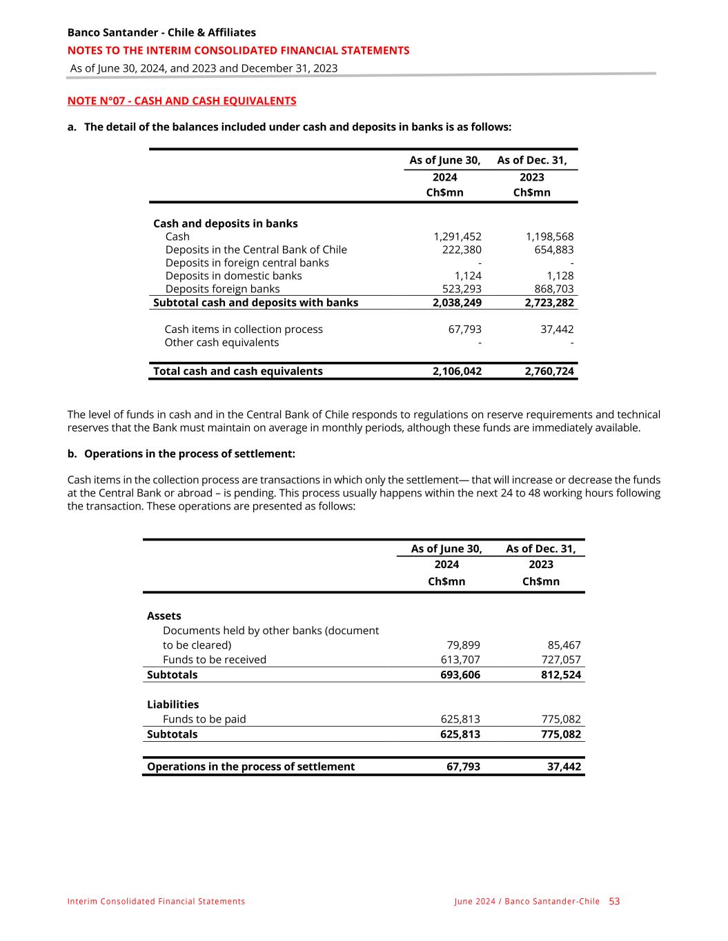 Banco Santander - Chile & Affiliates NOTES TO THE INTERIM CONSOLIDATED FINANCIAL STATEMENTS As of June 30, 2024, and 2023 and December 31, 2023 Interim Consolidated Financial Statements June 2024 / Banco Santander -Chile 53 NOTE N°07 - CASH AND CASH EQUIVALENTS a. The detail of the balances included under cash and deposits in banks is as follows: The level of funds in cash and in the Central Bank of Chile responds to regulations on reserve requirements and technical reserves that the Bank must maintain on average in monthly periods, although these funds are immediately available. b. Operations in the process of settlement: Cash items in the collection process are transactions in which only the settlement— that will increase or decrease the funds at the Central Bank or abroad – is pending. This process usually happens within the next 24 to 48 working hours following the transaction. These operations are presented as follows: As of June 30, As of Dec. 31, 2024 2023 Ch$mn Ch$mn Assets Documents held by other banks (document to be cleared) 79,899 85,467 Funds to be received 613,707 727,057 Subtotals 693,606 812,524 Liabilities Funds to be paid 625,813 775,082 Subtotals 625,813 775,082 Operations in the process of settlement 67,793 37,442 As of June 30, As of Dec. 31, 2024 2023 Ch$mn Ch$mn Cash and deposits in banks Cash 1,291,452 1,198,568 Deposits in the Central Bank of Chile 222,380 654,883 Deposits in foreign central banks - - Deposits in domestic banks 1,124 1,128 Deposits foreign banks 523,293 868,703 Subtotal cash and deposits with banks 2,038,249 2,723,282 Cash items in collection process 67,793 37,442 Other cash equivalents - - Total cash and cash equivalents 2,106,042 2,760,724