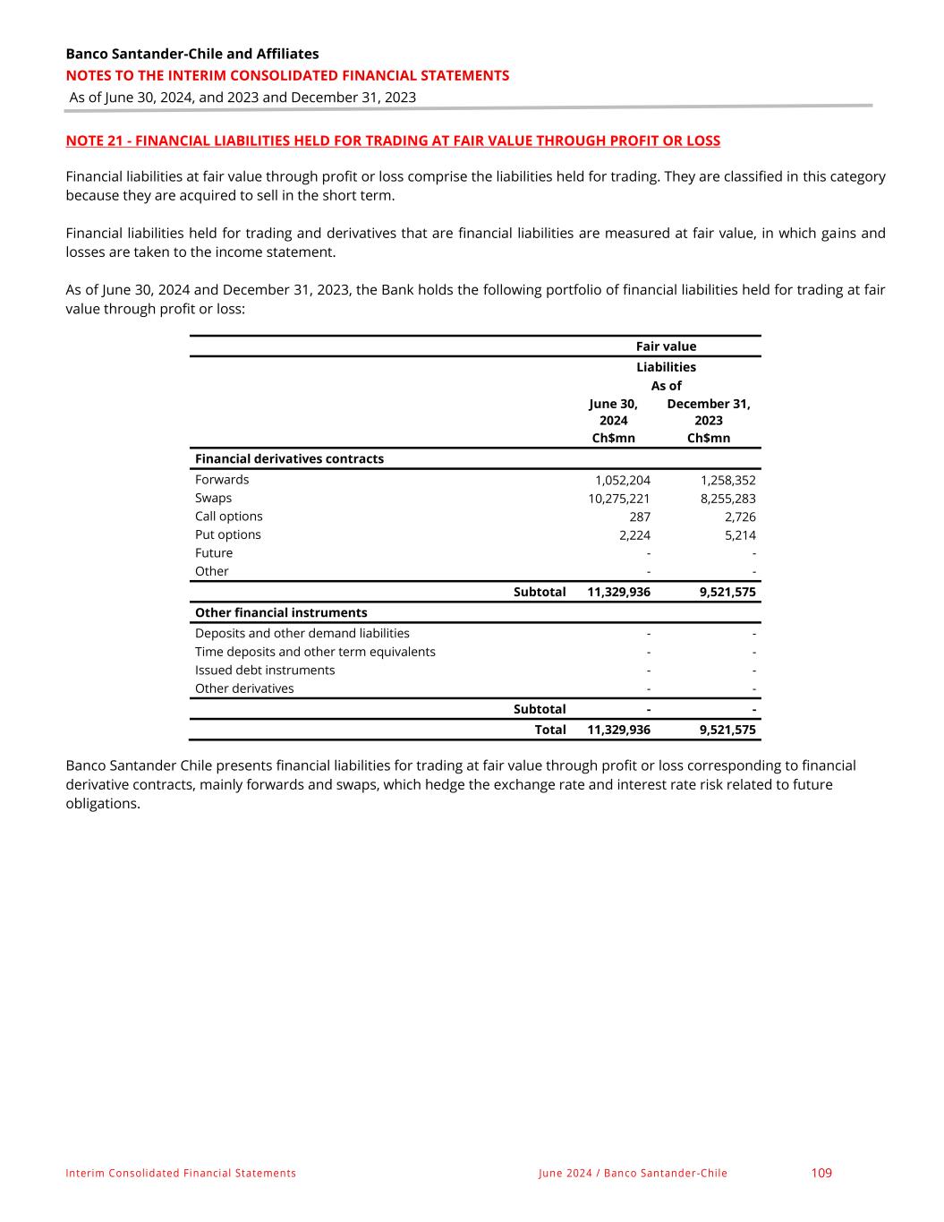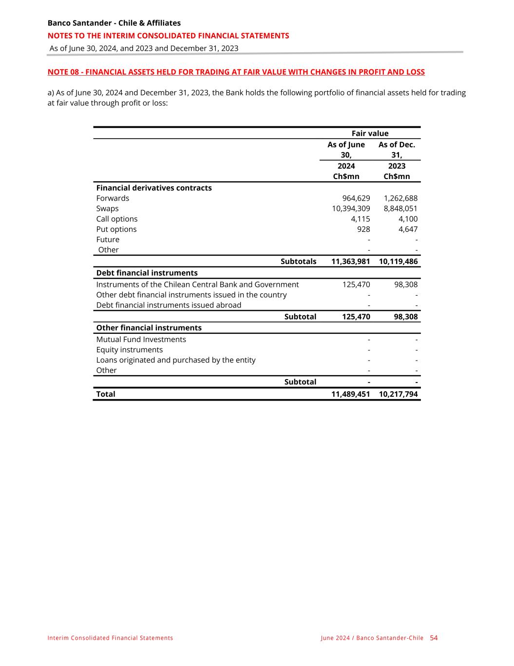 Banco Santander - Chile & Affiliates NOTES TO THE INTERIM CONSOLIDATED FINANCIAL STATEMENTS As of June 30, 2024, and 2023 and December 31, 2023 Interim Consolidated Financial Statements June 2024 / Banco Santander -Chile 54 NOTE 08 - FINANCIAL ASSETS HELD FOR TRADING AT FAIR VALUE WITH CHANGES IN PROFIT AND LOSS a) As of June 30, 2024 and December 31, 2023, the Bank holds the following portfolio of financial assets held for trading at fair value through profit or loss: Fair value As of June 30, As of Dec. 31, 2024 2023 Ch$mn Ch$mn Financial derivatives contracts Forwards 964,629 1,262,688 Swaps 10,394,309 8,848,051 Call options 4,115 4,100 Put options 928 4,647 Future - - Other - - Subtotals 11,363,981 10,119,486 Debt financial instruments Instruments of the Chilean Central Bank and Government 125,470 98,308 Other debt financial instruments issued in the country - - Debt financial instruments issued abroad - - Subtotal 125,470 98,308 Other financial instruments Mutual Fund Investments - - Equity instruments - - Loans originated and purchased by the entity - - Other - - Subtotal - - Total 11,489,451 10,217,794