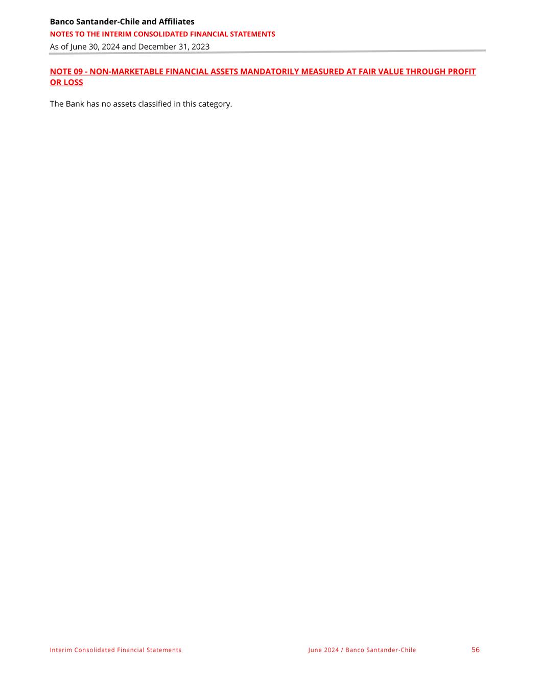 Banco Santander-Chile and Affiliates NOTES TO THE INTERIM CONSOLIDATED FINANCIAL STATEMENTS As of June 30, 2024 and December 31, 2023 Interim Consolidated Financial Statements June 2024 / Banco Santander-Chile 56 NOTE 09 - NON-MARKETABLE FINANCIAL ASSETS MANDATORILY MEASURED AT FAIR VALUE THROUGH PROFIT OR LOSS The Bank has no assets classified in this category.