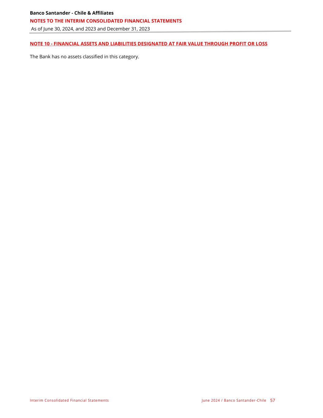Banco Santander - Chile & Affiliates NOTES TO THE INTERIM CONSOLIDATED FINANCIAL STATEMENTS As of June 30, 2024, and 2023 and December 31, 2023 Interim Consolidated Financial Statements June 2024 / Banco Santander -Chile 57 NOTE 10 - FINANCIAL ASSETS AND LIABILITIES DESIGNATED AT FAIR VALUE THROUGH PROFIT OR LOSS The Bank has no assets classified in this category.