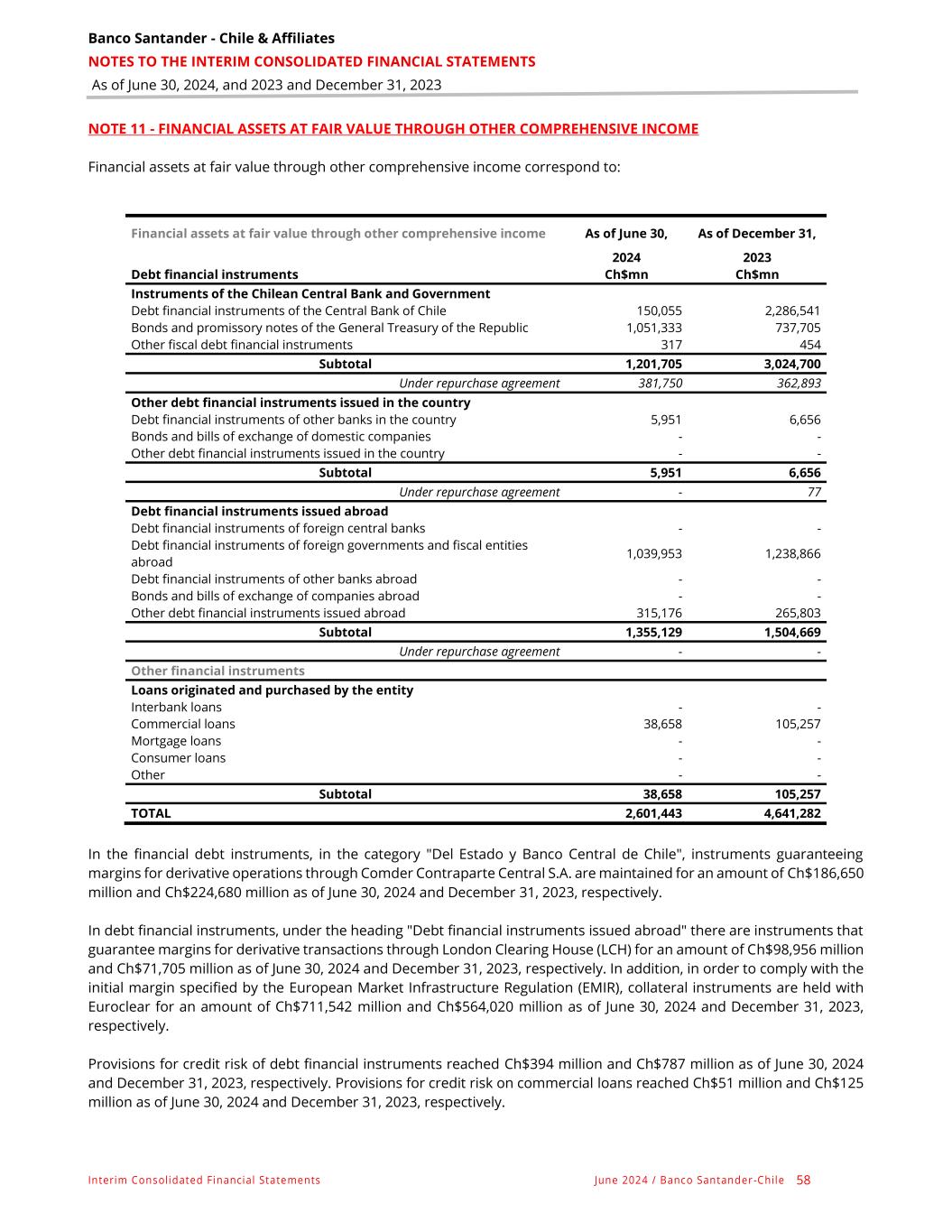 Banco Santander - Chile & Affiliates NOTES TO THE INTERIM CONSOLIDATED FINANCIAL STATEMENTS As of June 30, 2024, and 2023 and December 31, 2023 Interim Consolidated Financial Statements June 2024 / Banco Santander -Chile 58 NOTE 11 - FINANCIAL ASSETS AT FAIR VALUE THROUGH OTHER COMPREHENSIVE INCOME Financial assets at fair value through other comprehensive income correspond to: Financial assets at fair value through other comprehensive income As of June 30, As of December 31, 2024 2023 Debt financial instruments Ch$mn Ch$mn Instruments of the Chilean Central Bank and Government Debt financial instruments of the Central Bank of Chile 150,055 2,286,541 Bonds and promissory notes of the General Treasury of the Republic 1,051,333 737,705 Other fiscal debt financial instruments 317 454 Subtotal 1,201,705 3,024,700 Under repurchase agreement 381,750 362,893 Other debt financial instruments issued in the country Debt financial instruments of other banks in the country 5,951 6,656 Bonds and bills of exchange of domestic companies - - Other debt financial instruments issued in the country - - Subtotal 5,951 6,656 Under repurchase agreement - 77 Debt financial instruments issued abroad Debt financial instruments of foreign central banks - - Debt financial instruments of foreign governments and fiscal entities abroad 1,039,953 1,238,866 Debt financial instruments of other banks abroad - - Bonds and bills of exchange of companies abroad - - Other debt financial instruments issued abroad 315,176 265,803 Subtotal 1,355,129 1,504,669 Under repurchase agreement - - Other financial instruments Loans originated and purchased by the entity Interbank loans - - Commercial loans 38,658 105,257 Mortgage loans - - Consumer loans - - Other - - Subtotal 38,658 105,257 TOTAL 2,601,443 4,641,282 In the financial debt instruments, in the category "Del Estado y Banco Central de Chile", instruments guaranteeing margins for derivative operations through Comder Contraparte Central S.A. are maintained for an amount of Ch$186,650 million and Ch$224,680 million as of June 30, 2024 and December 31, 2023, respectively. In debt financial instruments, under the heading "Debt financial instruments issued abroad" there are instruments that guarantee margins for derivative transactions through London Clearing House (LCH) for an amount of Ch$98,956 million and Ch$71,705 million as of June 30, 2024 and December 31, 2023, respectively. In addition, in order to comply with the initial margin specified by the European Market Infrastructure Regulation (EMIR), collateral instruments are held with Euroclear for an amount of Ch$711,542 million and Ch$564,020 million as of June 30, 2024 and December 31, 2023, respectively. Provisions for credit risk of debt financial instruments reached Ch$394 million and Ch$787 million as of June 30, 2024 and December 31, 2023, respectively. Provisions for credit risk on commercial loans reached Ch$51 million and Ch$125 million as of June 30, 2024 and December 31, 2023, respectively.