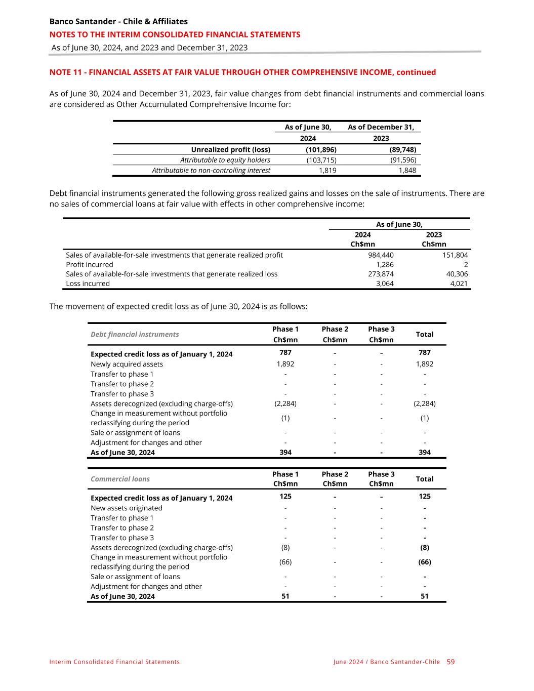 Banco Santander - Chile & Affiliates NOTES TO THE INTERIM CONSOLIDATED FINANCIAL STATEMENTS As of June 30, 2024, and 2023 and December 31, 2023 Interim Consolidated Financial Statements June 2024 / Banco Santander -Chile 59 NOTE 11 - FINANCIAL ASSETS AT FAIR VALUE THROUGH OTHER COMPREHENSIVE INCOME, continued As of June 30, 2024 and December 31, 2023, fair value changes from debt financial instruments and commercial loans are considered as Other Accumulated Comprehensive Income for: As of June 30, As of December 31, 2024 2023 Unrealized profit (loss) (101,896) (89,748) Attributable to equity holders (103,715) (91,596) Attributable to non-controlling interest 1,819 1,848 Debt financial instruments generated the following gross realized gains and losses on the sale of instruments. There are no sales of commercial loans at fair value with effects in other comprehensive income: As of June 30, 2024 2023 Ch$mn Ch$mn Sales of available-for-sale investments that generate realized profit 984,440 151,804 Profit incurred 1,286 2 Sales of available-for-sale investments that generate realized loss 273,874 40,306 Loss incurred 3,064 4,021 The movement of expected credit loss as of June 30, 2024 is as follows: Debt financial instruments Phase 1 Phase 2 Phase 3 Total Ch$mn Ch$mn Ch$mn Expected credit loss as of January 1, 2024 787 - - 787 Newly acquired assets 1,892 - - 1,892 Transfer to phase 1 - - - - Transfer to phase 2 - - - - Transfer to phase 3 - - - - Assets derecognized (excluding charge-offs) (2,284) - - (2,284) Change in measurement without portfolio reclassifying during the period (1) - - (1) Sale or assignment of loans - - - - Adjustment for changes and other - - - - As of June 30, 2024 394 - - 394 Commercial loans Phase 1 Phase 2 Phase 3 Total Ch$mn Ch$mn Ch$mn Expected credit loss as of January 1, 2024 125 - - 125 New assets originated - - - - Transfer to phase 1 - - - - Transfer to phase 2 - - - - Transfer to phase 3 - - - - Assets derecognized (excluding charge-offs) (8) - - (8) Change in measurement without portfolio reclassifying during the period (66) - - (66) Sale or assignment of loans - - - - Adjustment for changes and other - - - - As of June 30, 2024 51 - - 51