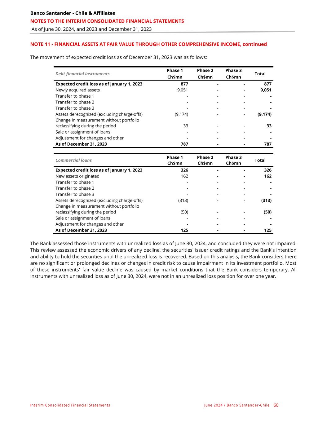 Banco Santander - Chile & Affiliates NOTES TO THE INTERIM CONSOLIDATED FINANCIAL STATEMENTS As of June 30, 2024, and 2023 and December 31, 2023 Interim Consolidated Financial Statements June 2024 / Banco Santander -Chile 60 NOTE 11 - FINANCIAL ASSETS AT FAIR VALUE THROUGH OTHER COMPREHENSIVE INCOME, continued The movement of expected credit loss as of December 31, 2023 was as follows: Debt financial instruments Phase 1 Phase 2 Phase 3 Total Ch$mn Ch$mn Ch$mn Expected credit loss as of January 1, 2023 877 - - 877 Newly acquired assets 9,051 - - 9,051 Transfer to phase 1 - - - - Transfer to phase 2 - - - - Transfer to phase 3 - - - - Assets derecognized (excluding charge-offs) (9,174) - - (9,174) Change in measurement without portfolio reclassifying during the period 33 - - 33 Sale or assignment of loans - - - - Adjustment for changes and other - - - - As of December 31, 2023 787 - - 787 Commercial loans Phase 1 Phase 2 Phase 3 Total Ch$mn Ch$mn Ch$mn Expected credit loss as of January 1, 2023 326 - - 326 New assets originated 162 - - 162 Transfer to phase 1 - - - - Transfer to phase 2 - - - - Transfer to phase 3 - - - - Assets derecognized (excluding charge-offs) (313) - - (313) Change in measurement without portfolio reclassifying during the period (50) - - (50) Sale or assignment of loans - - - - Adjustment for changes and other - - - - As of December 31, 2023 125 - - 125 The Bank assessed those instruments with unrealized loss as of June 30, 2024, and concluded they were not impaired. This review assessed the economic drivers of any decline, the securities' issuer credit ratings and the Bank's intention and ability to hold the securities until the unrealized loss is recovered. Based on this analysis, the Bank considers there are no significant or prolonged declines or changes in credit risk to cause impairment in its investment portfolio. Most of these instruments' fair value decline was caused by market conditions that the Bank considers temporary. All instruments with unrealized loss as of June 30, 2024, were not in an unrealized loss position for over one year.