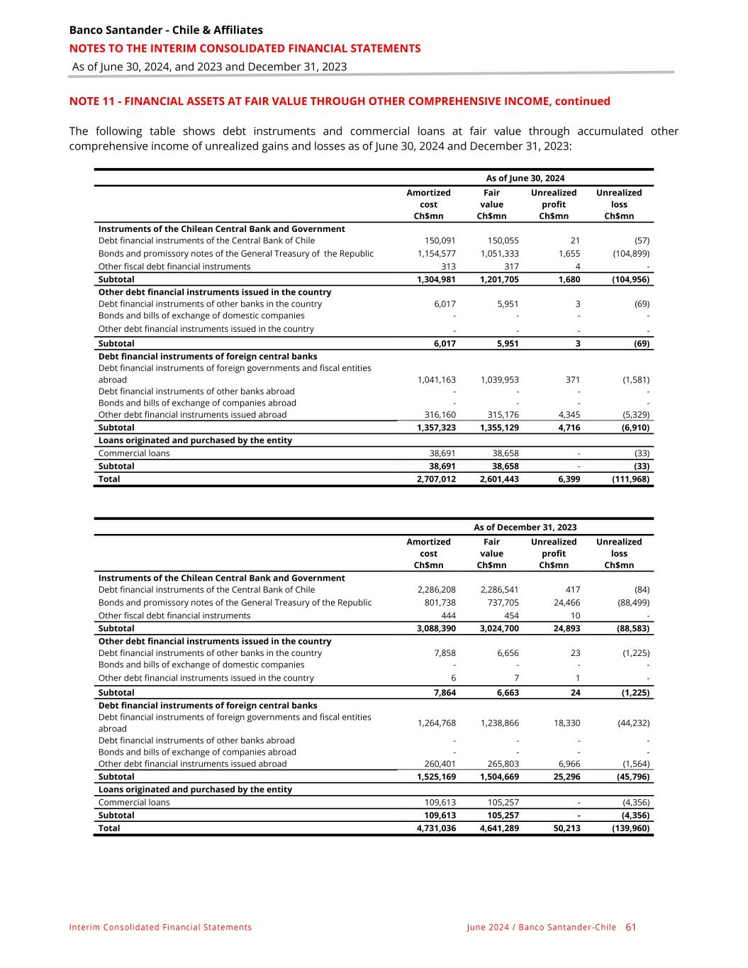 Banco Santander - Chile & Affiliates NOTES TO THE INTERIM CONSOLIDATED FINANCIAL STATEMENTS As of June 30, 2024, and 2023 and December 31, 2023 Interim Consolidated Financial Statements June 2024 / Banco Santander -Chile 61 NOTE 11 - FINANCIAL ASSETS AT FAIR VALUE THROUGH OTHER COMPREHENSIVE INCOME, continued The following table shows debt instruments and commercial loans at fair value through accumulated other comprehensive income of unrealized gains and losses as of June 30, 2024 and December 31, 2023: As of June 30, 2024 Amortized Fair Unrealized Unrealized cost value profit loss Ch$mn Ch$mn Ch$mn Ch$mn Instruments of the Chilean Central Bank and Government Debt financial instruments of the Central Bank of Chile 150,091 150,055 21 (57) Bonds and promissory notes of the General Treasury of the Republic 1,154,577 1,051,333 1,655 (104,899) Other fiscal debt financial instruments 313 317 4 - Subtotal 1,304,981 1,201,705 1,680 (104,956) Other debt financial instruments issued in the country Debt financial instruments of other banks in the country 6,017 5,951 3 (69) Bonds and bills of exchange of domestic companies - - - - Other debt financial instruments issued in the country - - - - Subtotal 6,017 5,951 3 (69) Debt financial instruments of foreign central banks Debt financial instruments of foreign governments and fiscal entities abroad 1,041,163 1,039,953 371 (1,581) Debt financial instruments of other banks abroad - - - - Bonds and bills of exchange of companies abroad - - - - Other debt financial instruments issued abroad 316,160 315,176 4,345 (5,329) Subtotal 1,357,323 1,355,129 4,716 (6,910) Loans originated and purchased by the entity Commercial loans 38,691 38,658 - (33) Subtotal 38,691 38,658 - (33) Total 2,707,012 2,601,443 6,399 (111,968) As of December 31, 2023 Amortized Fair Unrealized Unrealized cost value profit loss Ch$mn Ch$mn Ch$mn Ch$mn Instruments of the Chilean Central Bank and Government Debt financial instruments of the Central Bank of Chile 2,286,208 2,286,541 417 (84) Bonds and promissory notes of the General Treasury of the Republic 801,738 737,705 24,466 (88,499) Other fiscal debt financial instruments 444 454 10 - Subtotal 3,088,390 3,024,700 24,893 (88,583) Other debt financial instruments issued in the country Debt financial instruments of other banks in the country 7,858 6,656 23 (1,225) Bonds and bills of exchange of domestic companies - - - - Other debt financial instruments issued in the country 6 7 1 - Subtotal 7,864 6,663 24 (1,225) Debt financial instruments of foreign central banks Debt financial instruments of foreign governments and fiscal entities abroad 1,264,768 1,238,866 18,330 (44,232) Debt financial instruments of other banks abroad - - - - Bonds and bills of exchange of companies abroad - - - - Other debt financial instruments issued abroad 260,401 265,803 6,966 (1,564) Subtotal 1,525,169 1,504,669 25,296 (45,796) Loans originated and purchased by the entity Commercial loans 109,613 105,257 - (4,356) Subtotal 109,613 105,257 - (4,356) Total 4,731,036 4,641,289 50,213 (139,960)