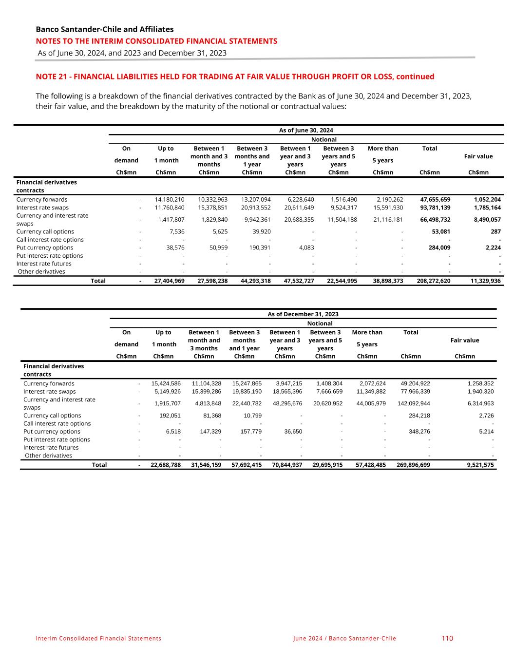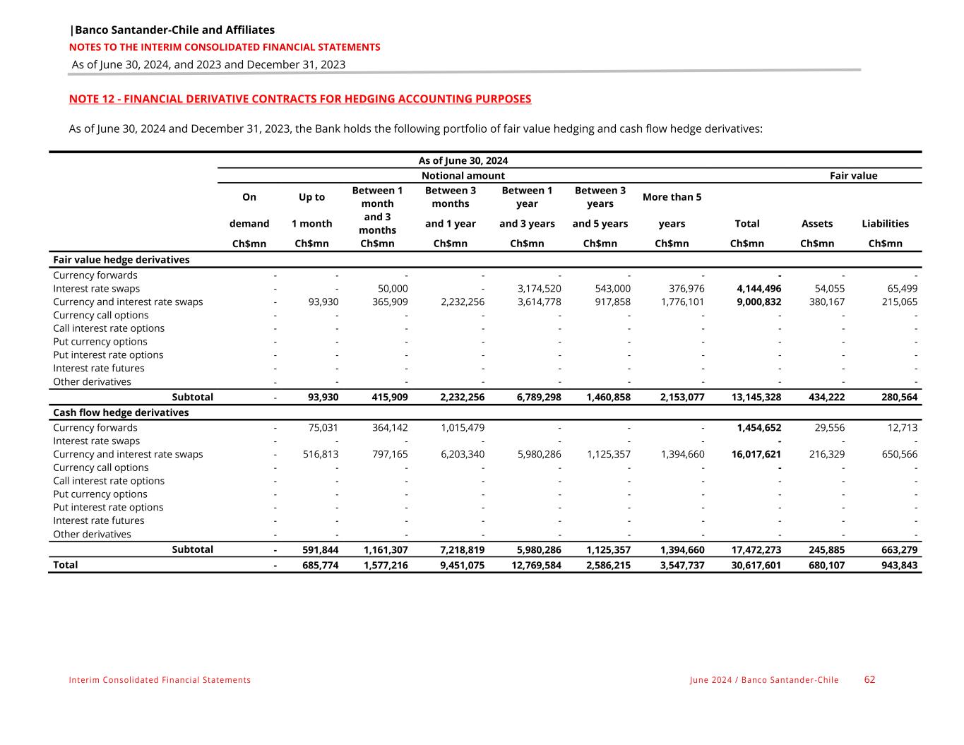 |Banco Santander-Chile and Affiliates NOTES TO THE INTERIM CONSOLIDATED FINANCIAL STATEMENTS As of June 30, 2024, and 2023 and December 31, 2023 Interim Consolidated Financial Statements June 2024 / Banco Santander -Chile 62 NOTE 12 - FINANCIAL DERIVATIVE CONTRACTS FOR HEDGING ACCOUNTING PURPOSES As of June 30, 2024 and December 31, 2023, the Bank holds the following portfolio of fair value hedging and cash flow hedge derivatives: As of June 30, 2024 Notional amount Fair value On Up to Between 1 month Between 3 months Between 1 year Between 3 years More than 5 demand 1 month and 3 months and 1 year and 3 years and 5 years years Total Assets Liabilities Ch$mn Ch$mn Ch$mn Ch$mn Ch$mn Ch$mn Ch$mn Ch$mn Ch$mn Ch$mn Fair value hedge derivatives Currency forwards - - - - - - - - - - Interest rate swaps - - 50,000 - 3,174,520 543,000 376,976 4,144,496 54,055 65,499 Currency and interest rate swaps - 93,930 365,909 2,232,256 3,614,778 917,858 1,776,101 9,000,832 380,167 215,065 Currency call options - - - - - - - - - - Call interest rate options - - - - - - - - - - Put currency options - - - - - - - - - - Put interest rate options - - - - - - - - - - Interest rate futures - - - - - - - - - - Other derivatives - - - - - - - - - - Subtotal - 93,930 415,909 2,232,256 6,789,298 1,460,858 2,153,077 13,145,328 434,222 280,564 Cash flow hedge derivatives Currency forwards - 75,031 364,142 1,015,479 - - - 1,454,652 29,556 12,713 Interest rate swaps - - - - - - - - - - Currency and interest rate swaps - 516,813 797,165 6,203,340 5,980,286 1,125,357 1,394,660 16,017,621 216,329 650,566 Currency call options - - - - - - - - - - Call interest rate options - - - - - - - - - - Put currency options - - - - - - - - - - Put interest rate options - - - - - - - - - - Interest rate futures - - - - - - - - - - Other derivatives - - - - - - - - - - Subtotal - 591,844 1,161,307 7,218,819 5,980,286 1,125,357 1,394,660 17,472,273 245,885 663,279 Total - 685,774 1,577,216 9,451,075 12,769,584 2,586,215 3,547,737 30,617,601 680,107 943,843