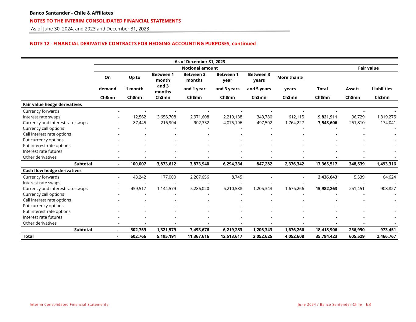 Banco Santander - Chile & Affiliates NOTES TO THE INTERIM CONSOLIDATED FINANCIAL STATEMENTS As of June 30, 2024, and 2023 and December 31, 2023 Interim Consolidated Financial Statements June 2024 / Banco Santander -Chile 63 NOTE 12 - FINANCIAL DERIVATIVE CONTRACTS FOR HEDGING ACCOUNTING PURPOSES, continued As of December 31, 2023 Notional amount Fair value On Up to Between 1 month Between 3 months Between 1 year Between 3 years More than 5 demand 1 month and 3 months and 1 year and 3 years and 5 years years Total Assets Liabilities Ch$mn Ch$mn Ch$mn Ch$mn Ch$mn Ch$mn Ch$mn Ch$mn Ch$mn Ch$mn Fair value hedge derivatives Currency forwards - - - - - - - - - - Interest rate swaps - 12,562 3,656,708 2,971,608 2,219,138 349,780 612,115 9,821,911 96,729 1,319,275 Currency and interest rate swaps - 87,445 216,904 902,332 4,075,196 497,502 1,764,227 7,543,606 251,810 174,041 Currency call options - - - - - - - - - - Call interest rate options - - - - - - - - - - Put currency options - - - - - - - - - - Put interest rate options - - - - - - - - - - Interest rate futures - - - - - - - - - - Other derivatives - - - - - - - - - - Subtotal - 100,007 3,873,612 3,873,940 6,294,334 847,282 2,376,342 17,365,517 348,539 1,493,316 Cash flow hedge derivatives Currency forwards - 43,242 177,000 2,207,656 8,745 - - 2,436,643 5,539 64,624 Interest rate swaps - - - - - - - - - - Currency and interest rate swaps - 459,517 1,144,579 5,286,020 6,210,538 1,205,343 1,676,266 15,982,263 251,451 908,827 Currency call options - - - - - - - - - - Call interest rate options - - - - - - - - - - Put currency options - - - - - - - - - - Put interest rate options - - - - - - - - - - Interest rate futures - - - - - - - - - - Other derivatives - - - - - - - - - - Subtotal - 502,759 1,321,579 7,493,676 6,219,283 1,205,343 1,676,266 18,418,906 256,990 973,451 Total - 602,766 5,195,191 11,367,616 12,513,617 2,052,625 4,052,608 35,784,423 605,529 2,466,767