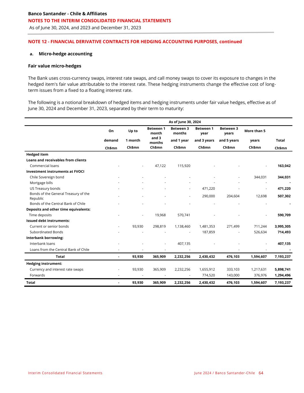 Banco Santander - Chile & Affiliates NOTES TO THE INTERIM CONSOLIDATED FINANCIAL STATEMENTS As of June 30, 2024, and 2023 and December 31, 2023 Interim Consolidated Financial Statements June 2024 / Banco Santander -Chile 64 NOTE 12 - FINANCIAL DERIVATIVE CONTRACTS FOR HEDGING ACCOUNTING PURPOSES, continued a. Micro-hedge accounting Fair value micro-hedges The Bank uses cross-currency swaps, interest rate swaps, and call money swaps to cover its exposure to changes in the hedged item's fair value attributable to the interest rate. These hedging instruments change the effective cost of long- term issues from a fixed to a floating interest rate. The following is a notional breakdown of hedged items and hedging instruments under fair value hedges, effective as of June 30, 2024 and December 31, 2023, separated by their term to maturity: As of June 30, 2024 On Up to Between 1 month Between 3 months Between 1 year Between 3 years More than 5 demand 1 month and 3 months and 1 year and 3 years and 5 years years Total Ch$mn Ch$mn Ch$mn Ch$mn Ch$mn Ch$mn Ch$mn Ch$mn Hedged item Loans and receivables from clients Commercial loans - - 47,122 115,920 - - - 163,042 Investment instruments at FVOCI Chile Sovereign bond - - - - - - 344,031 344,031 Mortgage bills - - - - - - - - US Treasury bonds - - - - 471,220 - - 471,220 Bonds of the General Treasury of the Republic - - - - 290,000 204,604 12,698 507,302 Bonds of the Central Bank of Chile - - - - - - - - Deposits and other time equivalents: Time deposits - - 19,968 570,741 - - - 590,709 Issued debt instruments: Current or senior bonds - 93,930 298,819 1,138,460 1,481,353 271,499 711,244 3,995,305 Subordinated Bonds - - - - 187,859 - 526,634 714,493 Interbank borrowing: Interbank loans - - - 407,135 - - - 407,135 Loans from the Central Bank of Chile - - - - - - - Total - 93,930 365,909 2,232,256 2,430,432 476,103 1,594,607 7,193,237 Hedging instrument: Currency and interest rate swaps - 93,930 365,909 2,232,256 1,655,912 333,103 1,217,631 5,898,741 Forwards - - - - 774,520 143,000 376,976 1,294,496 Total - 93,930 365,909 2,232,256 2,430,432 476,103 1,594,607 7,193,237