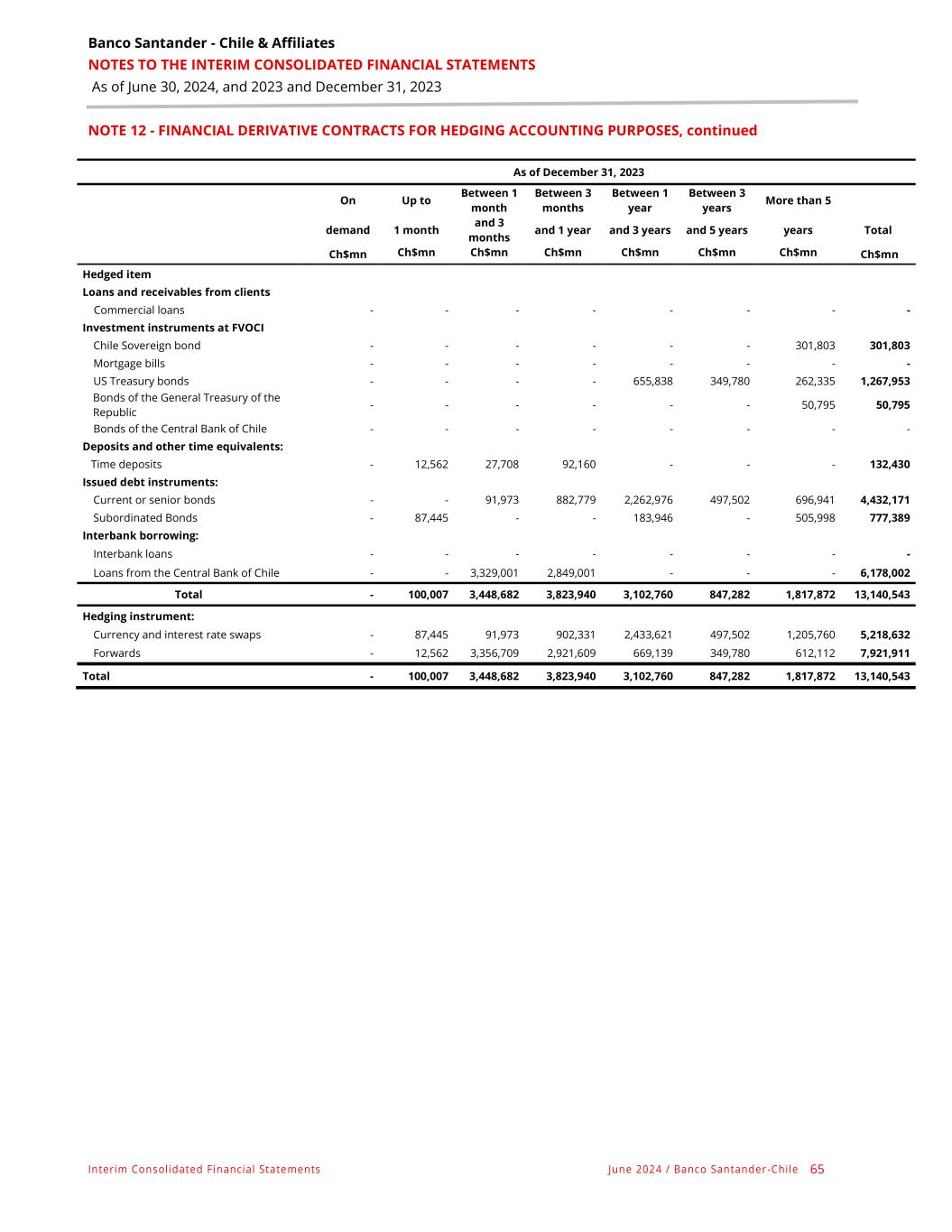 Banco Santander - Chile & Affiliates NOTES TO THE INTERIM CONSOLIDATED FINANCIAL STATEMENTS As of June 30, 2024, and 2023 and December 31, 2023 Interim Consolidated Financial Statements June 2024 / Banco Santander -Chile 65 NOTE 12 - FINANCIAL DERIVATIVE CONTRACTS FOR HEDGING ACCOUNTING PURPOSES, continued As of December 31, 2023 On Up to Between 1 month Between 3 months Between 1 year Between 3 years More than 5 demand 1 month and 3 months and 1 year and 3 years and 5 years years Total Ch$mn Ch$mn Ch$mn Ch$mn Ch$mn Ch$mn Ch$mn Ch$mn Hedged item Loans and receivables from clients Commercial loans - - - - - - - - Investment instruments at FVOCI Chile Sovereign bond - - - - - - 301,803 301,803 Mortgage bills - - - - - - - - US Treasury bonds - - - - 655,838 349,780 262,335 1,267,953 Bonds of the General Treasury of the Republic - - - - - - 50,795 50,795 Bonds of the Central Bank of Chile - - - - - - - - Deposits and other time equivalents: Time deposits - 12,562 27,708 92,160 - - - 132,430 Issued debt instruments: Current or senior bonds - - 91,973 882,779 2,262,976 497,502 696,941 4,432,171 Subordinated Bonds - 87,445 - - 183,946 - 505,998 777,389 Interbank borrowing: Interbank loans - - - - - - - - Loans from the Central Bank of Chile - - 3,329,001 2,849,001 - - - 6,178,002 Total - 100,007 3,448,682 3,823,940 3,102,760 847,282 1,817,872 13,140,543 Hedging instrument: Currency and interest rate swaps - 87,445 91,973 902,331 2,433,621 497,502 1,205,760 5,218,632 Forwards - 12,562 3,356,709 2,921,609 669,139 349,780 612,112 7,921,911 Total - 100,007 3,448,682 3,823,940 3,102,760 847,282 1,817,872 13,140,543