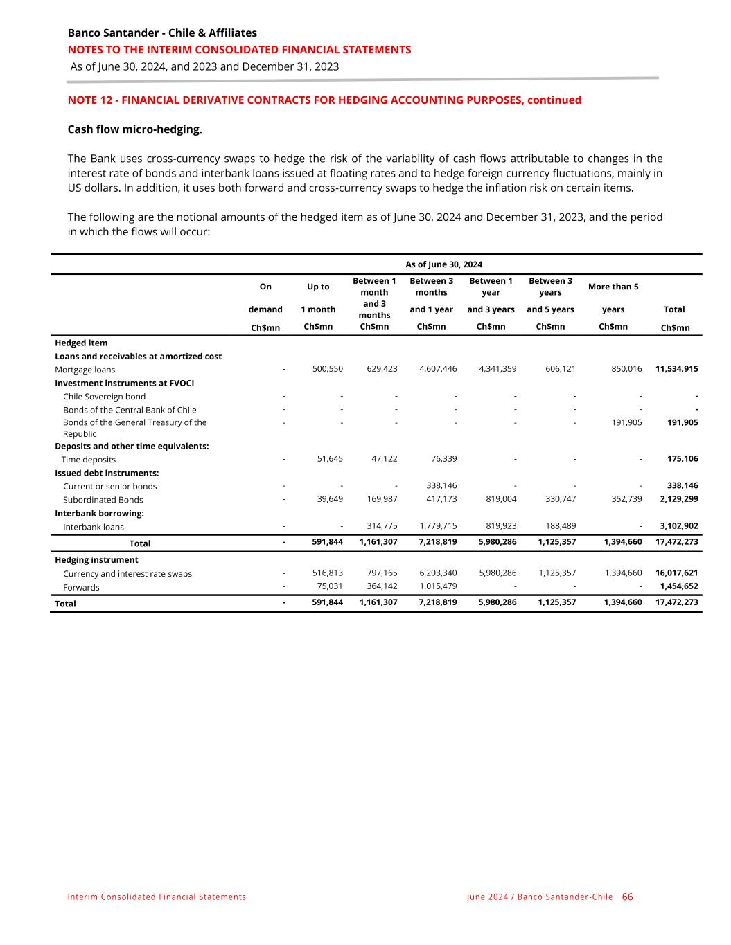 Banco Santander - Chile & Affiliates NOTES TO THE INTERIM CONSOLIDATED FINANCIAL STATEMENTS As of June 30, 2024, and 2023 and December 31, 2023 Interim Consolidated Financial Statements June 2024 / Banco Santander -Chile 66 NOTE 12 - FINANCIAL DERIVATIVE CONTRACTS FOR HEDGING ACCOUNTING PURPOSES, continued Cash flow micro-hedging. The Bank uses cross-currency swaps to hedge the risk of the variability of cash flows attributable to changes in the interest rate of bonds and interbank loans issued at floating rates and to hedge foreign currency fluctuations, mainly in US dollars. In addition, it uses both forward and cross-currency swaps to hedge the inflation risk on certain items. The following are the notional amounts of the hedged item as of June 30, 2024 and December 31, 2023, and the period in which the flows will occur: As of June 30, 2024 On Up to Between 1 month Between 3 months Between 1 year Between 3 years More than 5 demand 1 month and 3 months and 1 year and 3 years and 5 years years Total Ch$mn Ch$mn Ch$mn Ch$mn Ch$mn Ch$mn Ch$mn Ch$mn Hedged item Loans and receivables at amortized cost Mortgage loans - 500,550 629,423 4,607,446 4,341,359 606,121 850,016 11,534,915 Investment instruments at FVOCI Chile Sovereign bond - - - - - - - - Bonds of the Central Bank of Chile - - - - - - - - Bonds of the General Treasury of the Republic - - - - - - 191,905 191,905 Deposits and other time equivalents: Time deposits - 51,645 47,122 76,339 - - - 175,106 Issued debt instruments: Current or senior bonds - - - 338,146 - - - 338,146 Subordinated Bonds - 39,649 169,987 417,173 819,004 330,747 352,739 2,129,299 Interbank borrowing: Interbank loans - - 314,775 1,779,715 819,923 188,489 - 3,102,902 Total - 591,844 1,161,307 7,218,819 5,980,286 1,125,357 1,394,660 17,472,273 Hedging instrument Currency and interest rate swaps - 516,813 797,165 6,203,340 5,980,286 1,125,357 1,394,660 16,017,621 Forwards - 75,031 364,142 1,015,479 - - - 1,454,652 Total - 591,844 1,161,307 7,218,819 5,980,286 1,125,357 1,394,660 17,472,273