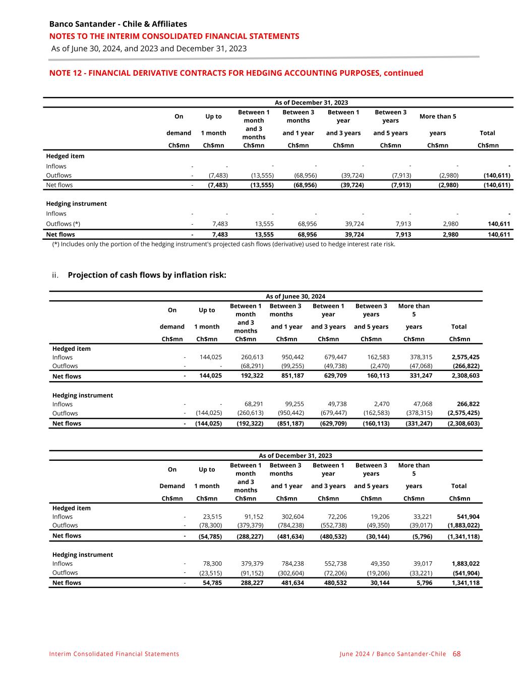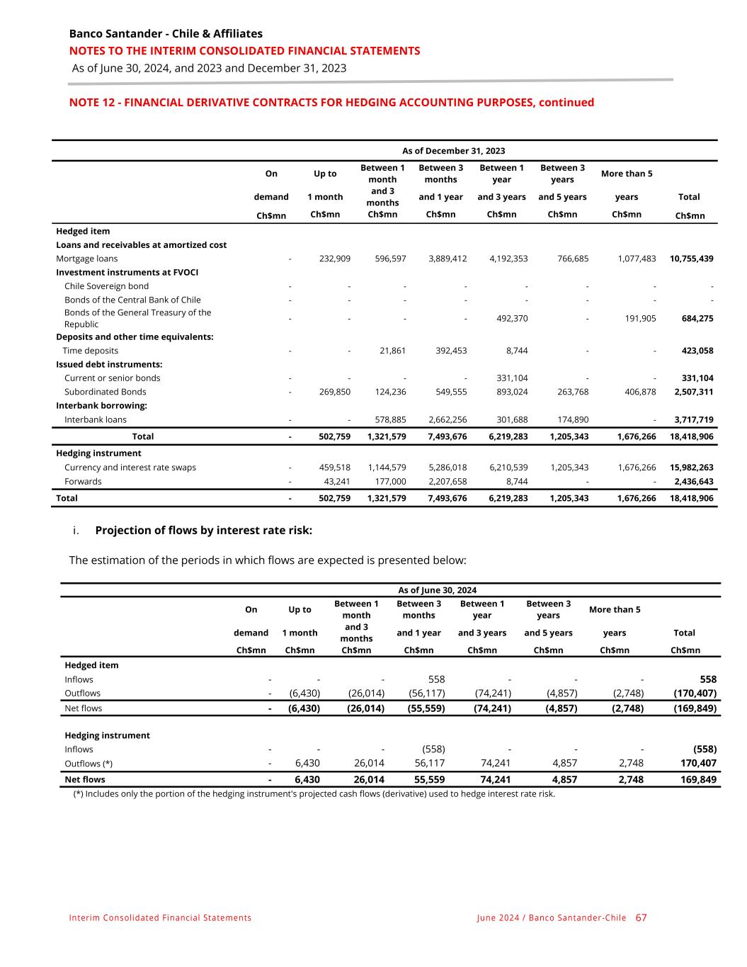 Banco Santander - Chile & Affiliates NOTES TO THE INTERIM CONSOLIDATED FINANCIAL STATEMENTS As of June 30, 2024, and 2023 and December 31, 2023 Interim Consolidated Financial Statements June 2024 / Banco Santander -Chile 67 NOTE 12 - FINANCIAL DERIVATIVE CONTRACTS FOR HEDGING ACCOUNTING PURPOSES, continued As of December 31, 2023 On Up to Between 1 month Between 3 months Between 1 year Between 3 years More than 5 demand 1 month and 3 months and 1 year and 3 years and 5 years years Total Ch$mn Ch$mn Ch$mn Ch$mn Ch$mn Ch$mn Ch$mn Ch$mn Hedged item Loans and receivables at amortized cost Mortgage loans - 232,909 596,597 3,889,412 4,192,353 766,685 1,077,483 10,755,439 Investment instruments at FVOCI Chile Sovereign bond - - - - - - - - Bonds of the Central Bank of Chile - - - - - - - - Bonds of the General Treasury of the Republic - - - - 492,370 - 191,905 684,275 Deposits and other time equivalents: Time deposits - - 21,861 392,453 8,744 - - 423,058 Issued debt instruments: Current or senior bonds - - - - 331,104 - - 331,104 Subordinated Bonds - 269,850 124,236 549,555 893,024 263,768 406,878 2,507,311 Interbank borrowing: Interbank loans - - 578,885 2,662,256 301,688 174,890 - 3,717,719 Total - 502,759 1,321,579 7,493,676 6,219,283 1,205,343 1,676,266 18,418,906 Hedging instrument Currency and interest rate swaps - 459,518 1,144,579 5,286,018 6,210,539 1,205,343 1,676,266 15,982,263 Forwards - 43,241 177,000 2,207,658 8,744 - - 2,436,643 Total - 502,759 1,321,579 7,493,676 6,219,283 1,205,343 1,676,266 18,418,906 i. Projection of flows by interest rate risk: The estimation of the periods in which flows are expected is presented below: As of June 30, 2024 On Up to Between 1 month Between 3 months Between 1 year Between 3 years More than 5 demand 1 month and 3 months and 1 year and 3 years and 5 years years Total Ch$mn Ch$mn Ch$mn Ch$mn Ch$mn Ch$mn Ch$mn Ch$mn Hedged item Inflows - - - 558 - - - 558 Outflows - (6,430) (26,014) (56,117) (74,241) (4,857) (2,748) (170,407) Net flows - (6,430) (26,014) (55,559) (74,241) (4,857) (2,748) (169,849) Hedging instrument Inflows - - - (558) - - - (558) Outflows (*) - 6,430 26,014 56,117 74,241 4,857 2,748 170,407 Net flows - 6,430 26,014 55,559 74,241 4,857 2,748 169,849 (*) Includes only the portion of the hedging instrument's projected cash flows (derivative) used to hedge interest rate risk.