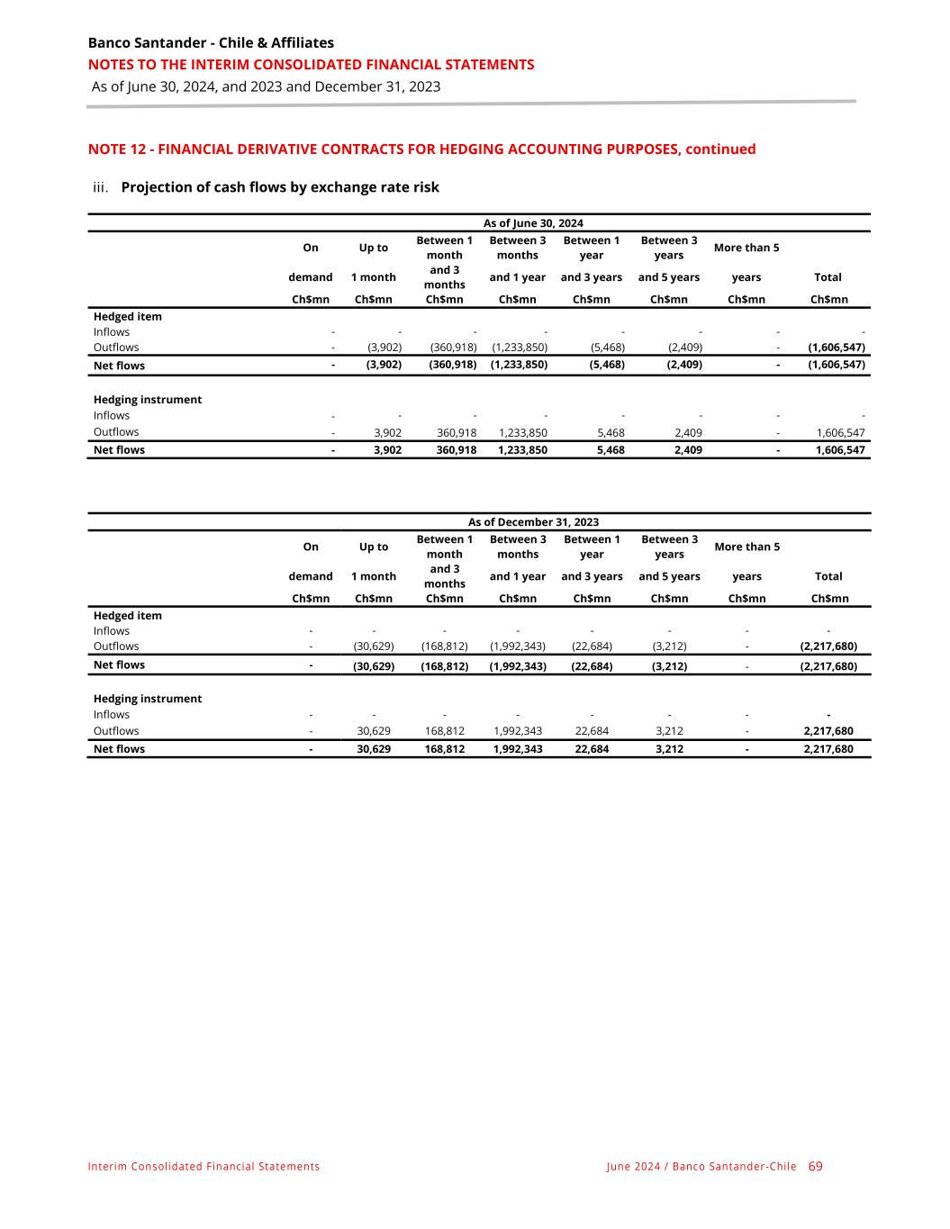 Banco Santander - Chile & Affiliates NOTES TO THE INTERIM CONSOLIDATED FINANCIAL STATEMENTS As of June 30, 2024, and 2023 and December 31, 2023 Interim Consolidated Financial Statements June 2024 / Banco Santander -Chile 69 NOTE 12 - FINANCIAL DERIVATIVE CONTRACTS FOR HEDGING ACCOUNTING PURPOSES, continued iii. Projection of cash flows by exchange rate risk As of June 30, 2024 On Up to Between 1 month Between 3 months Between 1 year Between 3 years More than 5 demand 1 month and 3 months and 1 year and 3 years and 5 years years Total Ch$mn Ch$mn Ch$mn Ch$mn Ch$mn Ch$mn Ch$mn Ch$mn Hedged item Inflows - - - - - - - - Outflows - (3,902) (360,918) (1,233,850) (5,468) (2,409) - (1,606,547) Net flows - (3,902) (360,918) (1,233,850) (5,468) (2,409) - (1,606,547) Hedging instrument Inflows - - - - - - - - Outflows - 3,902 360,918 1,233,850 5,468 2,409 - 1,606,547 Net flows - 3,902 360,918 1,233,850 5,468 2,409 - 1,606,547 As of December 31, 2023 On Up to Between 1 month Between 3 months Between 1 year Between 3 years More than 5 demand 1 month and 3 months and 1 year and 3 years and 5 years years Total Ch$mn Ch$mn Ch$mn Ch$mn Ch$mn Ch$mn Ch$mn Ch$mn Hedged item Inflows - - - - - - - - Outflows - (30,629) (168,812) (1,992,343) (22,684) (3,212) - (2,217,680) Net flows - (30,629) (168,812) (1,992,343) (22,684) (3,212) - (2,217,680) Hedging instrument Inflows - - - - - - - - Outflows - 30,629 168,812 1,992,343 22,684 3,212 - 2,217,680 Net flows - 30,629 168,812 1,992,343 22,684 3,212 - 2,217,680