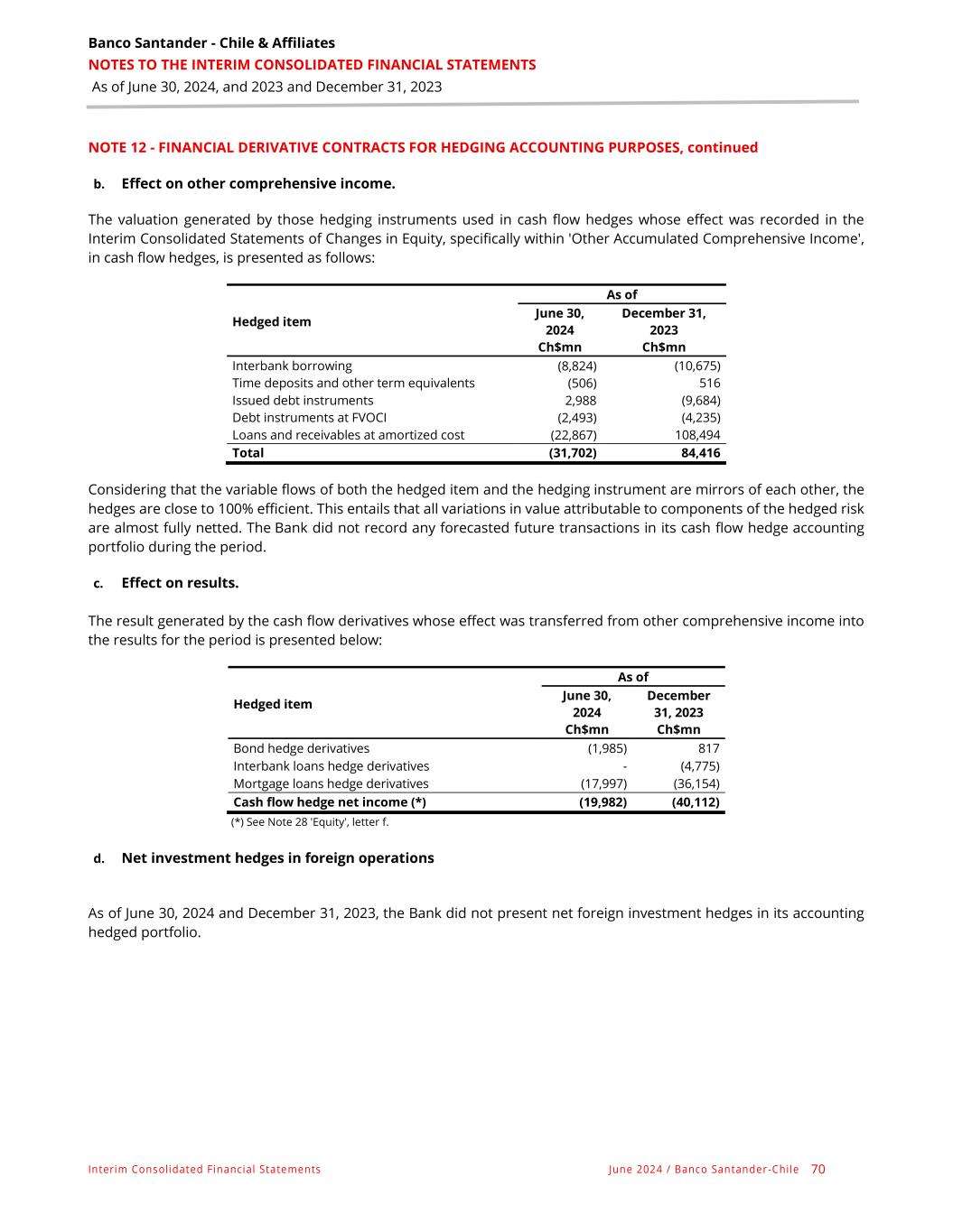 Banco Santander - Chile & Affiliates NOTES TO THE INTERIM CONSOLIDATED FINANCIAL STATEMENTS As of June 30, 2024, and 2023 and December 31, 2023 Interim Consolidated Financial Statements June 2024 / Banco Santander -Chile 70 NOTE 12 - FINANCIAL DERIVATIVE CONTRACTS FOR HEDGING ACCOUNTING PURPOSES, continued b. Effect on other comprehensive income. The valuation generated by those hedging instruments used in cash flow hedges whose effect was recorded in the Interim Consolidated Statements of Changes in Equity, specifically within 'Other Accumulated Comprehensive Income', in cash flow hedges, is presented as follows: As of Hedged item June 30, 2024 December 31, 2023 Ch$mn Ch$mn Interbank borrowing (8,824) (10,675) Time deposits and other term equivalents (506) 516 Issued debt instruments 2,988 (9,684) Debt instruments at FVOCI (2,493) (4,235) Loans and receivables at amortized cost (22,867) 108,494 Total (31,702) 84,416 Considering that the variable flows of both the hedged item and the hedging instrument are mirrors of each other, the hedges are close to 100% efficient. This entails that all variations in value attributable to components of the hedged risk are almost fully netted. The Bank did not record any forecasted future transactions in its cash flow hedge accounting portfolio during the period. c. Effect on results. The result generated by the cash flow derivatives whose effect was transferred from other comprehensive income into the results for the period is presented below: As of Hedged item June 30, 2024 December 31, 2023 Ch$mn Ch$mn Bond hedge derivatives (1,985) 817 Interbank loans hedge derivatives - (4,775) Mortgage loans hedge derivatives (17,997) (36,154) Cash flow hedge net income (*) (19,982) (40,112) (*) See Note 28 'Equity', letter f. d. Net investment hedges in foreign operations As of June 30, 2024 and December 31, 2023, the Bank did not present net foreign investment hedges in its accounting hedged portfolio.