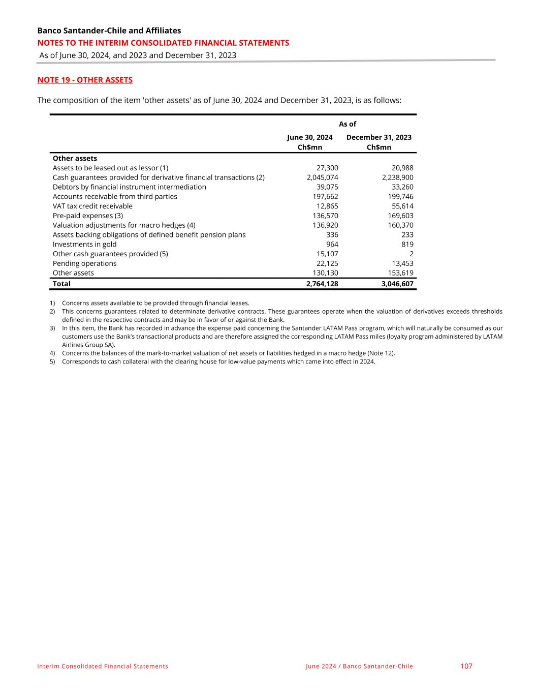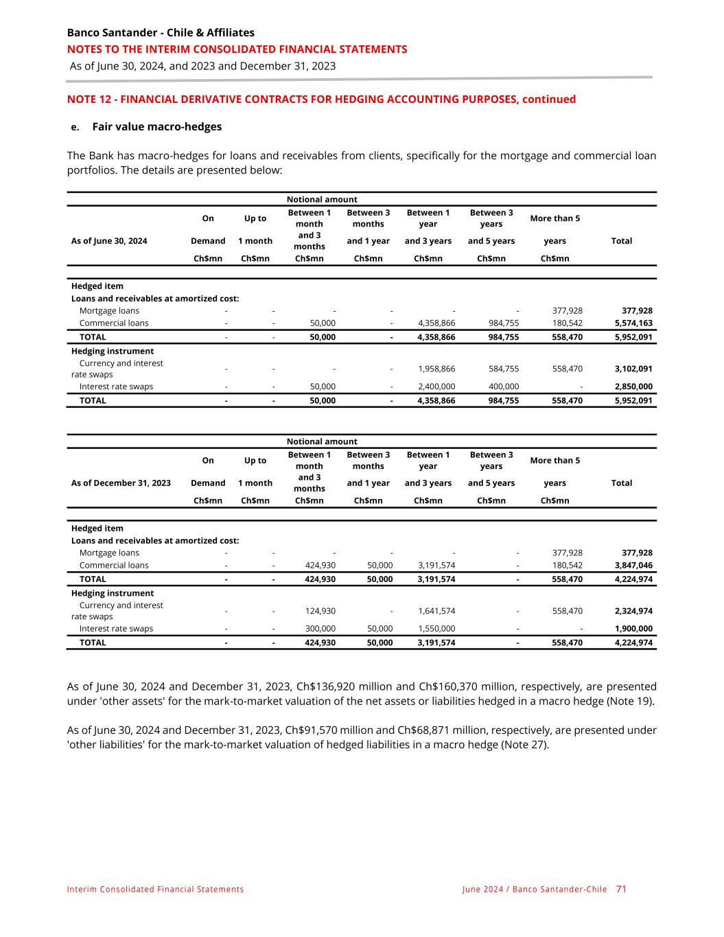 Banco Santander - Chile & Affiliates NOTES TO THE INTERIM CONSOLIDATED FINANCIAL STATEMENTS As of June 30, 2024, and 2023 and December 31, 2023 Interim Consolidated Financial Statements June 2024 / Banco Santander -Chile 71 NOTE 12 - FINANCIAL DERIVATIVE CONTRACTS FOR HEDGING ACCOUNTING PURPOSES, continued e. Fair value macro-hedges The Bank has macro-hedges for loans and receivables from clients, specifically for the mortgage and commercial loan portfolios. The details are presented below: Notional amount On Up to Between 1 month Between 3 months Between 1 year Between 3 years More than 5 As of June 30, 2024 Demand 1 month and 3 months and 1 year and 3 years and 5 years years Total Ch$mn Ch$mn Ch$mn Ch$mn Ch$mn Ch$mn Ch$mn Hedged item Loans and receivables at amortized cost: Mortgage loans - - - - - - 377,928 377,928 Commercial loans - - 50,000 - 4,358,866 984,755 180,542 5,574,163 TOTAL - - 50,000 - 4,358,866 984,755 558,470 5,952,091 Hedging instrument Currency and interest rate swaps - - - - 1,958,866 584,755 558,470 3,102,091 Interest rate swaps - - 50,000 - 2,400,000 400,000 - 2,850,000 TOTAL - - 50,000 - 4,358,866 984,755 558,470 5,952,091 Notional amount On Up to Between 1 month Between 3 months Between 1 year Between 3 years More than 5 As of December 31, 2023 Demand 1 month and 3 months and 1 year and 3 years and 5 years years Total Ch$mn Ch$mn Ch$mn Ch$mn Ch$mn Ch$mn Ch$mn Hedged item Loans and receivables at amortized cost: Mortgage loans - - - - - - 377,928 377,928 Commercial loans - - 424,930 50,000 3,191,574 - 180,542 3,847,046 TOTAL - - 424,930 50,000 3,191,574 - 558,470 4,224,974 Hedging instrument Currency and interest rate swaps - - 124,930 - 1,641,574 - 558,470 2,324,974 Interest rate swaps - - 300,000 50,000 1,550,000 - - 1,900,000 TOTAL - - 424,930 50,000 3,191,574 - 558,470 4,224,974 As of June 30, 2024 and December 31, 2023, Ch$136,920 million and Ch$160,370 million, respectively, are presented under 'other assets' for the mark-to-market valuation of the net assets or liabilities hedged in a macro hedge (Note 19). As of June 30, 2024 and December 31, 2023, Ch$91,570 million and Ch$68,871 million, respectively, are presented under 'other liabilities' for the mark-to-market valuation of hedged liabilities in a macro hedge (Note 27).