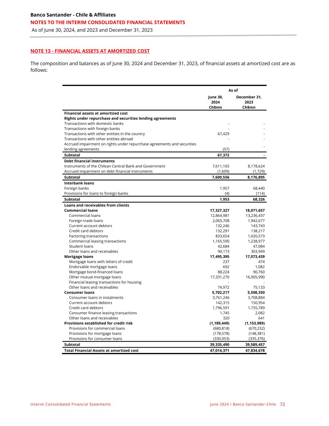 Banco Santander - Chile & Affiliates NOTES TO THE INTERIM CONSOLIDATED FINANCIAL STATEMENTS As of June 30, 2024, and 2023 and December 31, 2023 Interim Consolidated Financial Statements June 2024 / Banco Santander -Chile 72 NOTE 13 - FINANCIAL ASSETS AT AMORTIZED COST The composition and balances as of June 30, 2024 and December 31, 2023, of financial assets at amortized cost are as follows: As of June 30, 2024 December 31, 2023 Ch$mn Ch$mn Financial assets at amortized cost Rights under repurchase and securities lending agreements Transactions with domestic banks - - Transactions with foreign banks - - Transactions with other entities in the country 67,429 - Transactions with other entities abroad - - Accrued impairment on rights under repurchase agreements and securities lending agreements (57) - Subtotal 67,372 - Debt financial instruments Instruments of the Chilean Central Bank and Government 7,611,165 8,178,624 Accrued impairment on debt financial instruments (1,609) (1,729) Subtotal 7,609,556 8,176,895 Interbank loans Foreign banks 1,957 68,440 Provisions for loans to foreign banks (4) (114) Subtotal 1,953 68,326 Loans and receivables from clients Commercial loans 17,327,327 18,071,657 Commercial loans 12,864,981 13,236,437 Foreign trade loans 2,065,708 1,942,677 Current account debtors 132,246 143,743 Credit card debtors 132,291 138,217 Factoring transactions 833,654 1,020,573 Commercial leasing transactions 1,165,590 1,238,977 Student loans 42,684 47,084 Other loans and receivables 90,173 303,949 Mortgage loans 17,495,395 17,073,439 Mortgage loans with letters of credit 237 474 Endorsable mortgage loans 692 1,082 Mortgage bond-financed loans 88,224 90,760 Other mutual mortgage loans 17,331,270 16,905,990 Financial leasing transactions for housing - - Other loans and receivables 74,972 75,133 Consumer loans 5,702,217 5,598,350 Consumer loans in instalments 3,761,246 3,708,884 Current account debtors 142,315 150,954 Credit card debtors 1,796,591 1,735,789 Consumer finance leasing transactions 1,745 2,082 Other loans and receivables 320 641 Provisions established for credit risk (1,189,449) (1,153,989) Provisions for commercial loans (680,818) (670,232) Provisions for mortgage loans (178,578) (148,381) Provisions for consumer loans (330,053) (335,376) Subtotal 39,335,490 39,589,457 Total Financial Assets at amortized cost 47,014,371 47,834,678