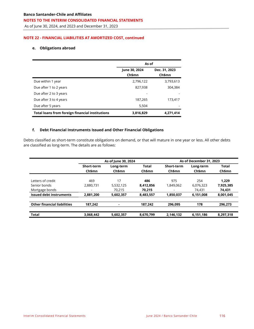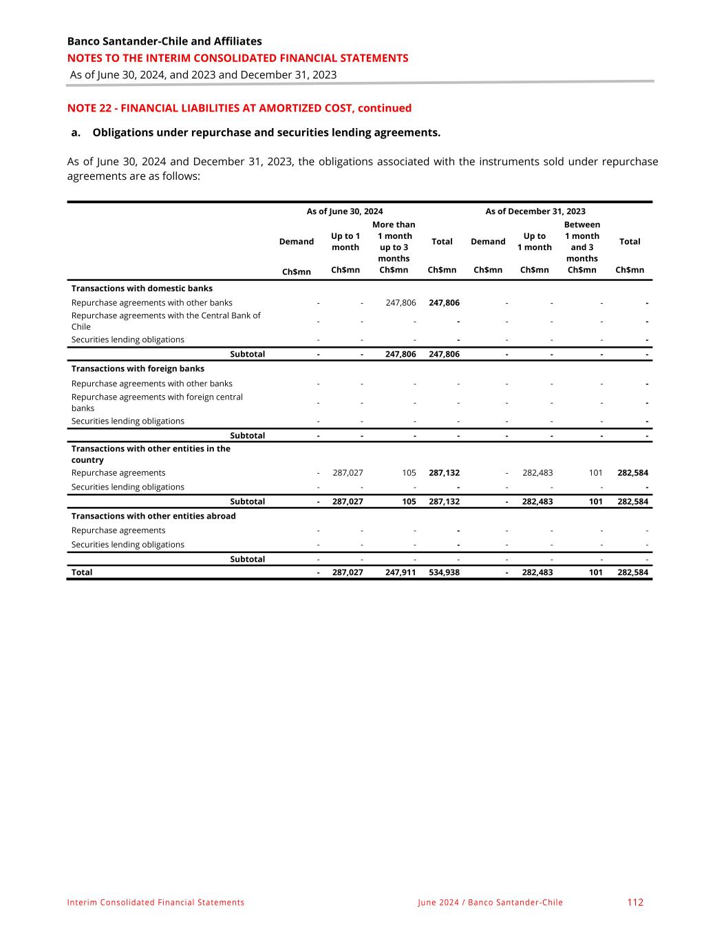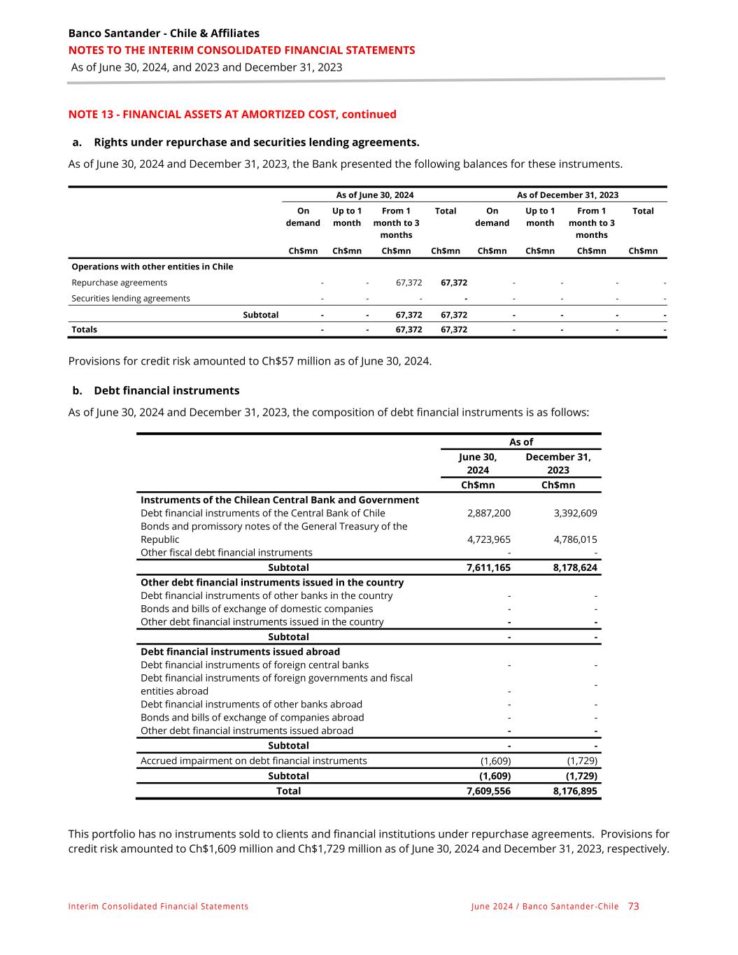 Banco Santander - Chile & Affiliates NOTES TO THE INTERIM CONSOLIDATED FINANCIAL STATEMENTS As of June 30, 2024, and 2023 and December 31, 2023 Interim Consolidated Financial Statements June 2024 / Banco Santander -Chile 73 NOTE 13 - FINANCIAL ASSETS AT AMORTIZED COST, continued a. Rights under repurchase and securities lending agreements. As of June 30, 2024 and December 31, 2023, the Bank presented the following balances for these instruments. As of June 30, 2024 As of December 31, 2023 On demand Up to 1 month From 1 month to 3 months Total On demand Up to 1 month From 1 month to 3 months Total Ch$mn Ch$mn Ch$mn Ch$mn Ch$mn Ch$mn Ch$mn Ch$mn Operations with other entities in Chile Repurchase agreements - - 67,372 67,372 - - - - Securities lending agreements - - - - - - - - Subtotal - - 67,372 67,372 - - - - Totals - - 67,372 67,372 - - - - Provisions for credit risk amounted to Ch$57 million as of June 30, 2024. b. Debt financial instruments As of June 30, 2024 and December 31, 2023, the composition of debt financial instruments is as follows: As of June 30, 2024 December 31, 2023 Ch$mn Ch$mn Instruments of the Chilean Central Bank and Government Debt financial instruments of the Central Bank of Chile 2,887,200 3,392,609 Bonds and promissory notes of the General Treasury of the Republic 4,723,965 4,786,015 Other fiscal debt financial instruments - - Subtotal 7,611,165 8,178,624 Other debt financial instruments issued in the country Debt financial instruments of other banks in the country - - Bonds and bills of exchange of domestic companies - - Other debt financial instruments issued in the country - - Subtotal - - Debt financial instruments issued abroad Debt financial instruments of foreign central banks - - Debt financial instruments of foreign governments and fiscal entities abroad - - Debt financial instruments of other banks abroad - - Bonds and bills of exchange of companies abroad - - Other debt financial instruments issued abroad - - Subtotal - - Accrued impairment on debt financial instruments (1,609) (1,729) Subtotal (1,609) (1,729) Total 7,609,556 8,176,895 This portfolio has no instruments sold to clients and financial institutions under repurchase agreements. Provisions for credit risk amounted to Ch$1,609 million and Ch$1,729 million as of June 30, 2024 and December 31, 2023, respectively.