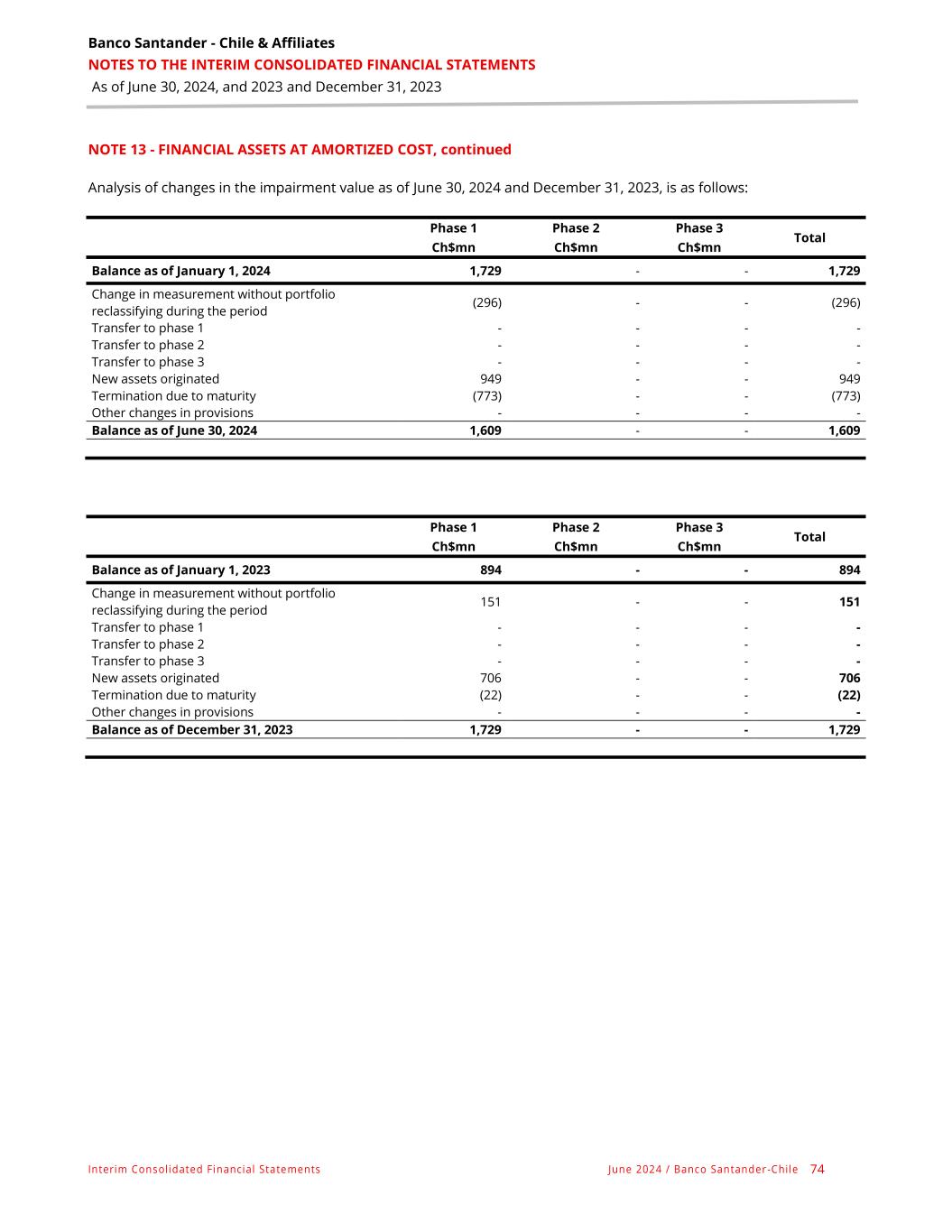 Banco Santander - Chile & Affiliates NOTES TO THE INTERIM CONSOLIDATED FINANCIAL STATEMENTS As of June 30, 2024, and 2023 and December 31, 2023 Interim Consolidated Financial Statements June 2024 / Banco Santander -Chile 74 NOTE 13 - FINANCIAL ASSETS AT AMORTIZED COST, continued Analysis of changes in the impairment value as of June 30, 2024 and December 31, 2023, is as follows: Phase 1 Phase 2 Phase 3 Total Ch$mn Ch$mn Ch$mn Balance as of January 1, 2024 1,729 - - 1,729 Change in measurement without portfolio reclassifying during the period (296) - - (296) Transfer to phase 1 - - - - Transfer to phase 2 - - - - Transfer to phase 3 - - - - New assets originated 949 - - 949 Termination due to maturity (773) - - (773) Other changes in provisions - - - - Balance as of June 30, 2024 1,609 - - 1,609 Phase 1 Phase 2 Phase 3 Total Ch$mn Ch$mn Ch$mn Balance as of January 1, 2023 894 - - 894 Change in measurement without portfolio reclassifying during the period 151 - - 151 Transfer to phase 1 - - - - Transfer to phase 2 - - - - Transfer to phase 3 - - - - New assets originated 706 - - 706 Termination due to maturity (22) - - (22) Other changes in provisions - - - - Balance as of December 31, 2023 1,729 - - 1,729