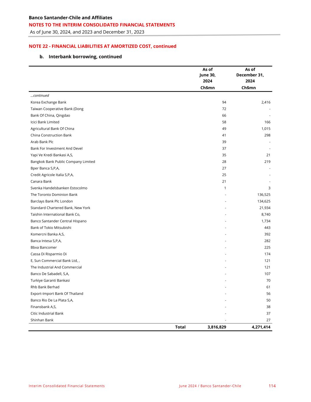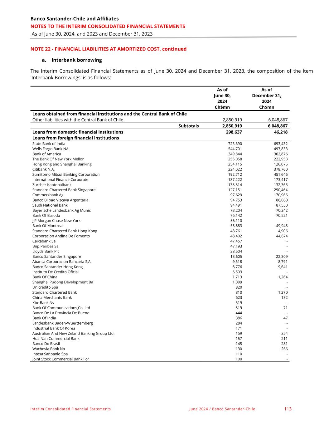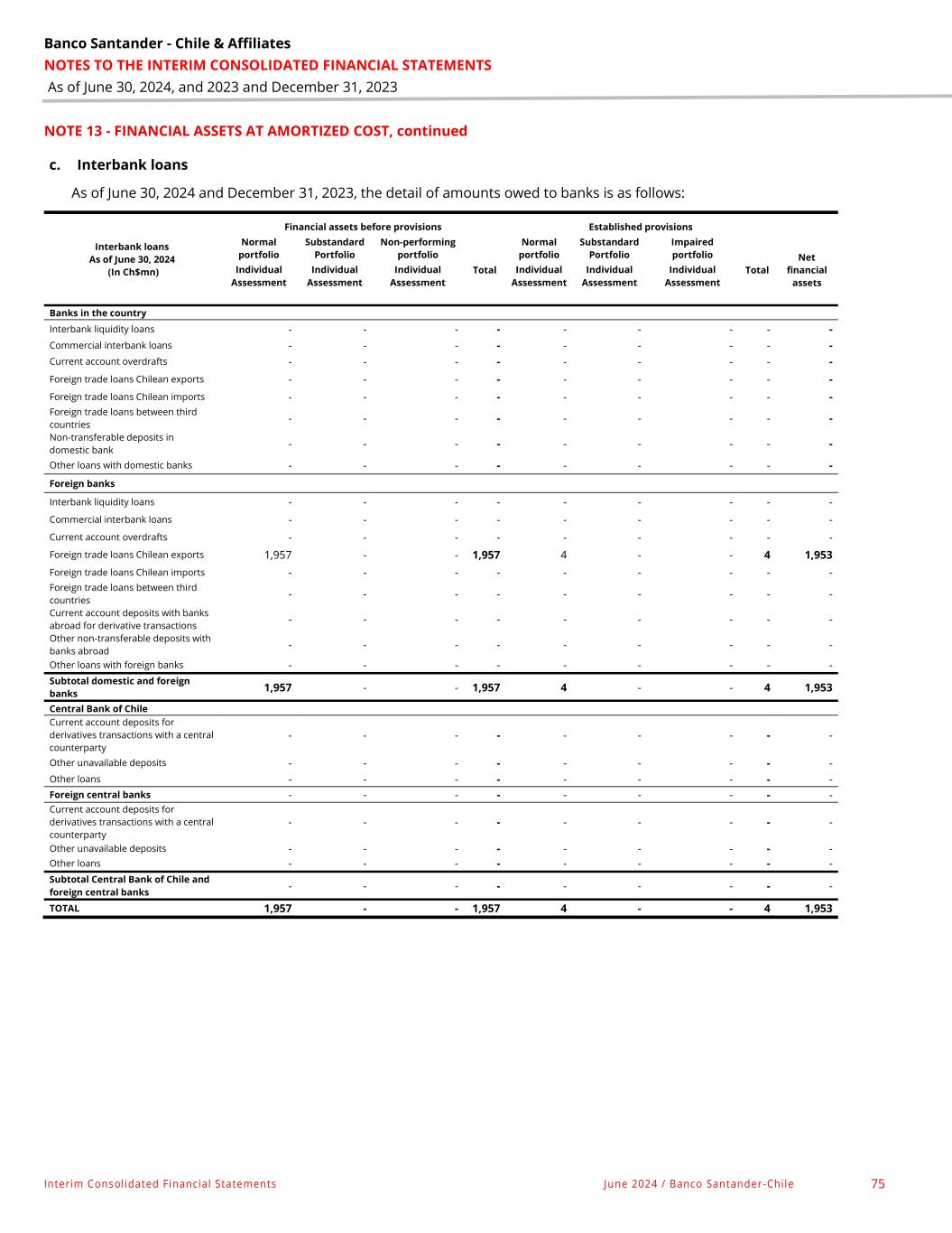 Banco Santander - Chile & Affiliates NOTES TO THE INTERIM CONSOLIDATED FINANCIAL STATEMENTS As of June 30, 2024, and 2023 and December 31, 2023 Interim Consolidated Financial Statements June 2024 / Banco Santander -Chile 75 NOTE 13 - FINANCIAL ASSETS AT AMORTIZED COST, continued c. Interbank loans As of June 30, 2024 and December 31, 2023, the detail of amounts owed to banks is as follows: Interbank loans As of June 30, 2024 (In Ch$mn) Financial assets before provisions Established provisions Normal portfolio Substandard Portfolio Non-performing portfolio Total Normal portfolio Substandard Portfolio Impaired portfolio Total Net financial assets Individual Assessment Individual Assessment Individual Assessment Individual Assessment Individual Assessment Individual Assessment Banks in the country Interbank liquidity loans - - - - - - - - - Commercial interbank loans - - - - - - - - - Current account overdrafts - - - - - - - - - Foreign trade loans Chilean exports - - - - - - - - - Foreign trade loans Chilean imports - - - - - - - - - Foreign trade loans between third countries - - - - - - - - - Non-transferable deposits in domestic bank - - - - - - - - - Other loans with domestic banks - - - - - - - - - Foreign banks Interbank liquidity loans - - - - - - - - - Commercial interbank loans - - - - - - - - - Current account overdrafts - - - - - - - - - Foreign trade loans Chilean exports 1,957 - - 1,957 4 - - 4 1,953 Foreign trade loans Chilean imports - - - - - - - - - Foreign trade loans between third countries - - - - - - - - - Current account deposits with banks abroad for derivative transactions - - - - - - - - - Other non-transferable deposits with banks abroad - - - - - - - - - Other loans with foreign banks - - - - - - - - - Subtotal domestic and foreign banks 1,957 - - 1,957 4 - - 4 1,953 Central Bank of Chile Current account deposits for derivatives transactions with a central counterparty - - - - - - - - - Other unavailable deposits - - - - - - - - - Other loans - - - - - - - - - Foreign central banks - - - - - - - - - Current account deposits for derivatives transactions with a central counterparty - - - - - - - - - Other unavailable deposits - - - - - - - - - Other loans - - - - - - - - - Subtotal Central Bank of Chile and foreign central banks - - - - - - - - - TOTAL 1,957 - - 1,957 4 - - 4 1,953