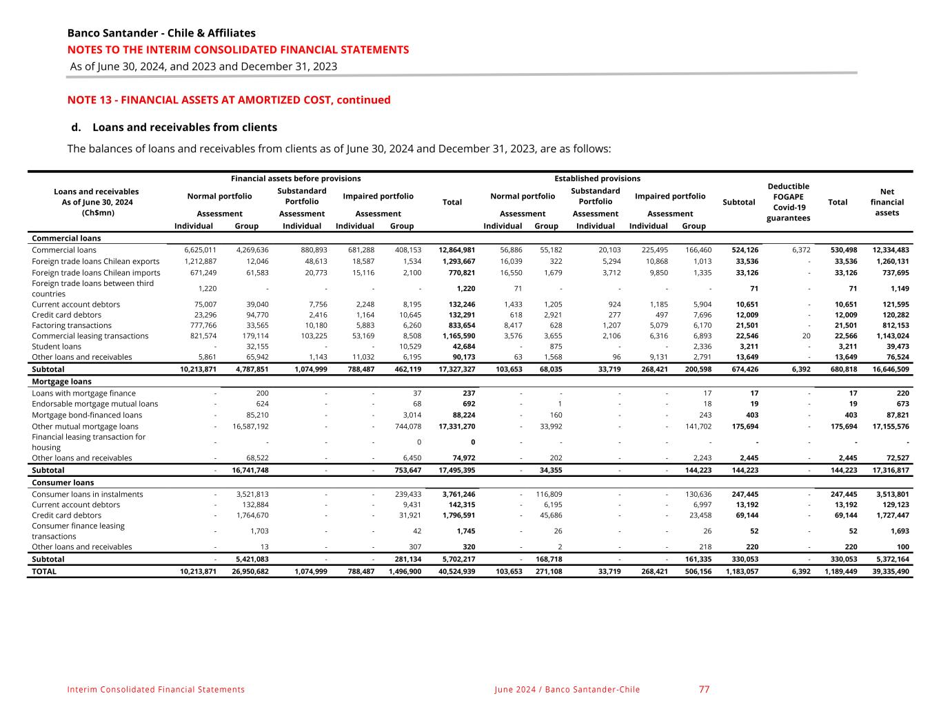 Banco Santander - Chile & Affiliates NOTES TO THE INTERIM CONSOLIDATED FINANCIAL STATEMENTS As of June 30, 2024, and 2023 and December 31, 2023 Interim Consolidated Financial Statements June 2024 / Banco Santander-Chile 77 NOTE 13 - FINANCIAL ASSETS AT AMORTIZED COST, continued d. Loans and receivables from clients The balances of loans and receivables from clients as of June 30, 2024 and December 31, 2023, are as follows: Loans and receivables As of June 30, 2024 (Ch$mn) Financial assets before provisions Total Established provisions Subtotal Deductible FOGAPE Covid-19 guarantees Total Net financial assets Normal portfolio Substandard Portfolio Impaired portfolio Normal portfolio Substandard Portfolio Impaired portfolio Assessment Assessment Assessment Assessment Assessment Assessment Individual Group Individual Individual Group Individual Group Individual Individual Group Commercial loans Commercial loans 6,625,011 4,269,636 880,893 681,288 408,153 12,864,981 56,886 55,182 20,103 225,495 166,460 524,126 6,372 530,498 12,334,483 Foreign trade loans Chilean exports 1,212,887 12,046 48,613 18,587 1,534 1,293,667 16,039 322 5,294 10,868 1,013 33,536 - 33,536 1,260,131 Foreign trade loans Chilean imports 671,249 61,583 20,773 15,116 2,100 770,821 16,550 1,679 3,712 9,850 1,335 33,126 - 33,126 737,695 Foreign trade loans between third countries 1,220 - - - - 1,220 71 - - - - 71 - 71 1,149 Current account debtors 75,007 39,040 7,756 2,248 8,195 132,246 1,433 1,205 924 1,185 5,904 10,651 - 10,651 121,595 Credit card debtors 23,296 94,770 2,416 1,164 10,645 132,291 618 2,921 277 497 7,696 12,009 - 12,009 120,282 Factoring transactions 777,766 33,565 10,180 5,883 6,260 833,654 8,417 628 1,207 5,079 6,170 21,501 - 21,501 812,153 Commercial leasing transactions 821,574 179,114 103,225 53,169 8,508 1,165,590 3,576 3,655 2,106 6,316 6,893 22,546 20 22,566 1,143,024 Student loans - 32,155 - - 10,529 42,684 - 875 - - 2,336 3,211 - 3,211 39,473 Other loans and receivables 5,861 65,942 1,143 11,032 6,195 90,173 63 1,568 96 9,131 2,791 13,649 - 13,649 76,524 Subtotal 10,213,871 4,787,851 1,074,999 788,487 462,119 17,327,327 103,653 68,035 33,719 268,421 200,598 674,426 6,392 680,818 16,646,509 Mortgage loans Loans with mortgage finance - 200 - - 37 237 - - - - 17 17 - 17 220 Endorsable mortgage mutual loans - 624 - - 68 692 - 1 - - 18 19 - 19 673 Mortgage bond-financed loans - 85,210 - - 3,014 88,224 - 160 - - 243 403 - 403 87,821 Other mutual mortgage loans - 16,587,192 - - 744,078 17,331,270 - 33,992 - - 141,702 175,694 - 175,694 17,155,576 Financial leasing transaction for housing - - - - 0 0 - - - - - - - - - Other loans and receivables - 68,522 - - 6,450 74,972 - 202 - - 2,243 2,445 - 2,445 72,527 Subtotal - 16,741,748 - - 753,647 17,495,395 - 34,355 - - 144,223 144,223 - 144,223 17,316,817 Consumer loans Consumer loans in instalments - 3,521,813 - - 239,433 3,761,246 - 116,809 - - 130,636 247,445 - 247,445 3,513,801 Current account debtors - 132,884 - - 9,431 142,315 - 6,195 - - 6,997 13,192 - 13,192 129,123 Credit card debtors - 1,764,670 - - 31,921 1,796,591 - 45,686 - - 23,458 69,144 - 69,144 1,727,447 Consumer finance leasing transactions - 1,703 - - 42 1,745 - 26 - - 26 52 - 52 1,693 Other loans and receivables - 13 - - 307 320 - 2 - - 218 220 - 220 100 Subtotal - 5,421,083 - - 281,134 5,702,217 - 168,718 - - 161,335 330,053 - 330,053 5,372,164 TOTAL 10,213,871 26,950,682 1,074,999 788,487 1,496,900 40,524,939 103,653 271,108 33,719 268,421 506,156 1,183,057 6,392 1,189,449 39,335,490